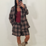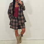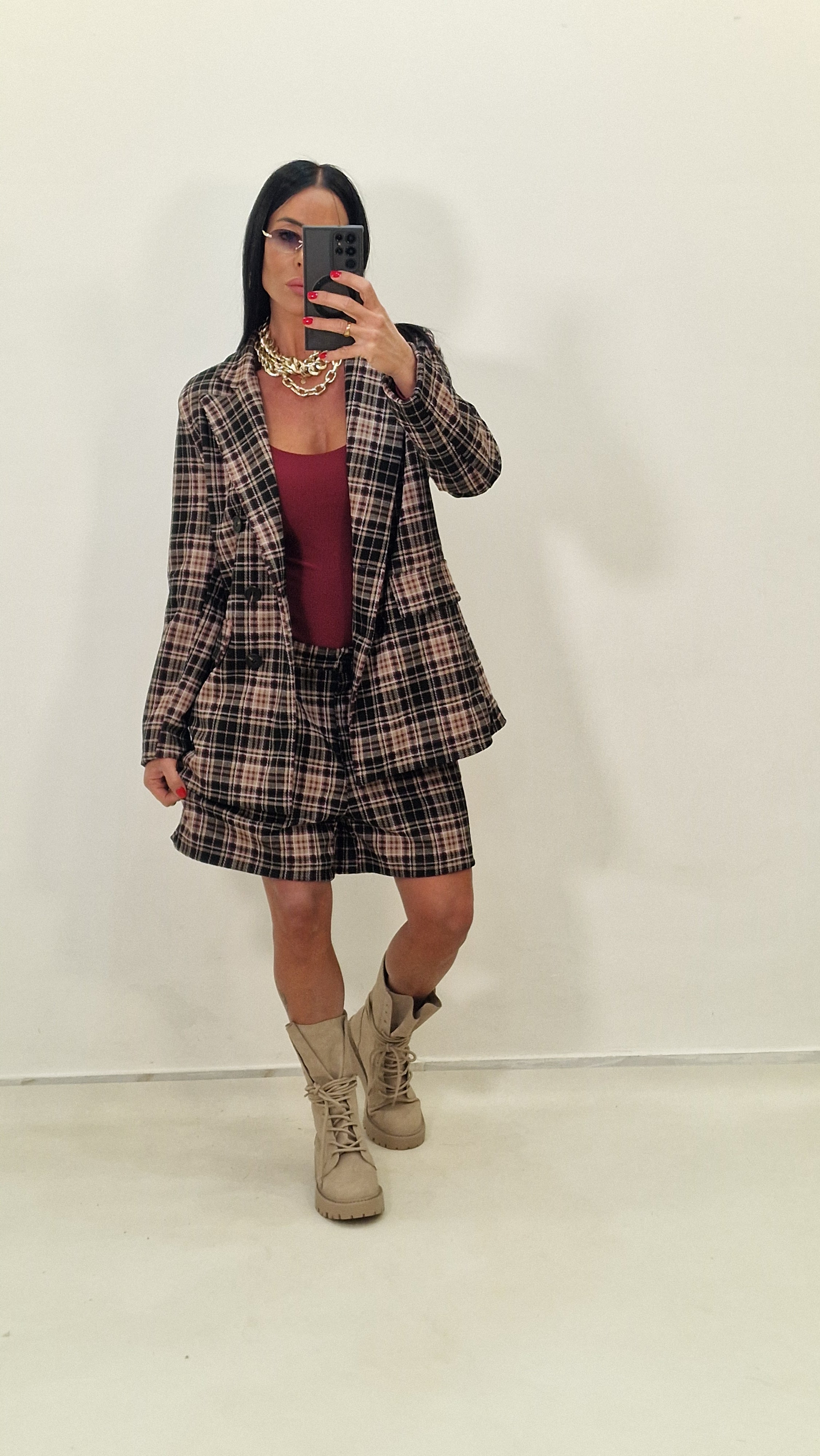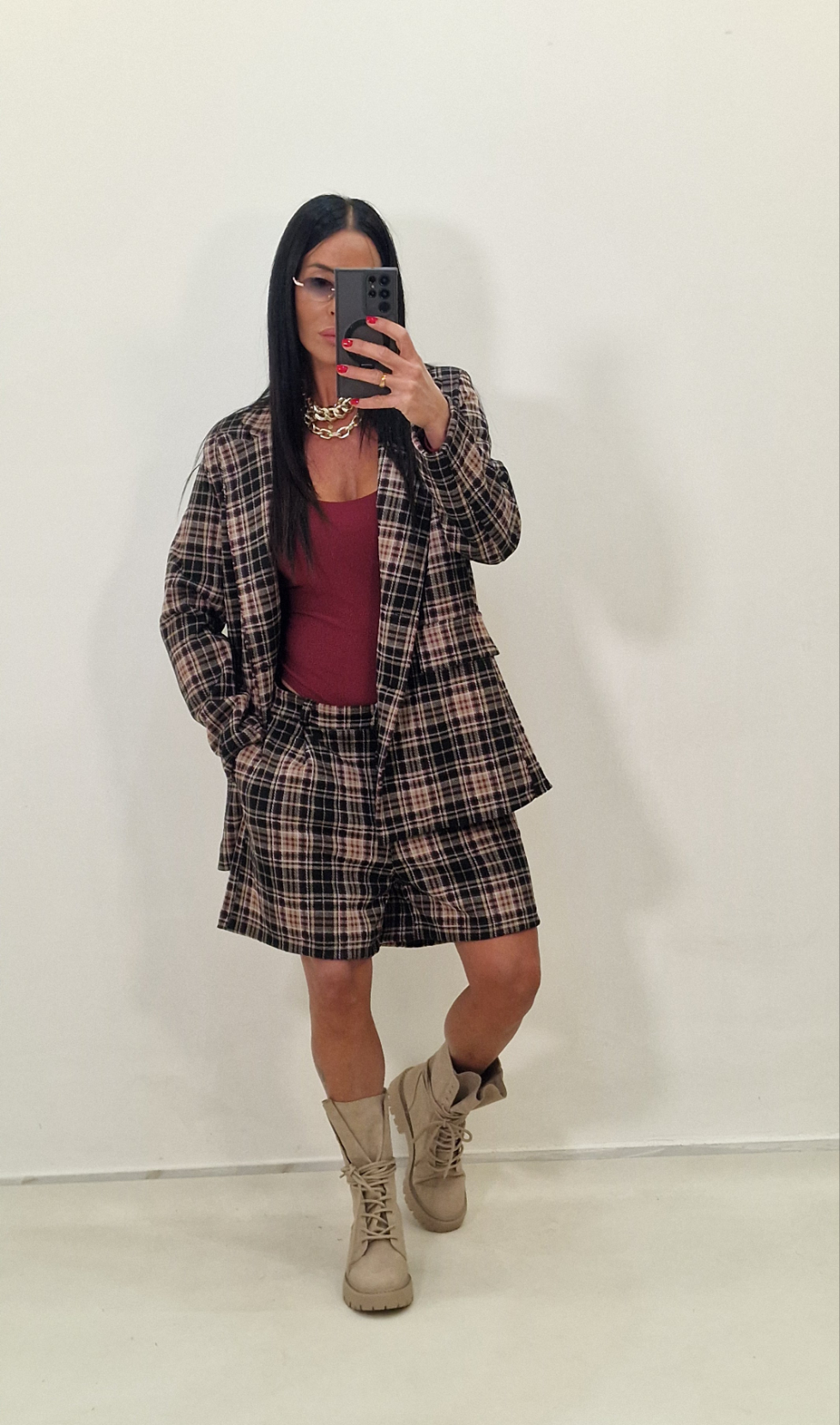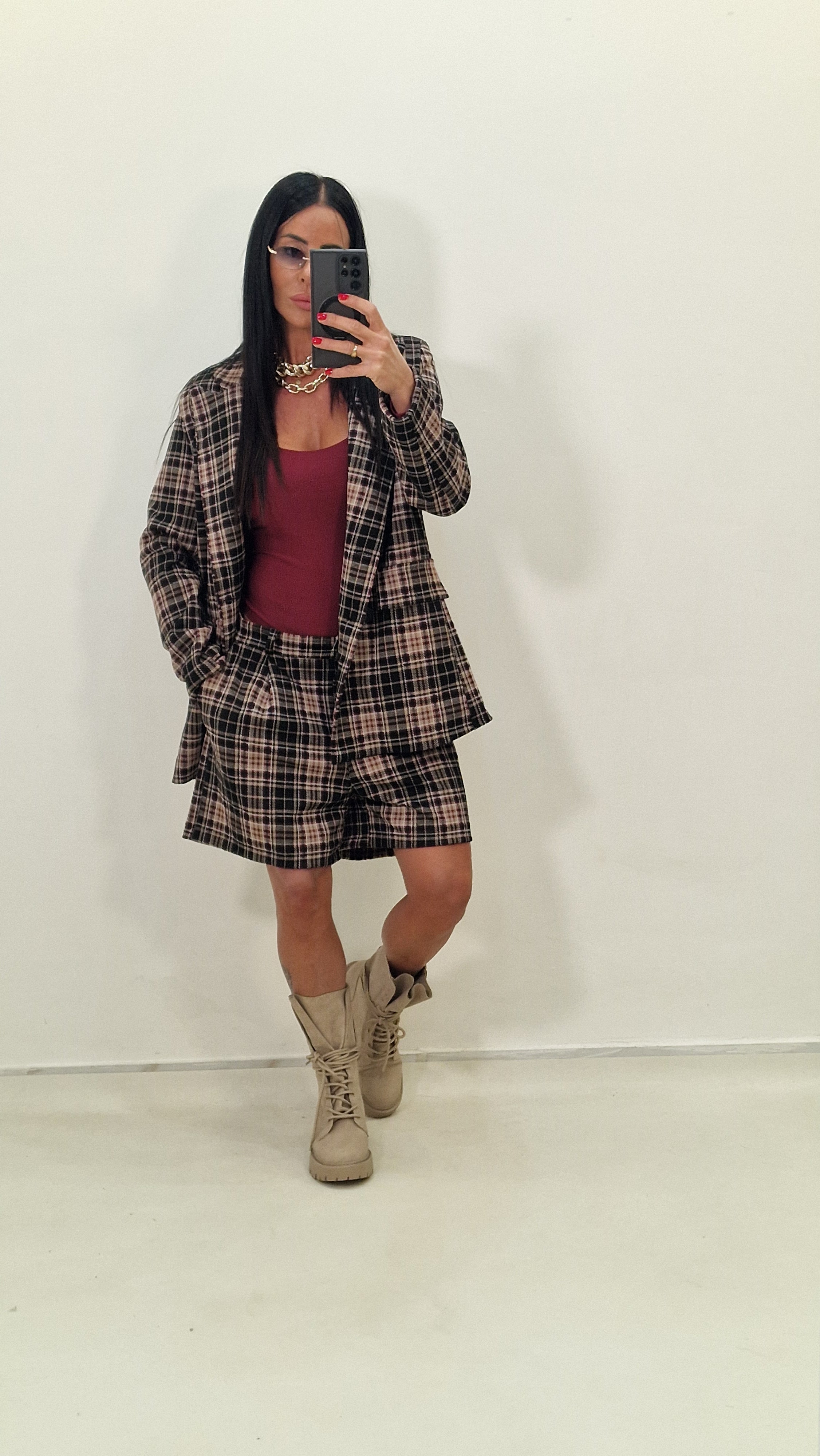 Coordinato giacca doppiopetto over , con pantaloncino con elastico e bottone.