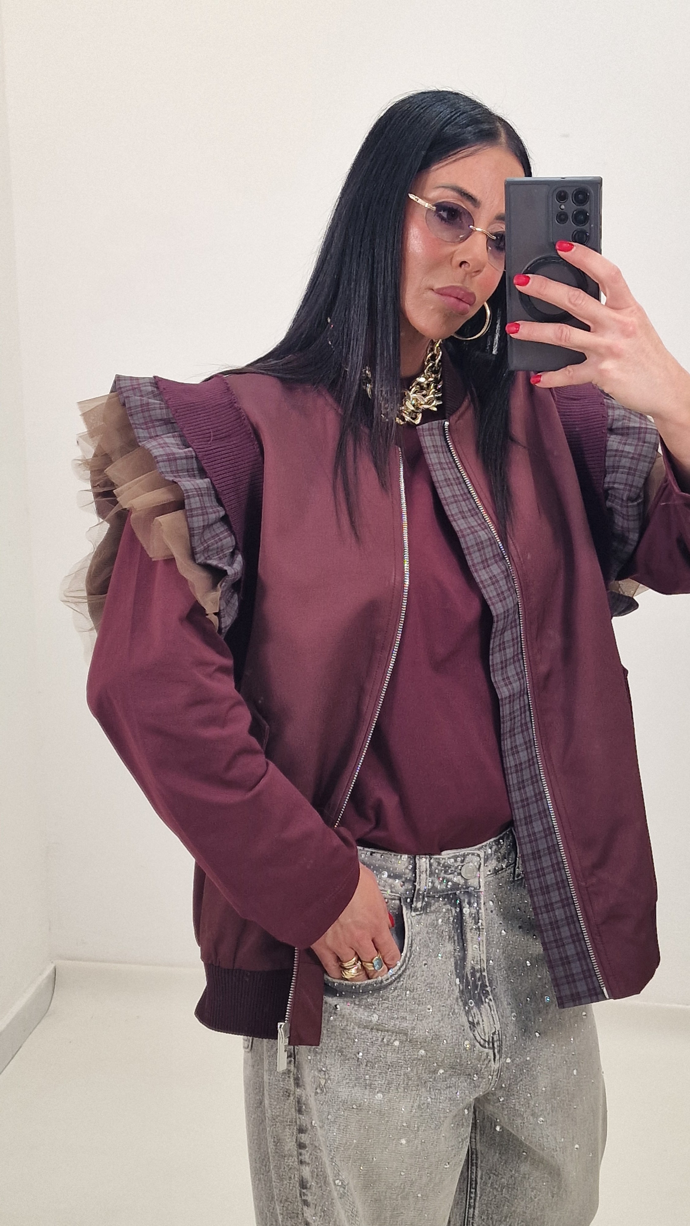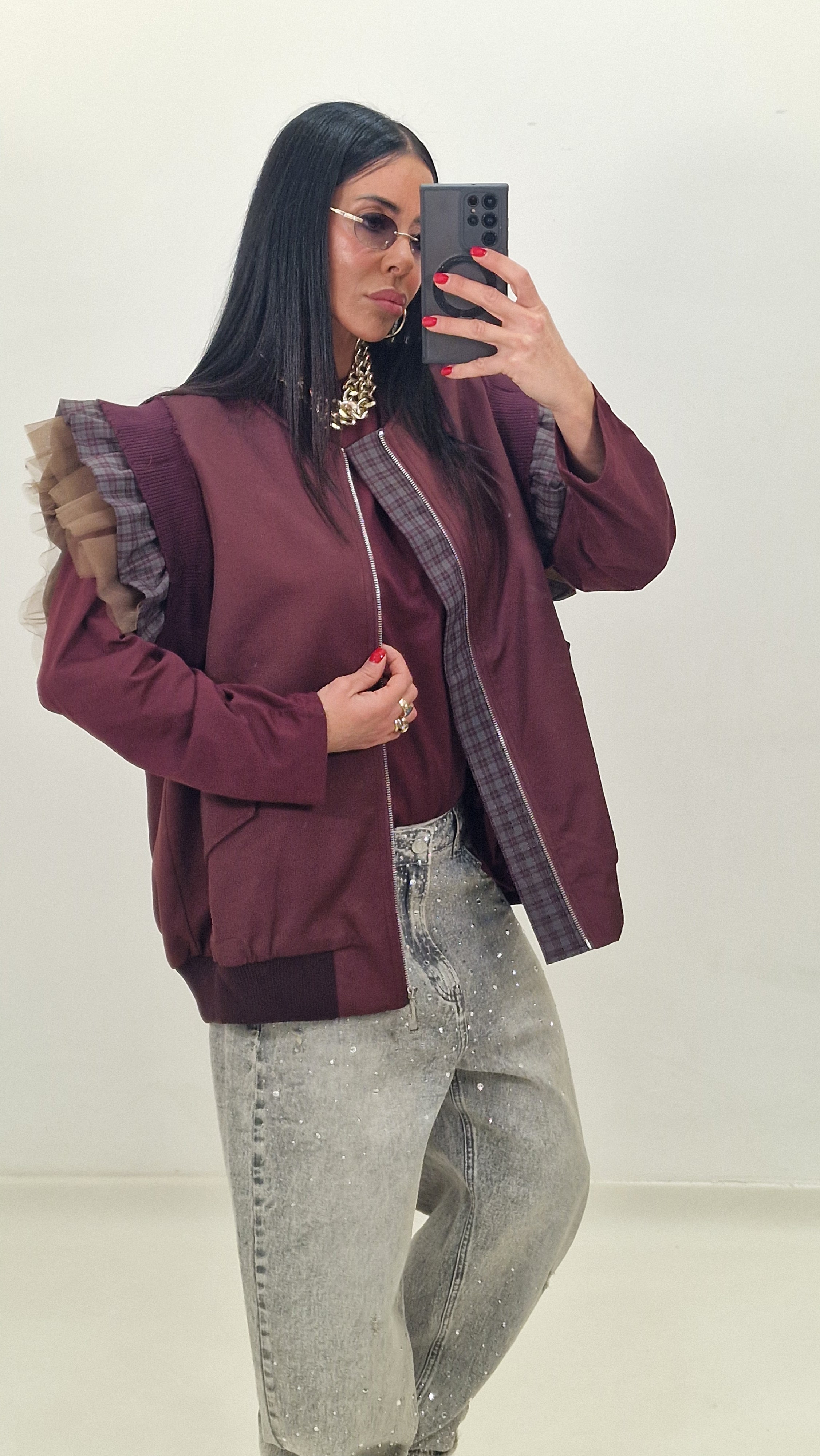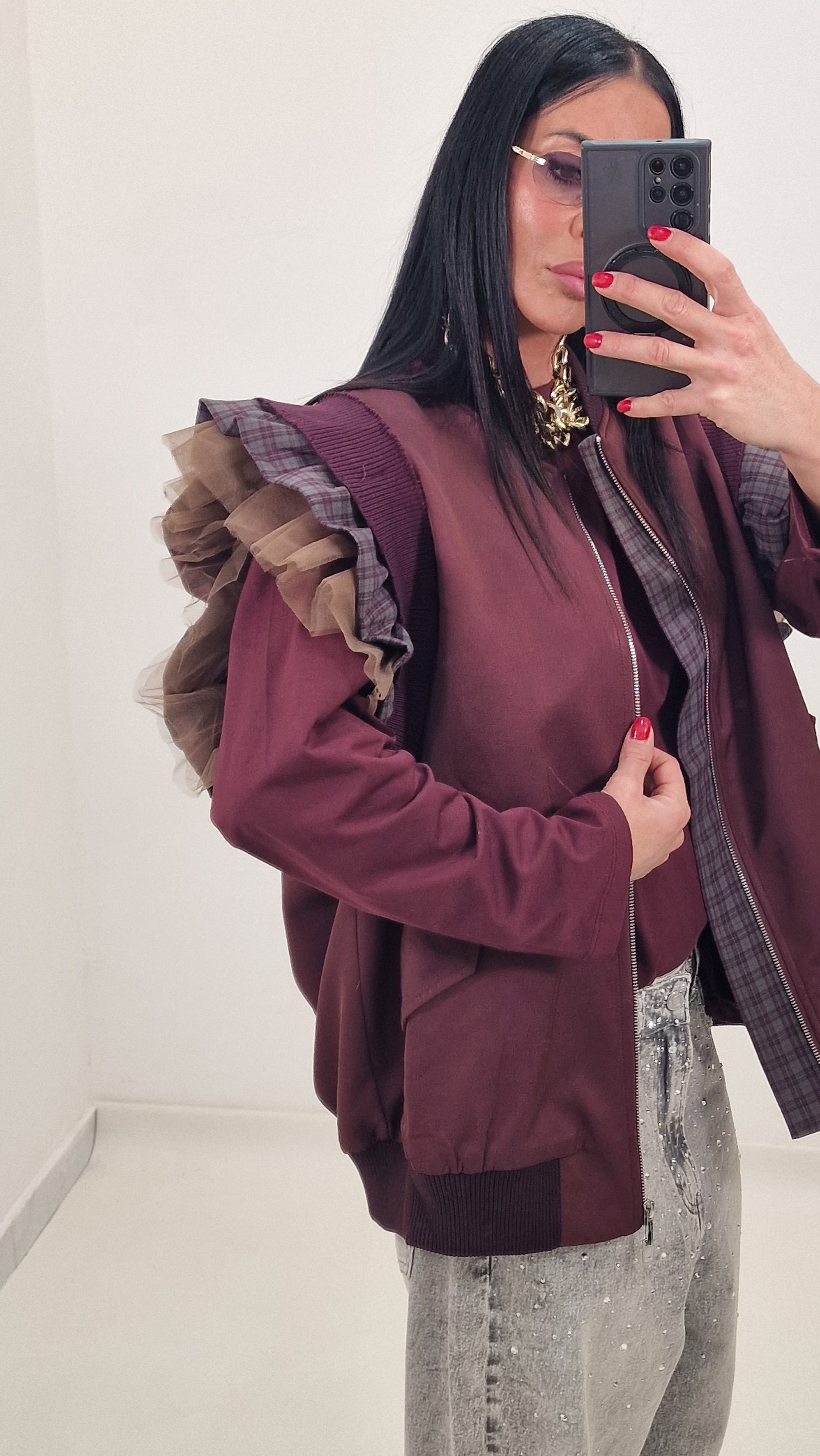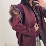 Zip-up vest with checked and tulle sleeves