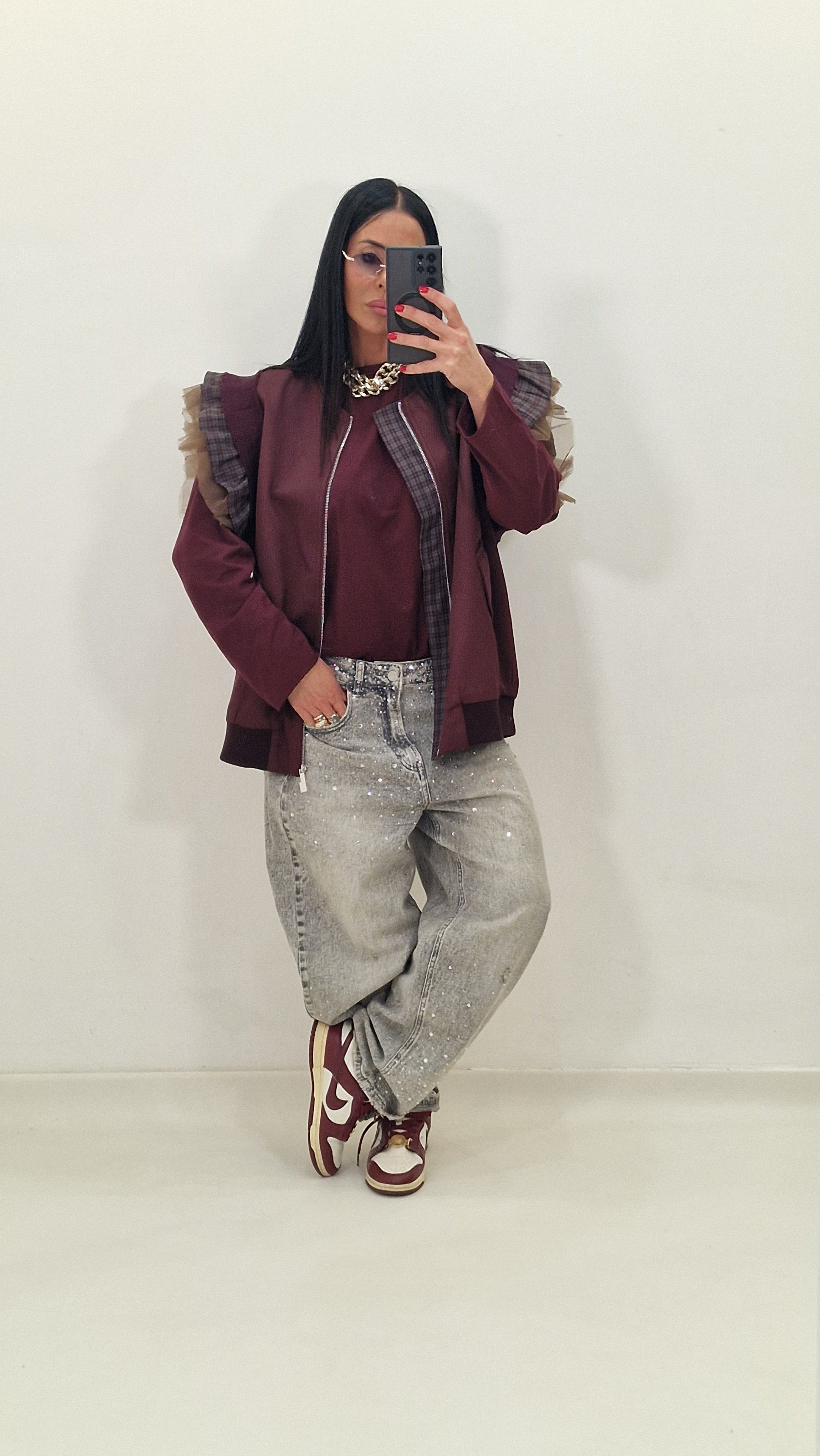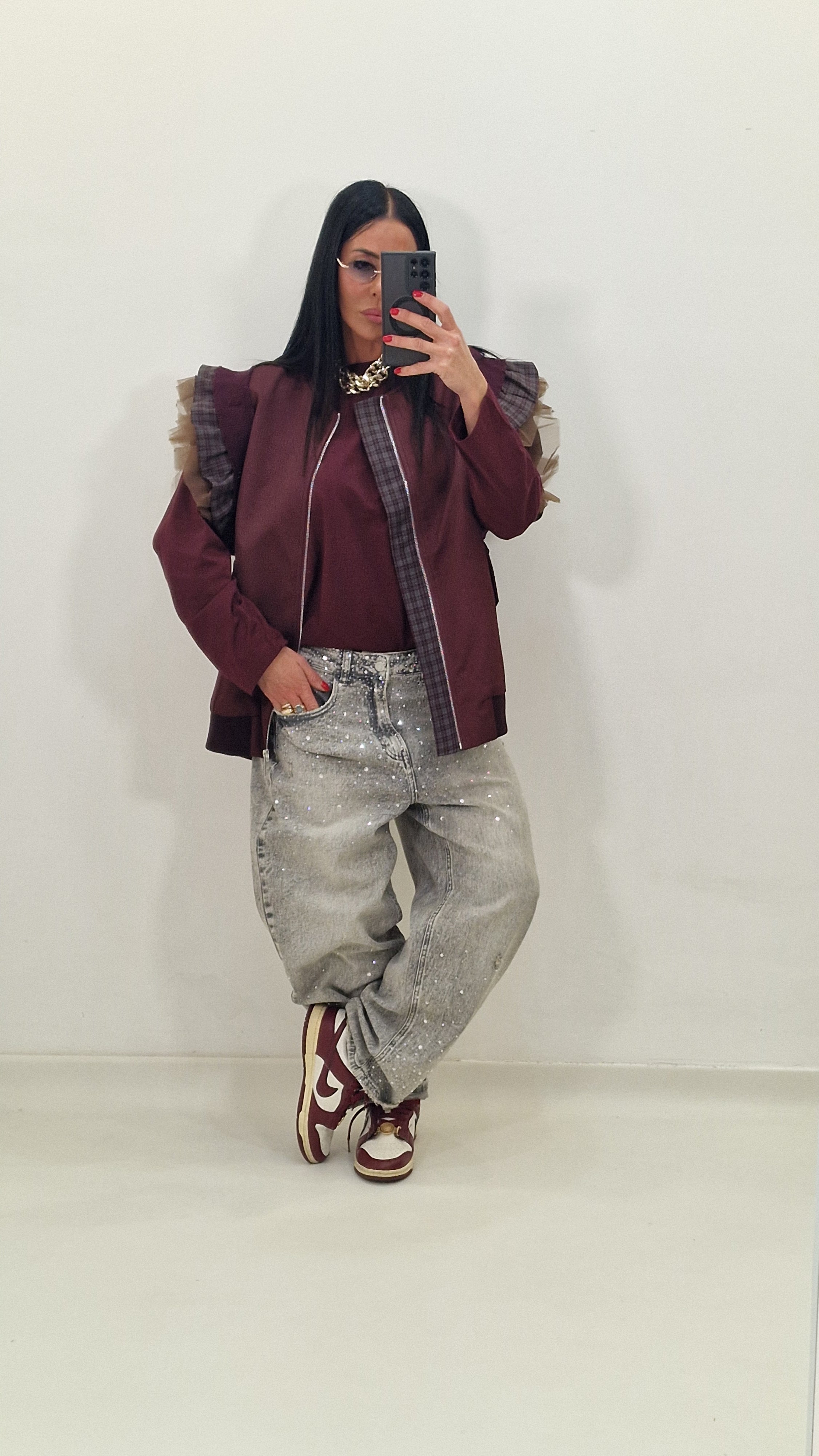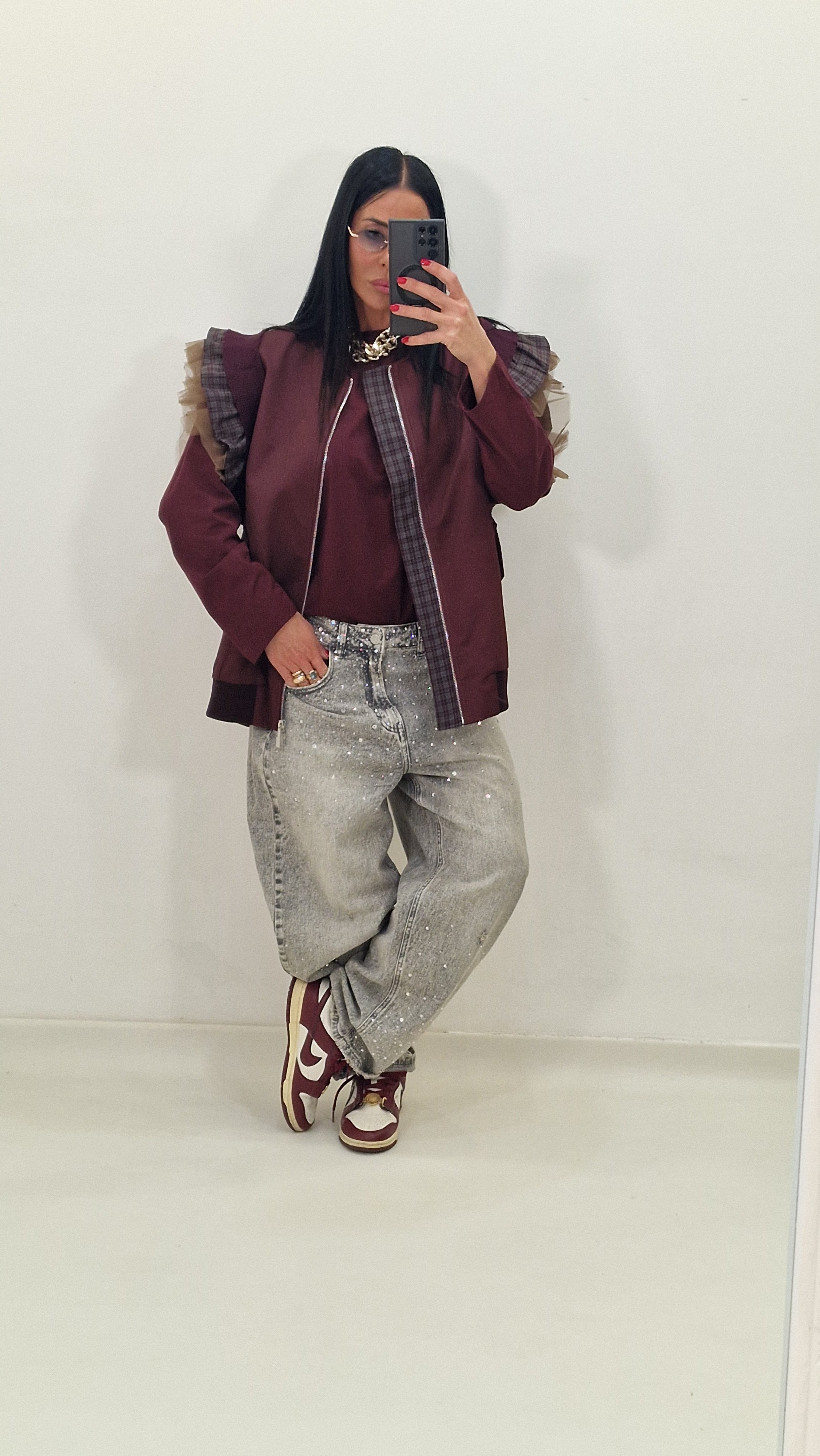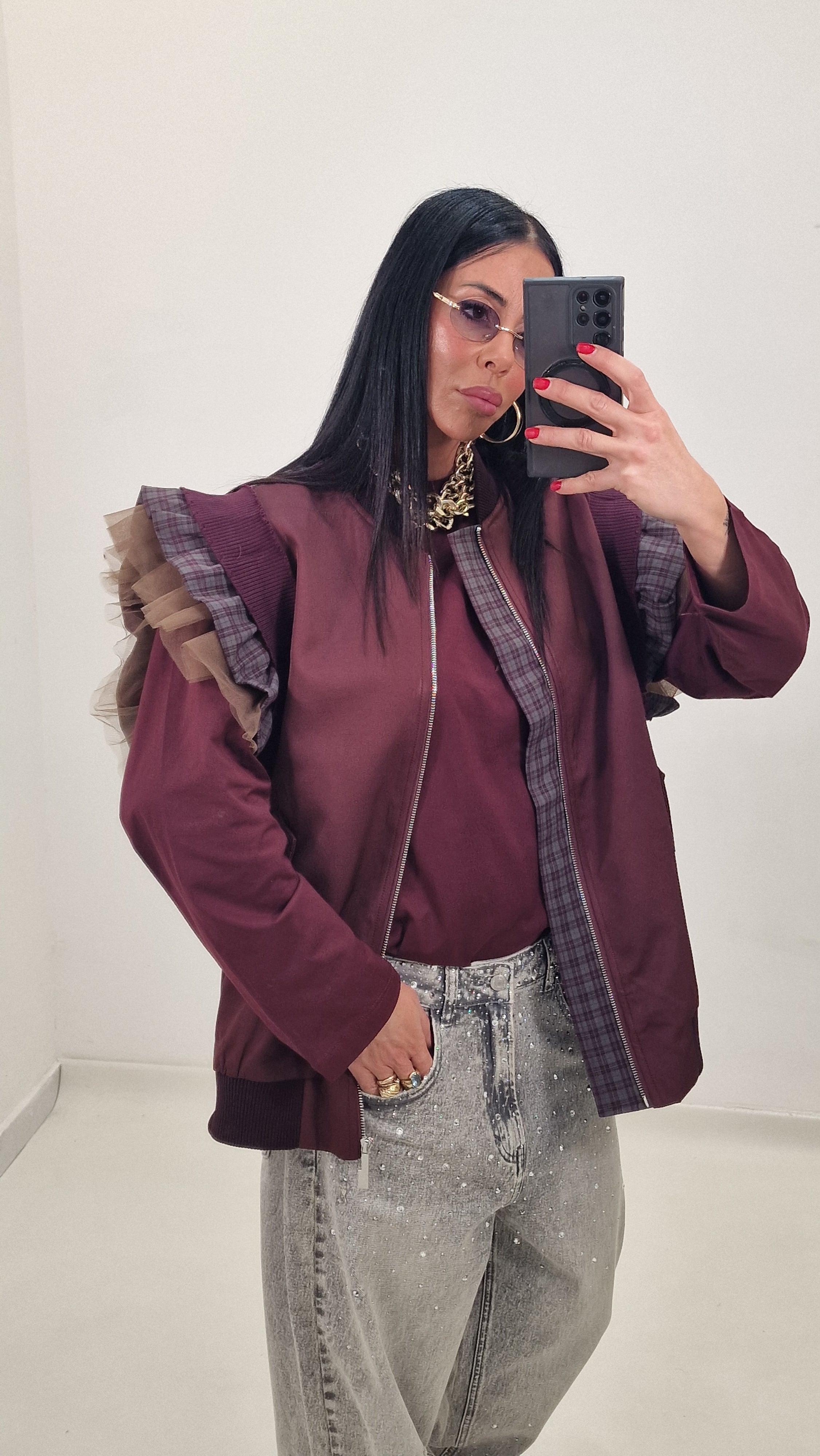 Zip-up vest with checked and tulle sleeves