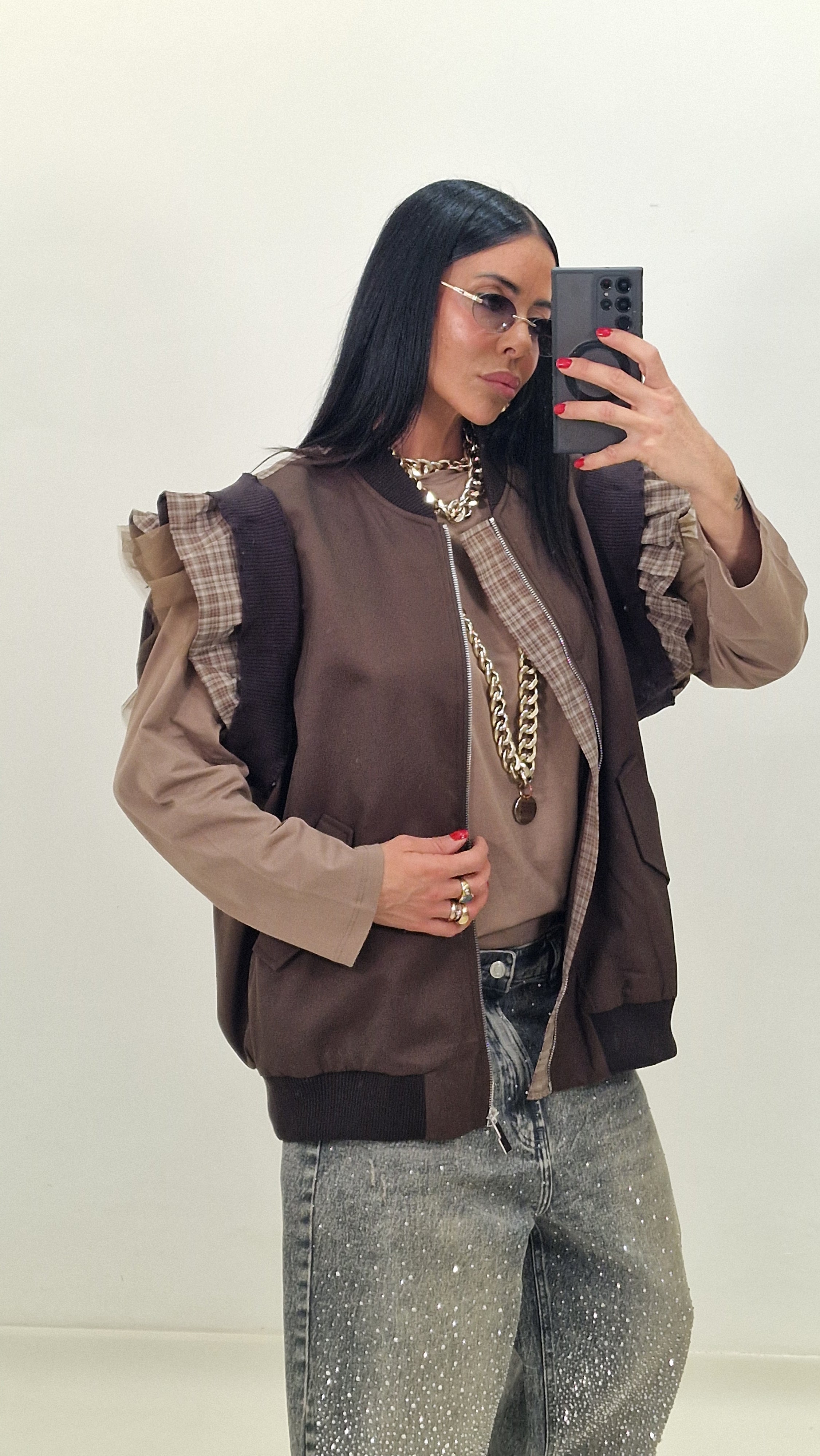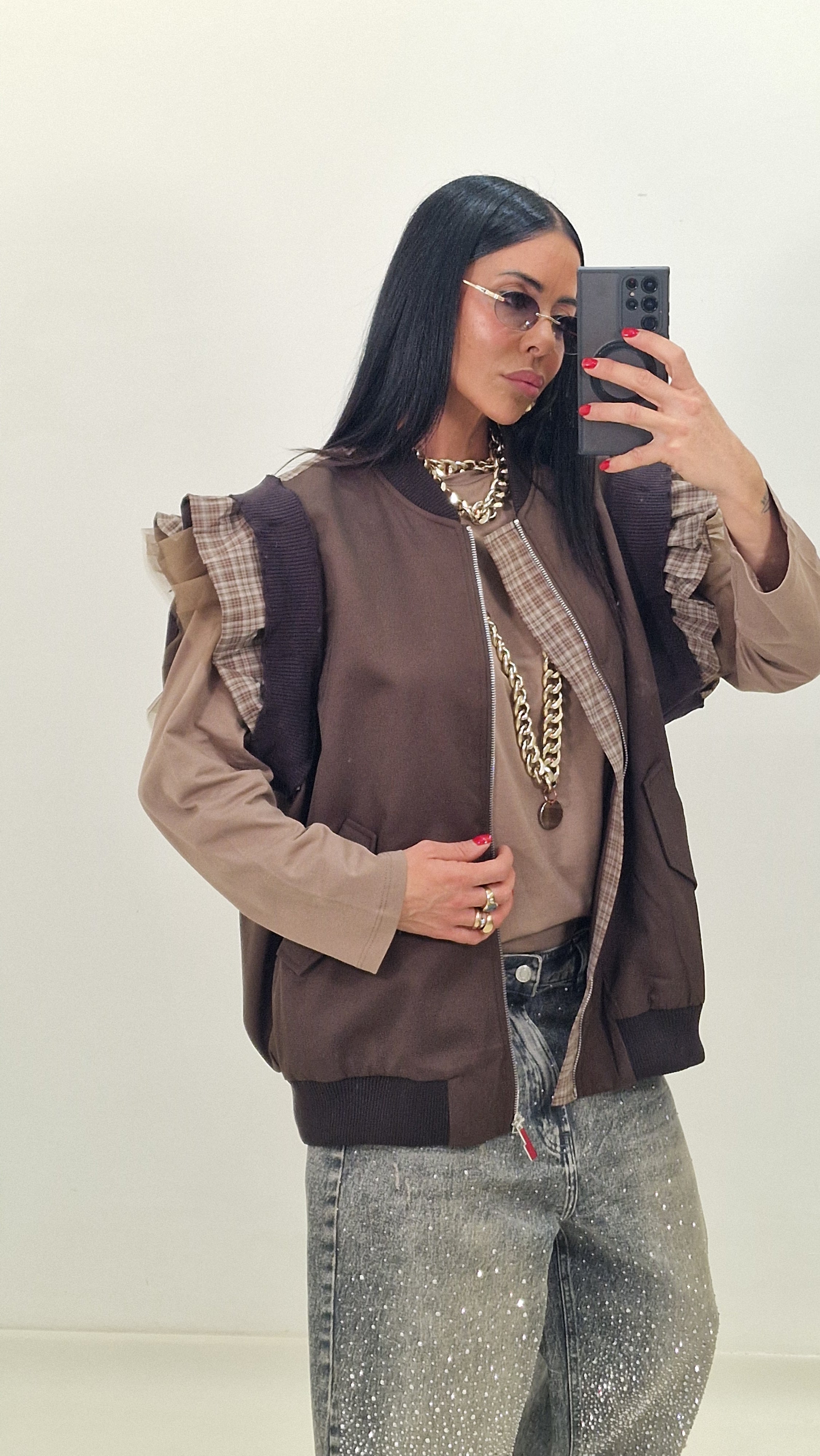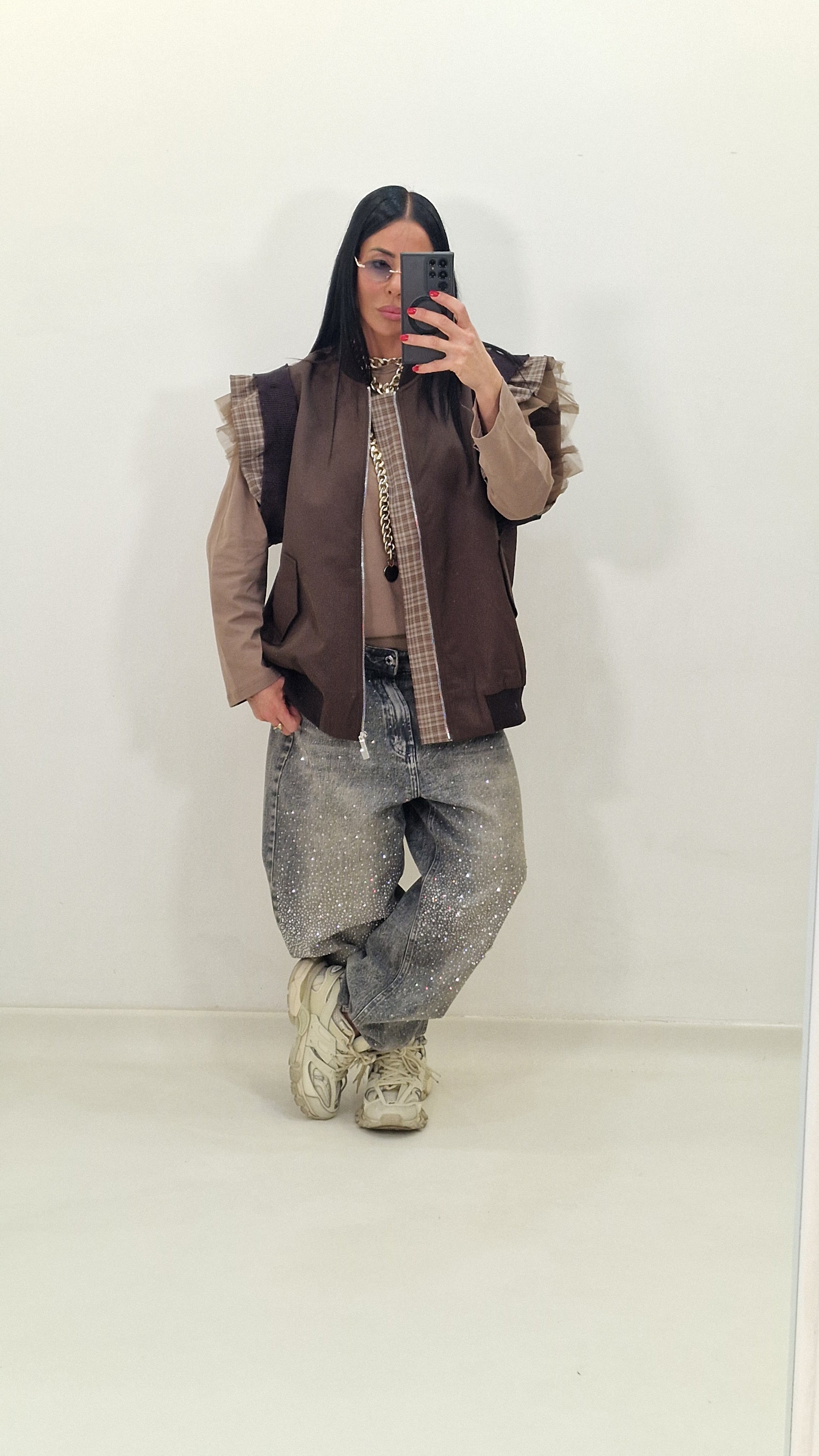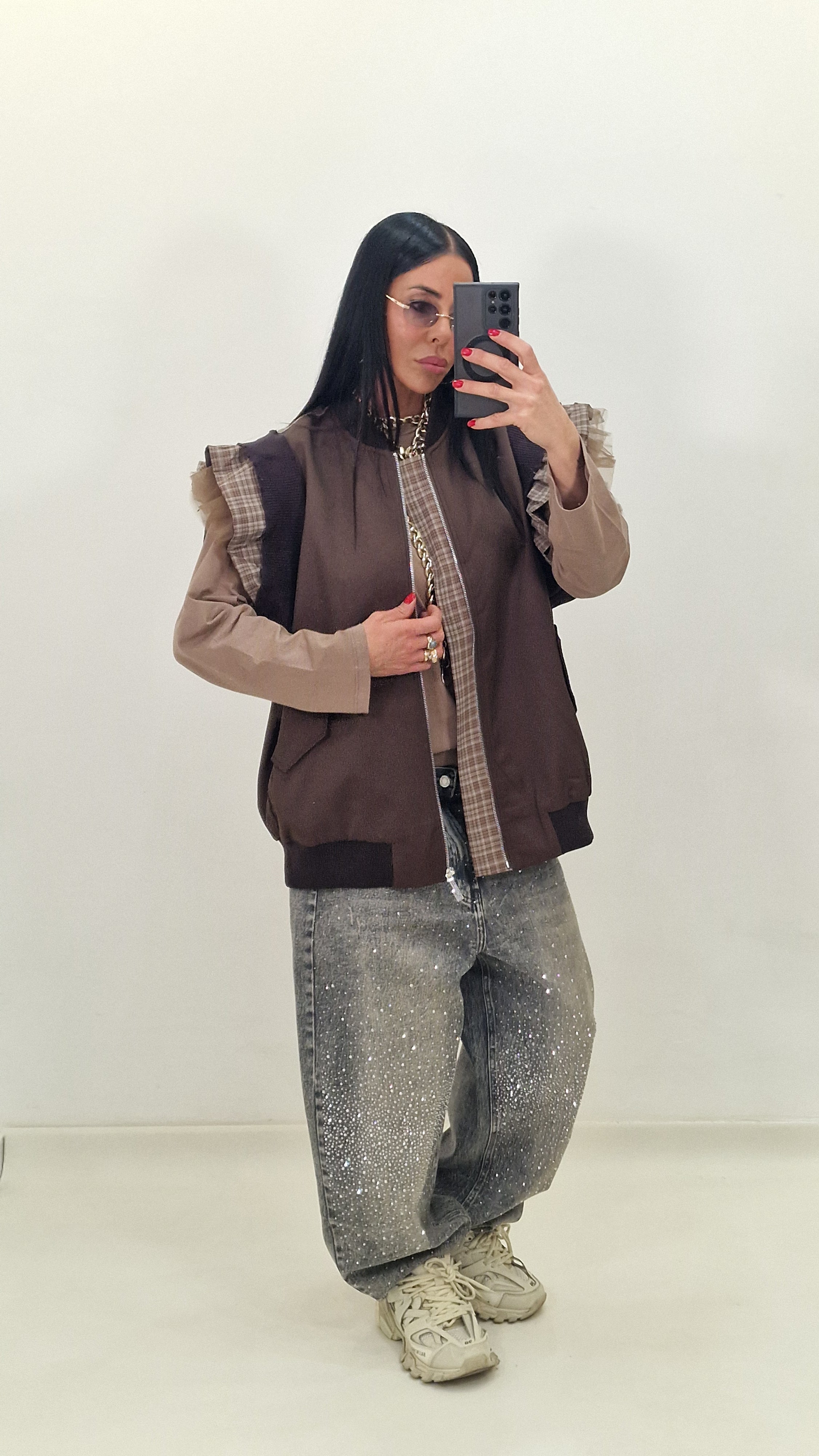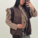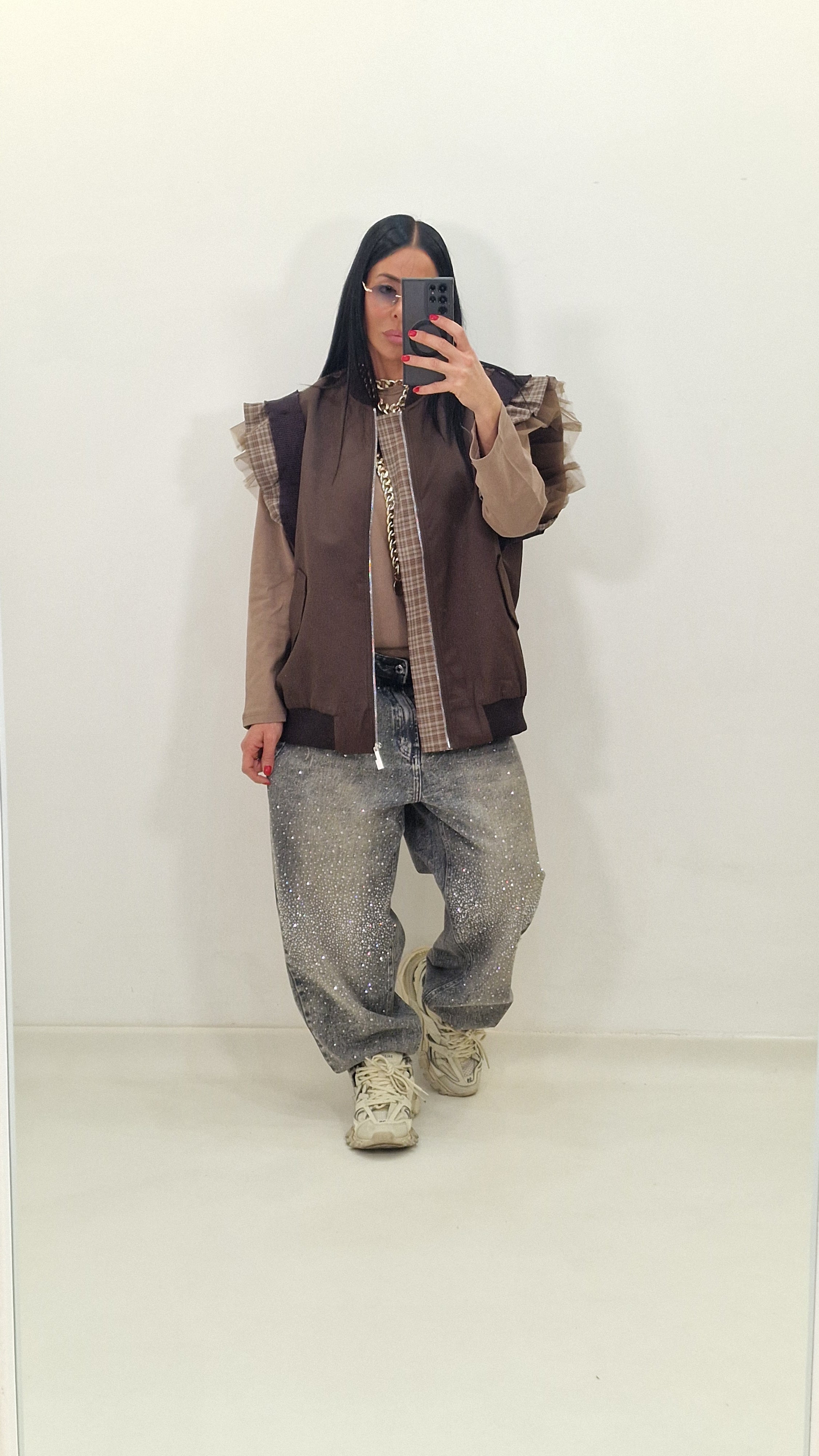 Zip-up vest with checked and tulle sleeves