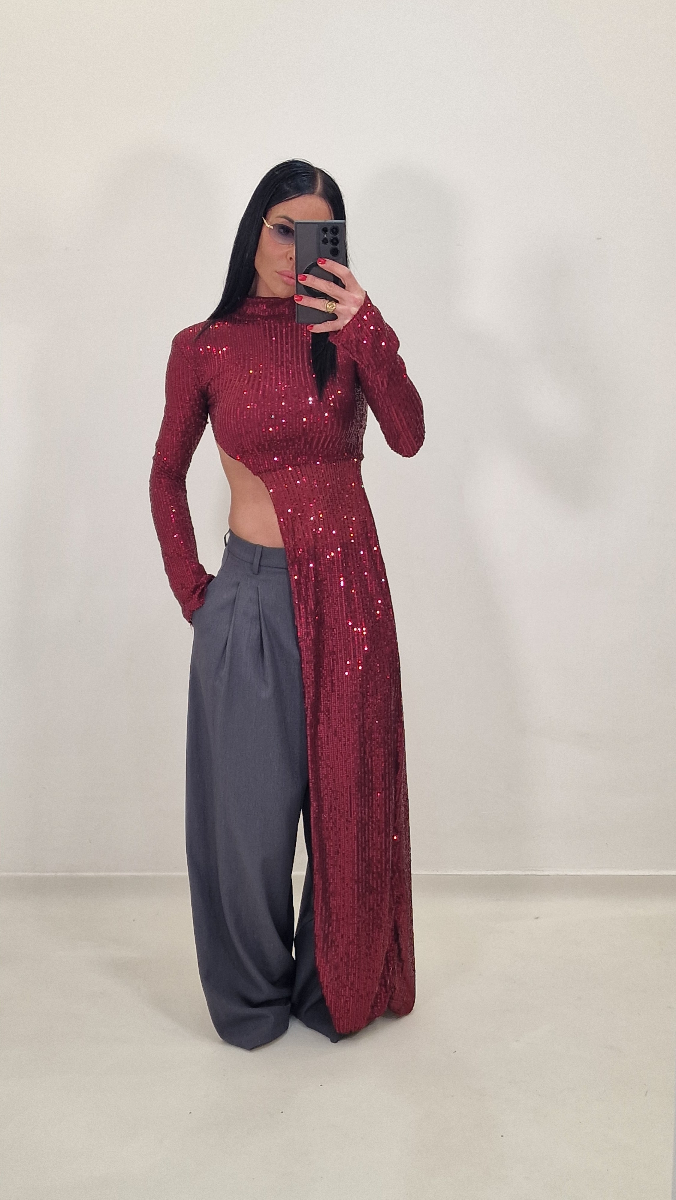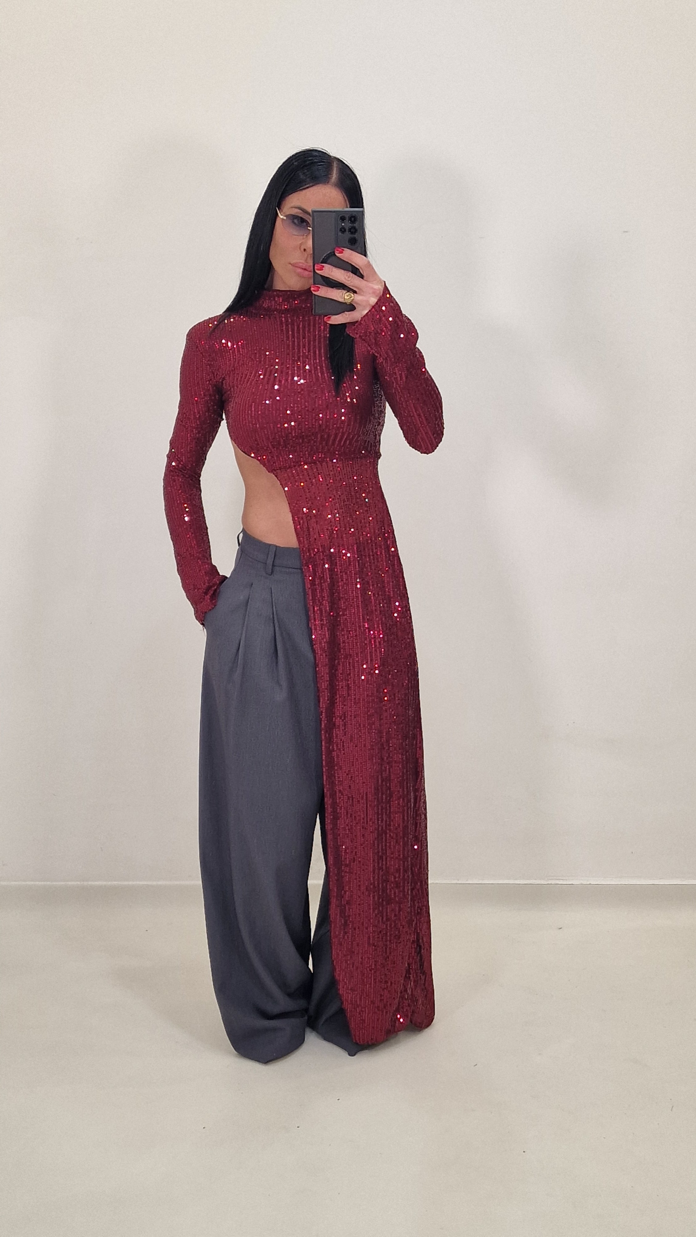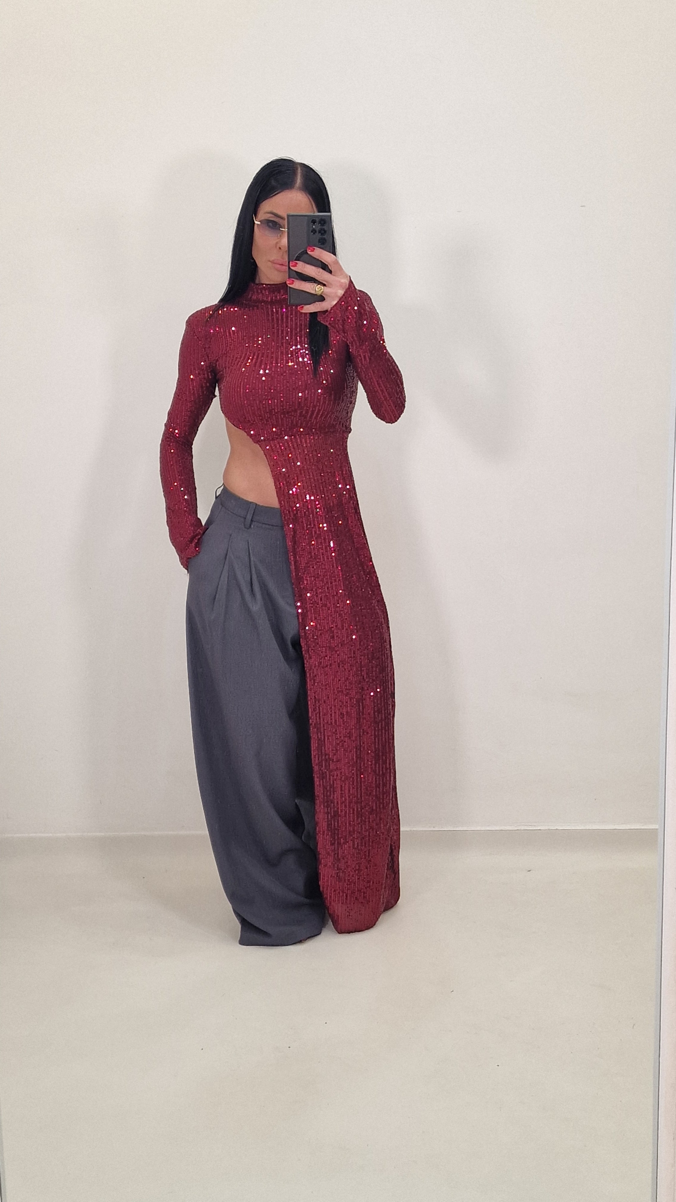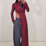 High-neck crop top with long side and sequins