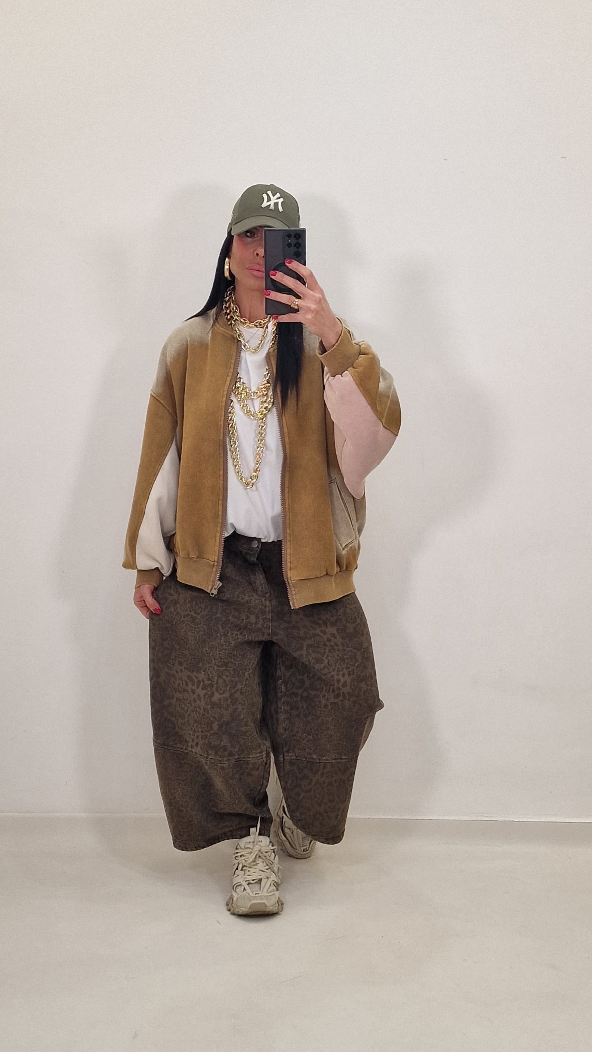 Ankle-length balloon jeans with leopard print,