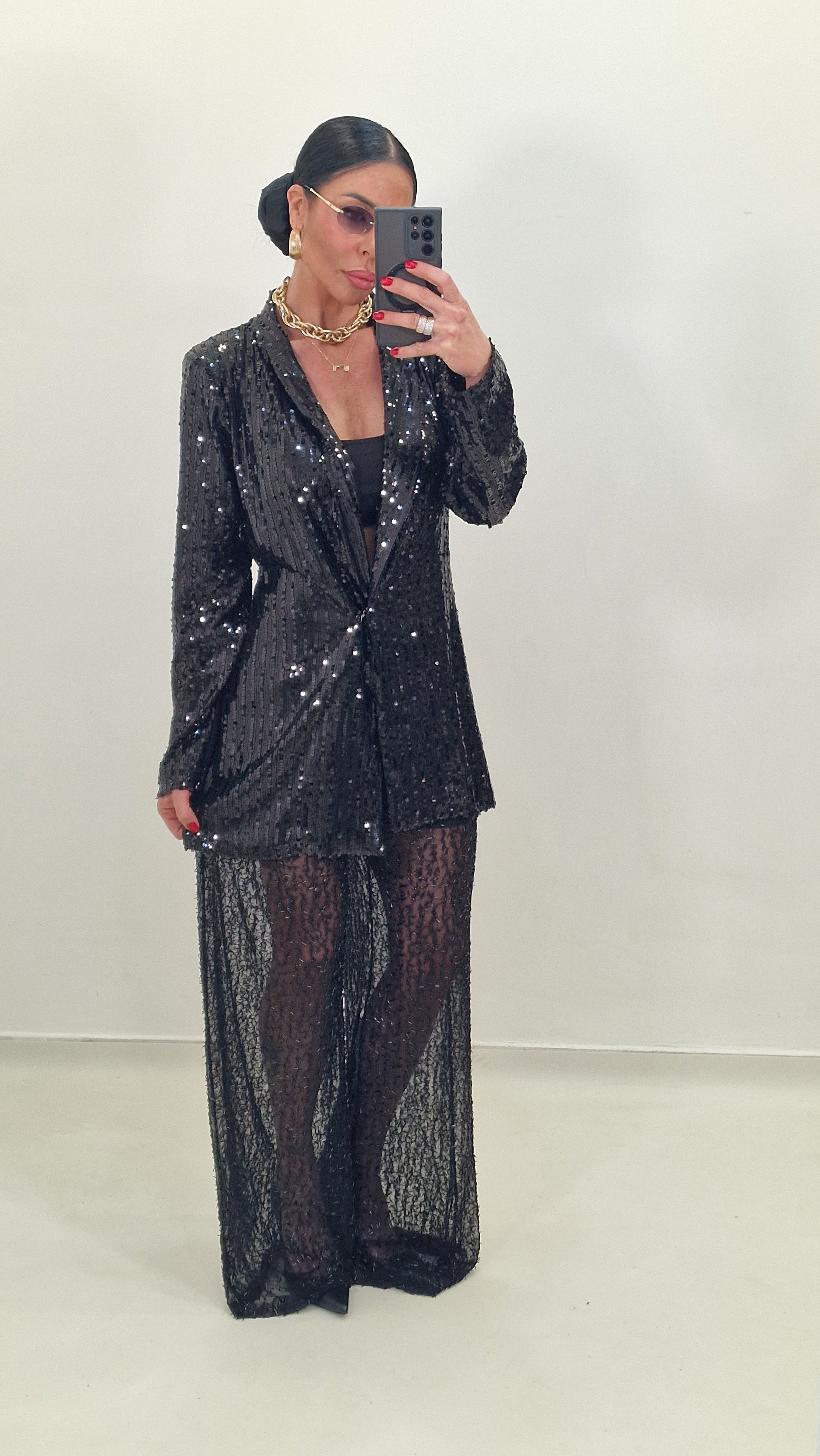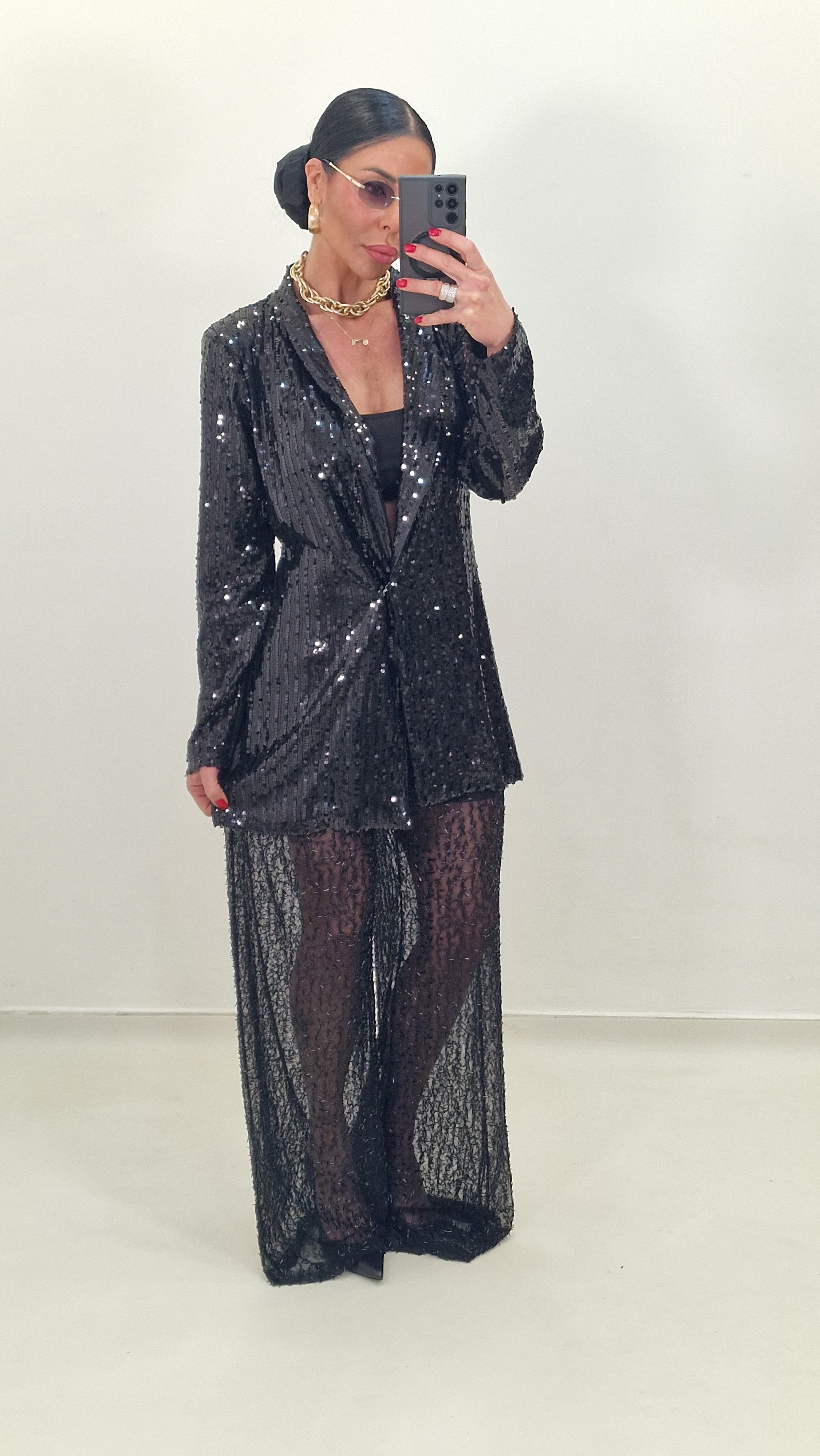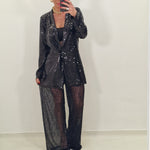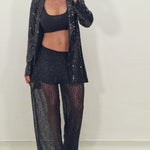 Sheer trousers with tone-on-tone applications