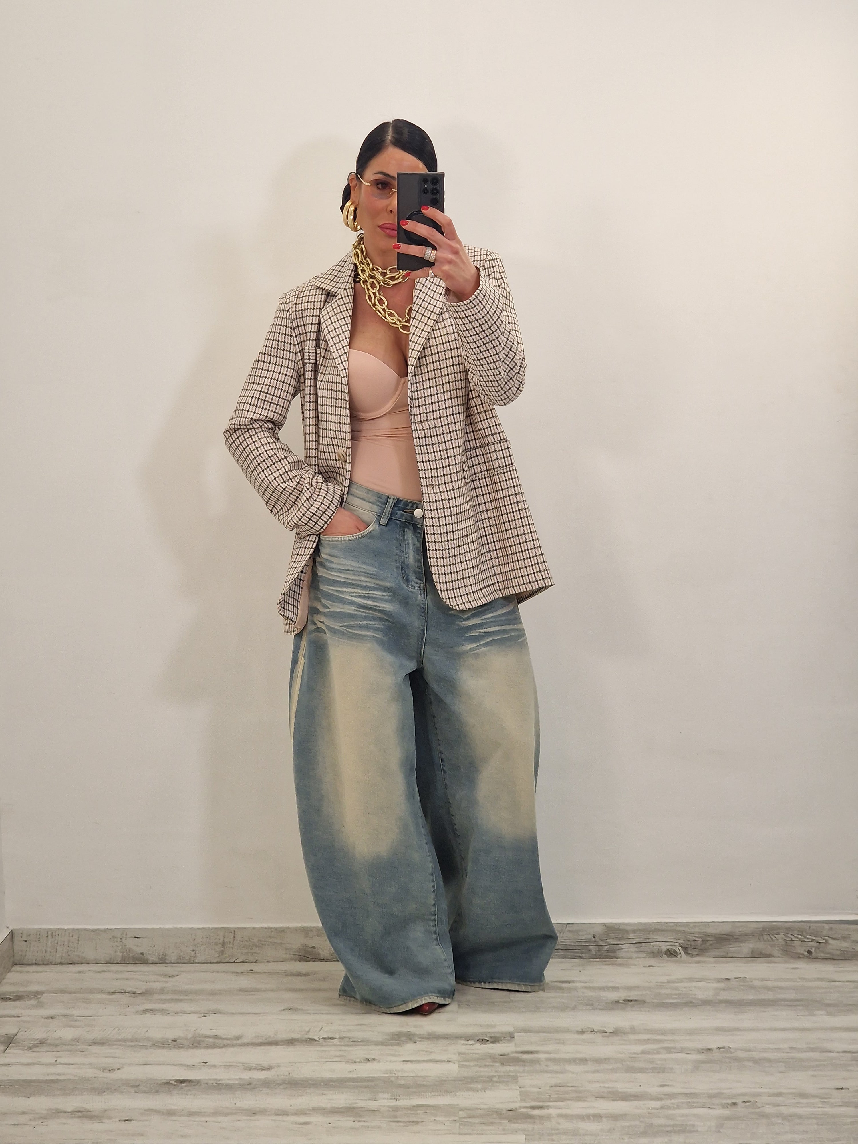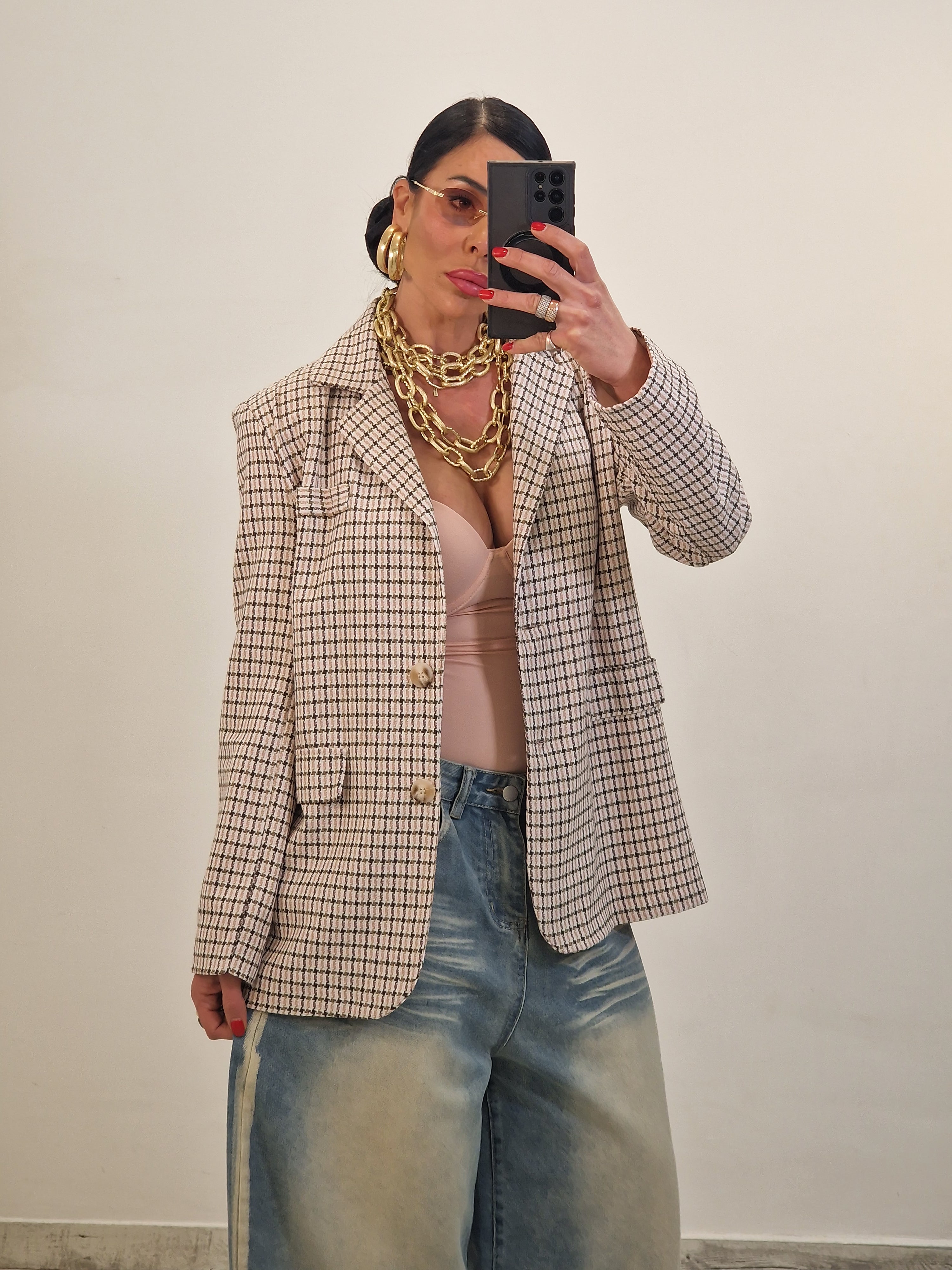 Blazer morbido con spalline in tessuto tweed molto leggero