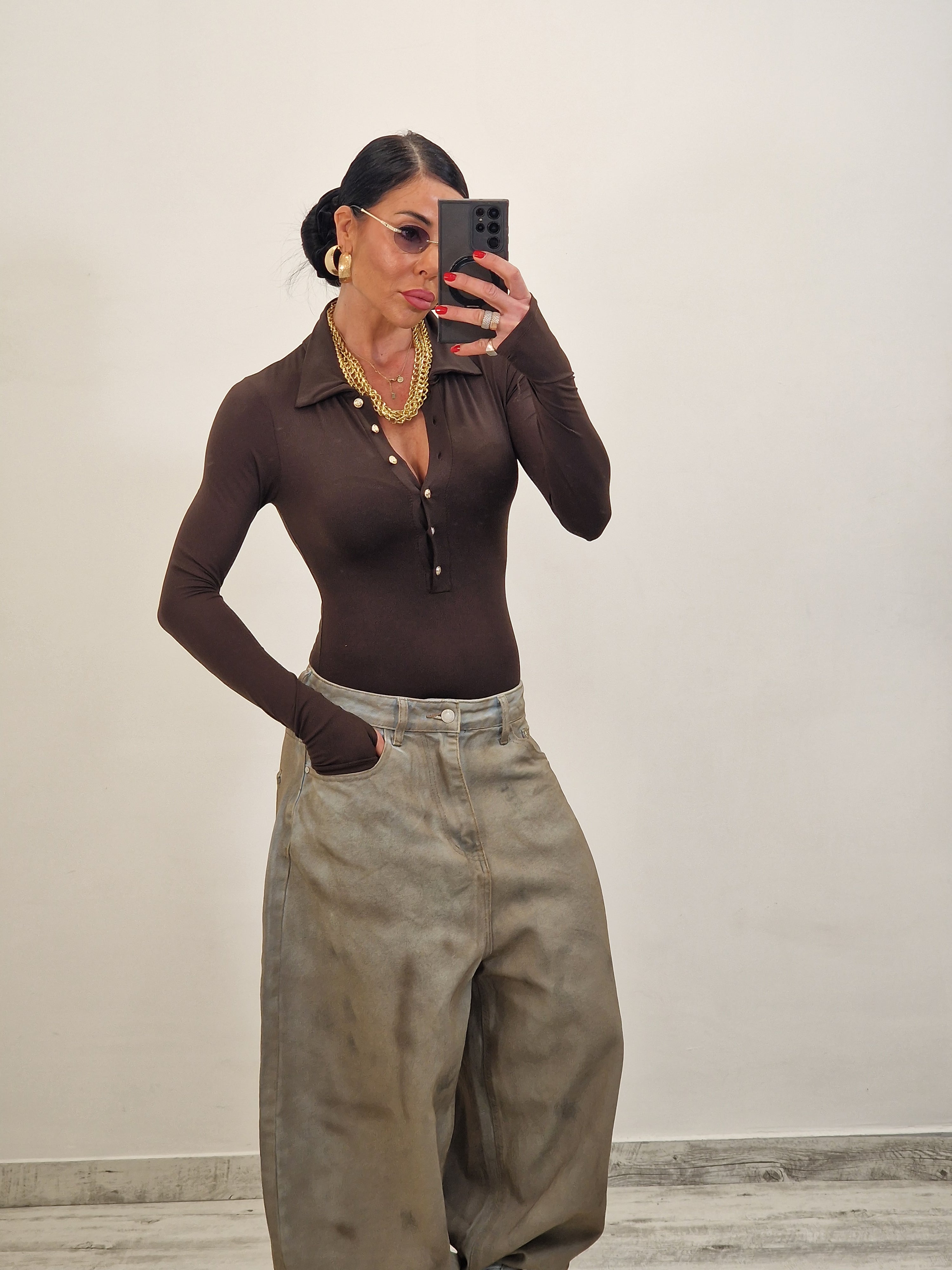 Body modello polo con maniche lunghe e bottoncini dorati