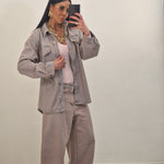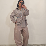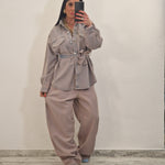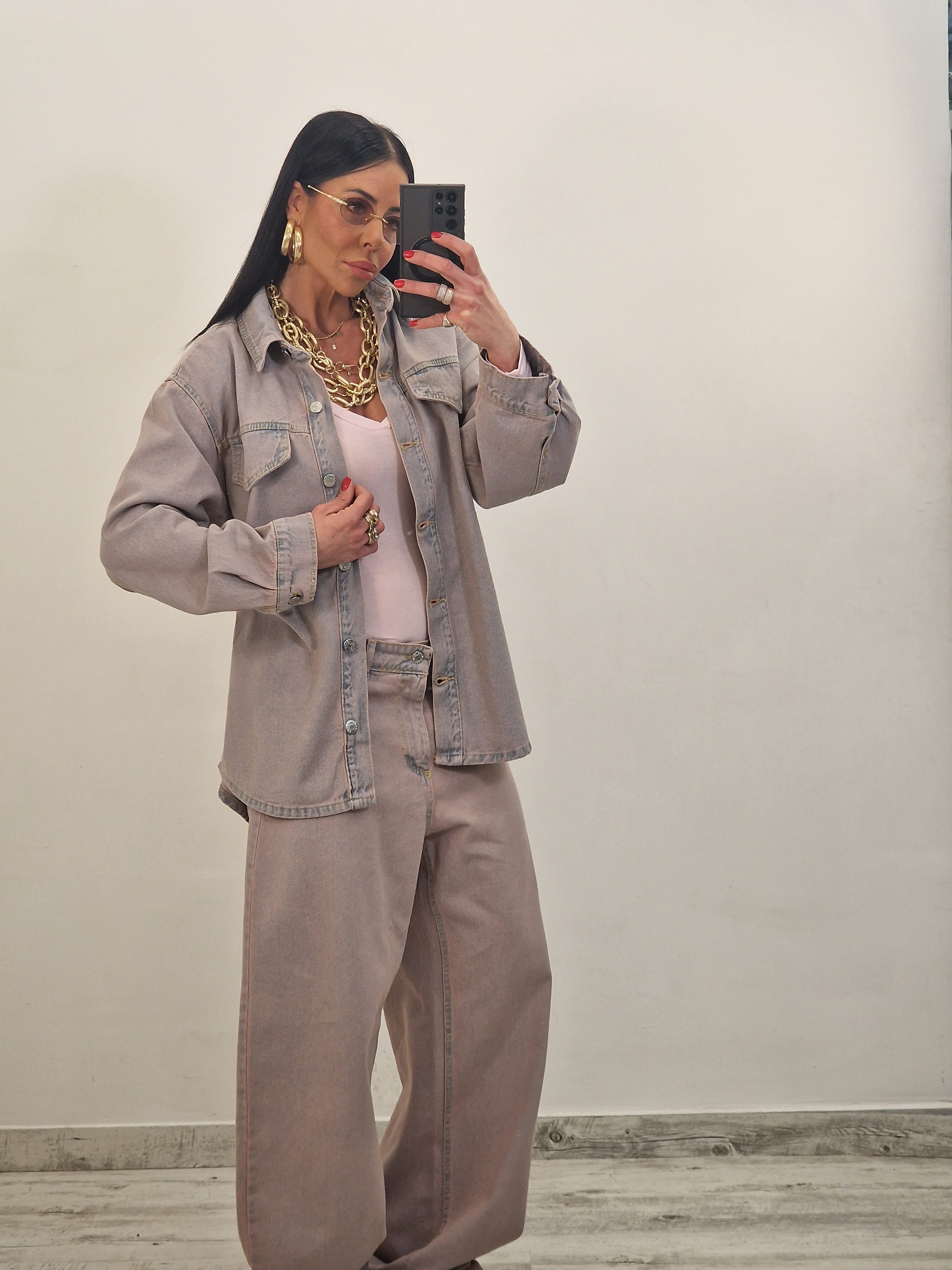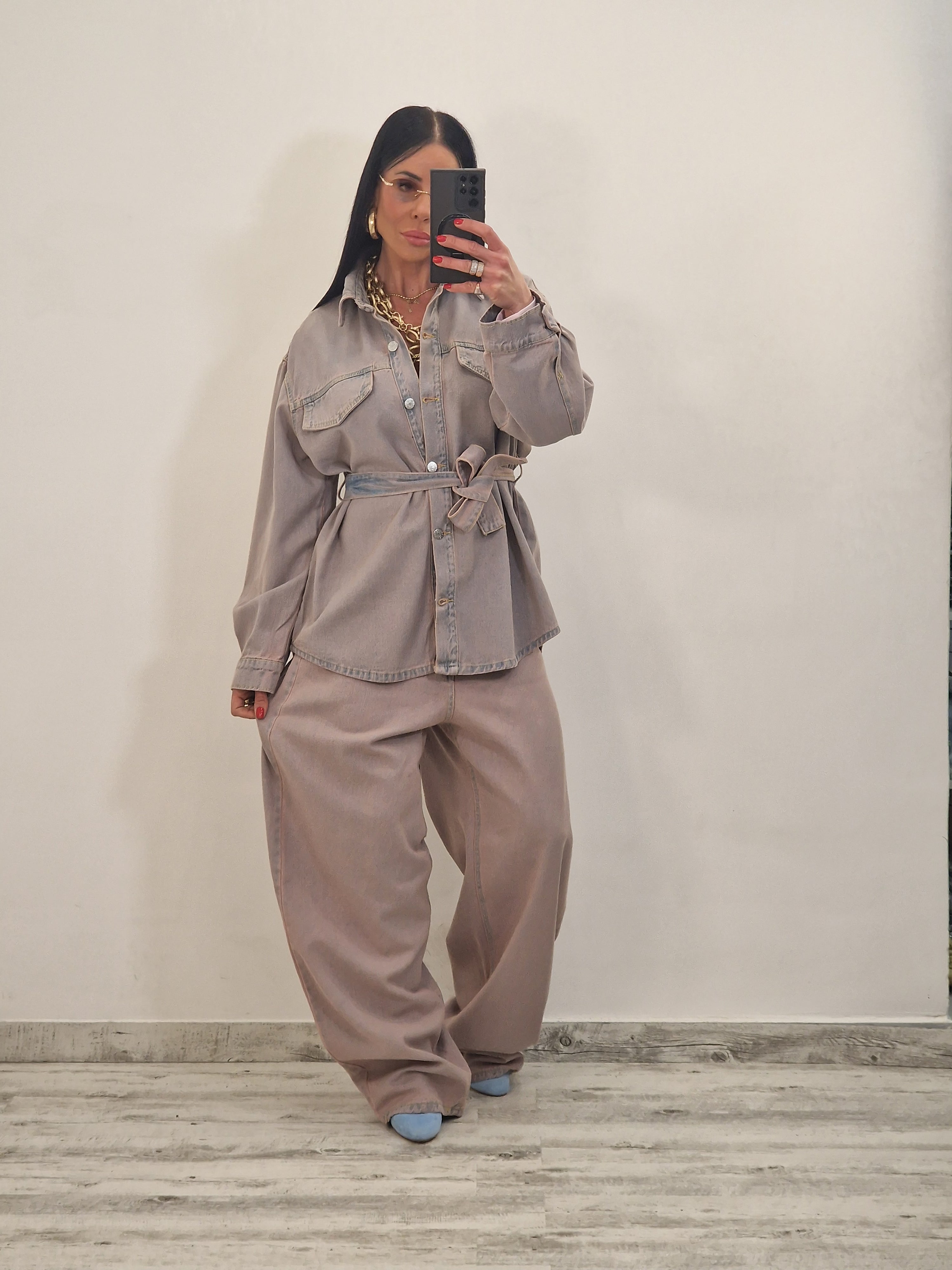 Camicione di jeans con sfumature rosa con cintura removibile e finte tasche avanti