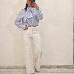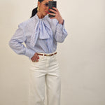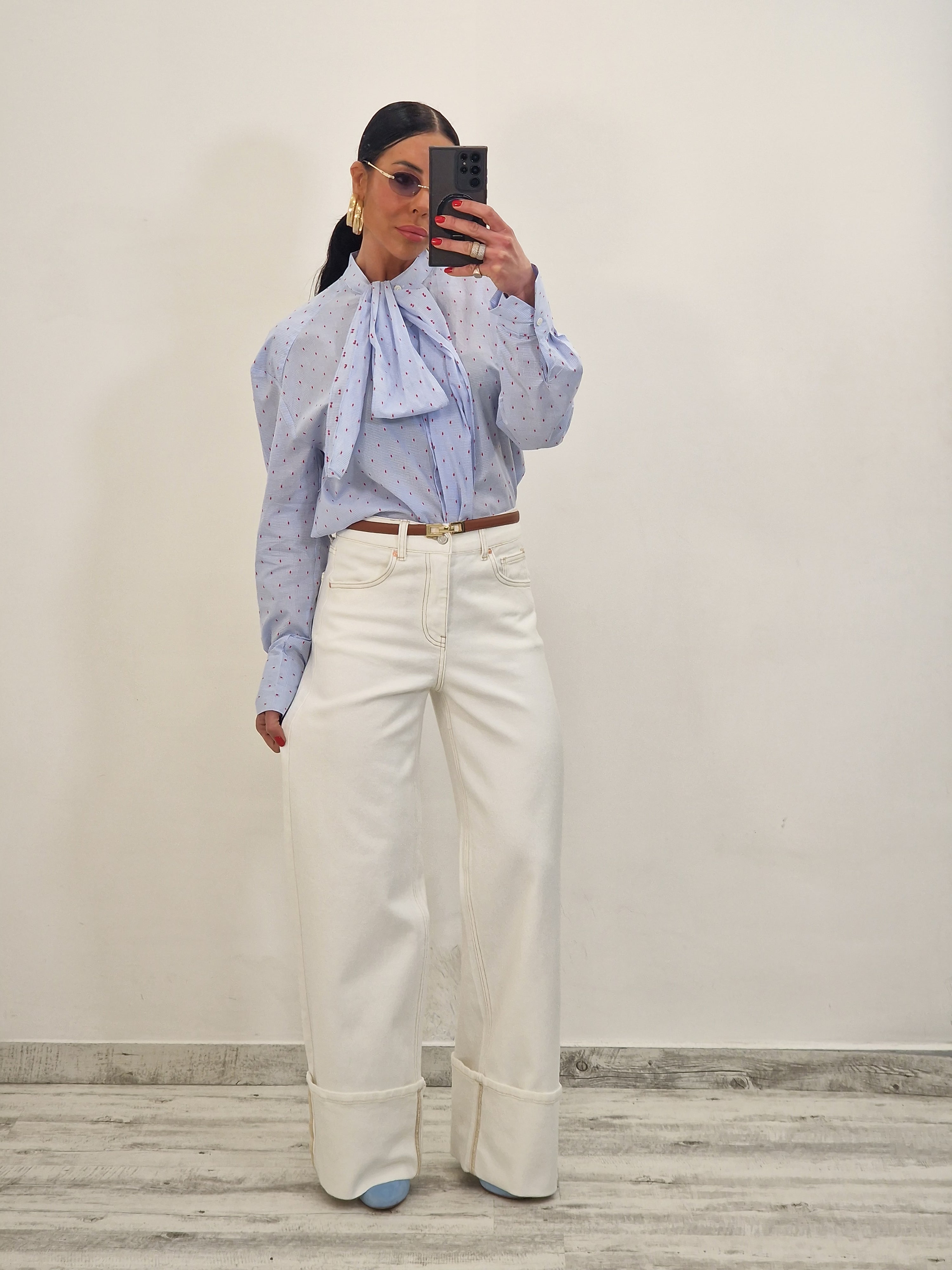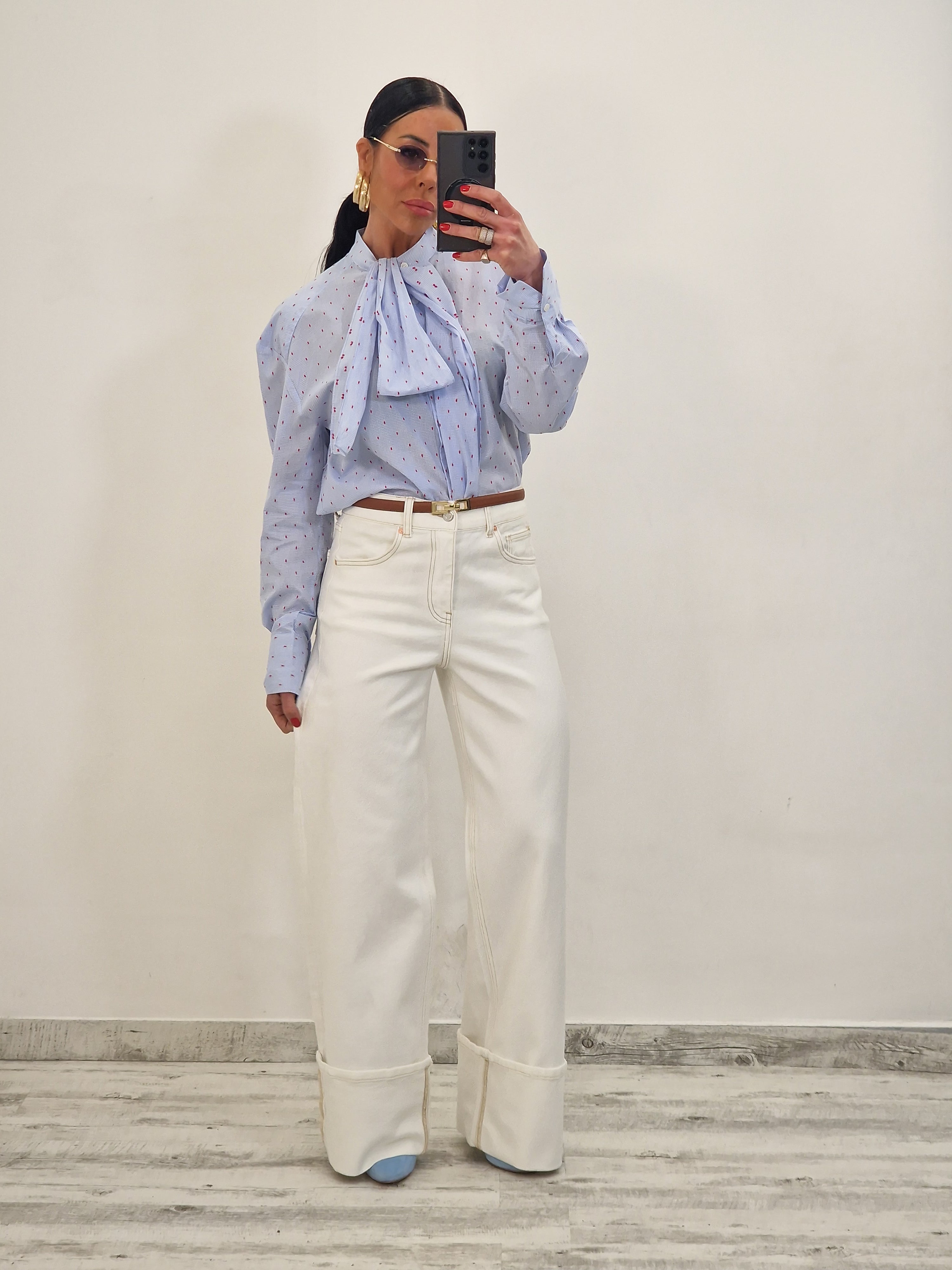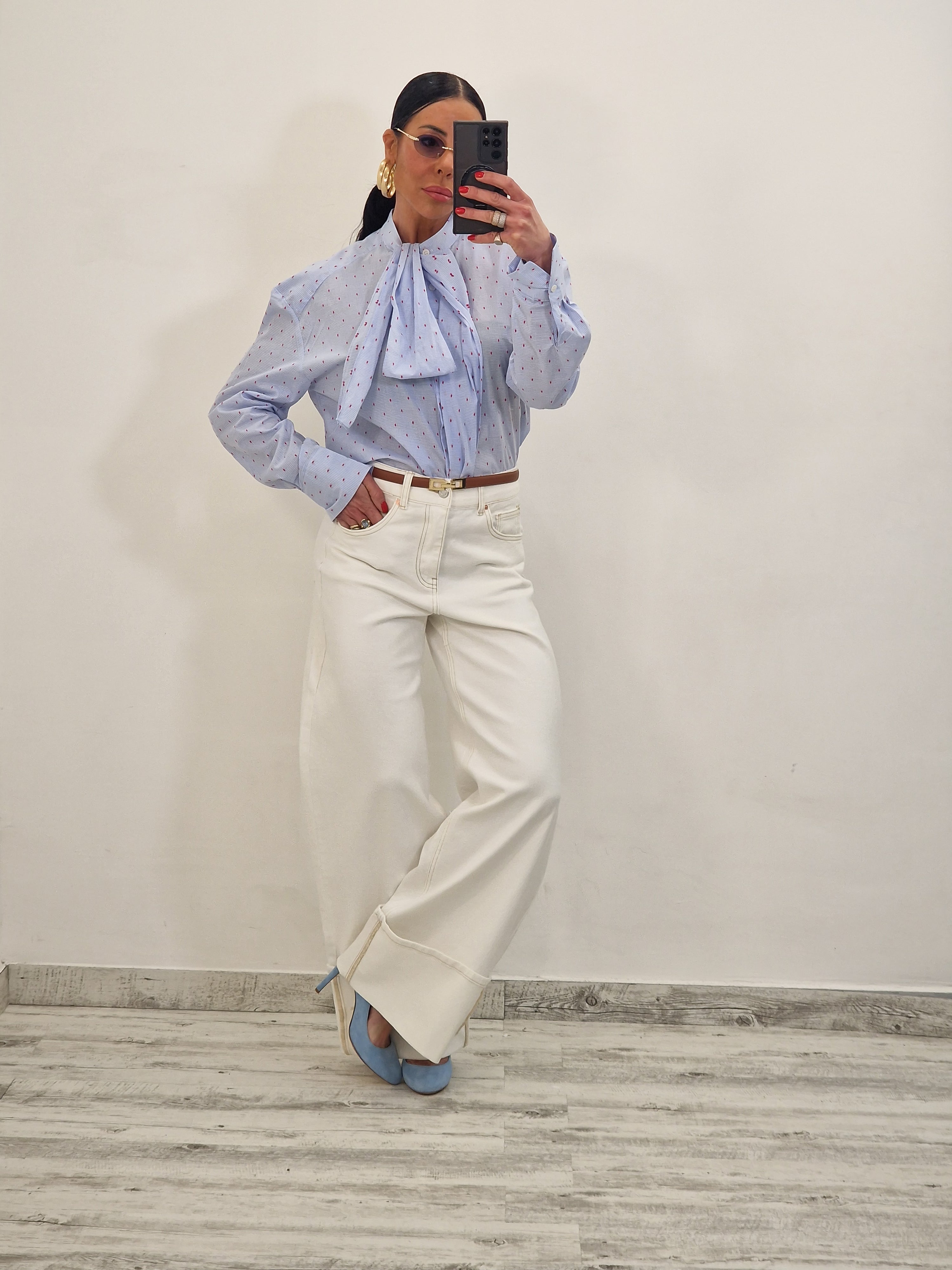 Camicia con fiocco con collo a pistagna, puntini rossi ricamati, più lunga dietro