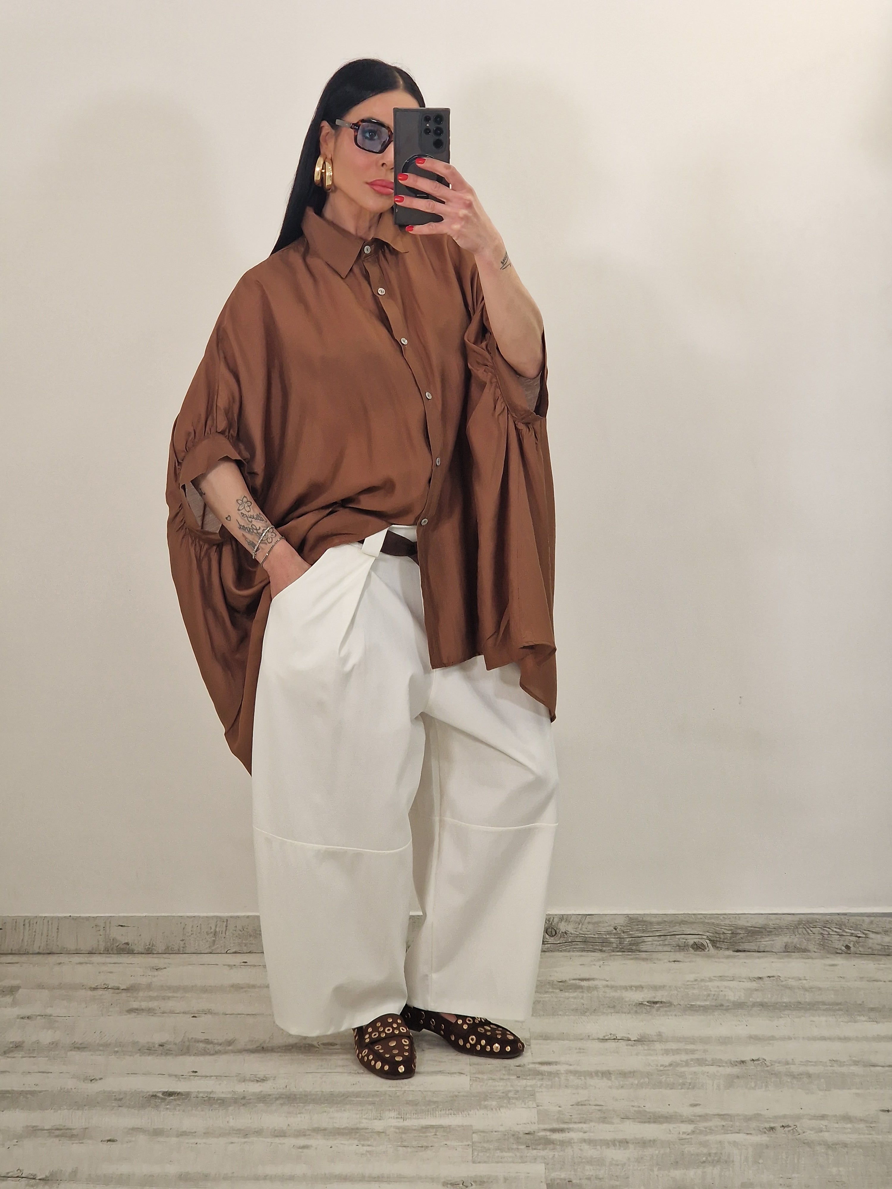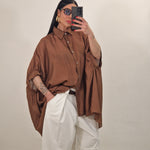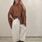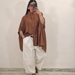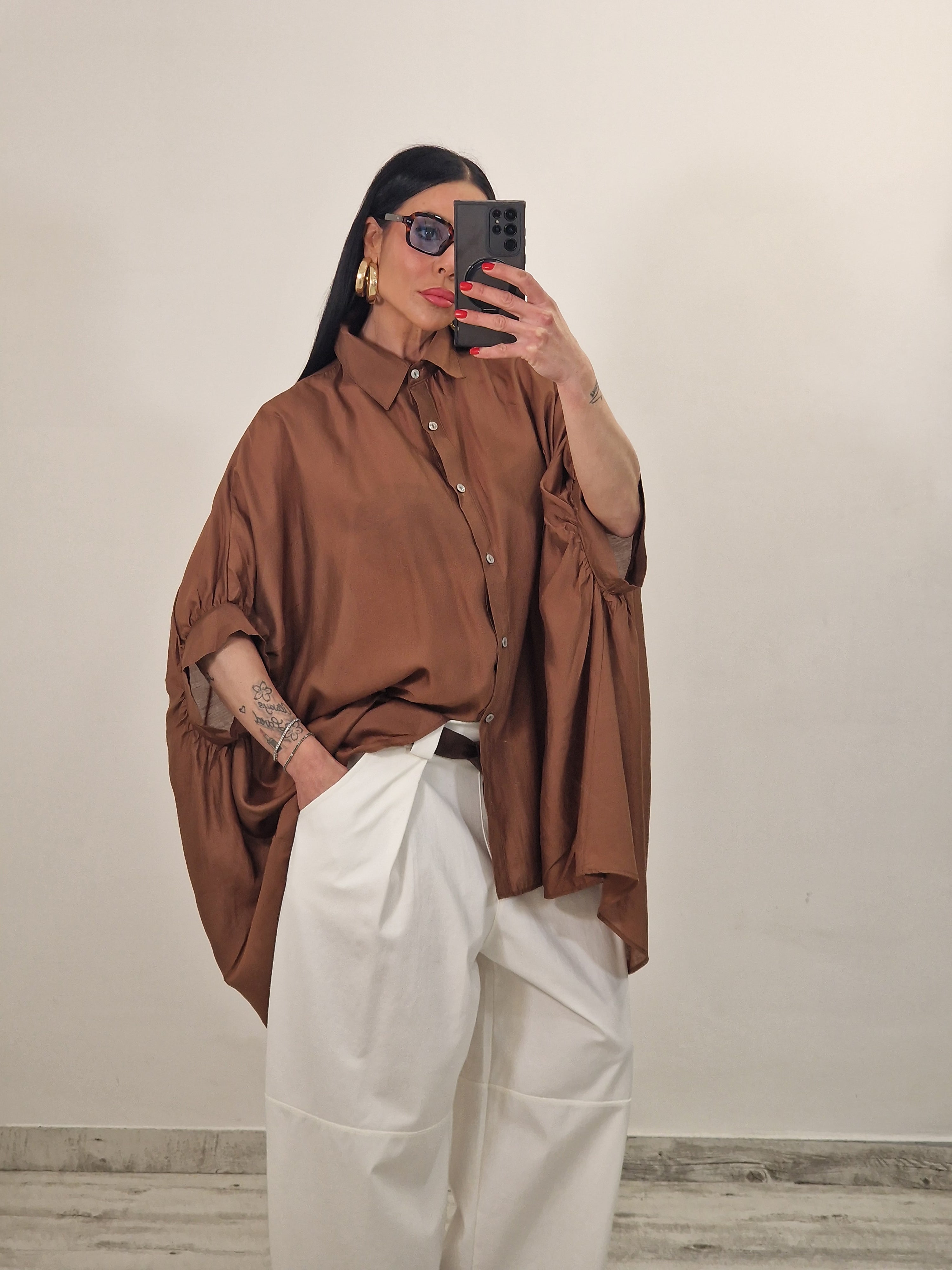 Camicione morbido over semi velato con mezza manica e bottoncini alla chiusura, perfetto per un look fresco e versatile. Il tessuto leggero e trasparente lo rende ideale da indossare da solo o sopra altri capi, aggiungendo un tocco di eleganza informale a qualsiasi outfit.