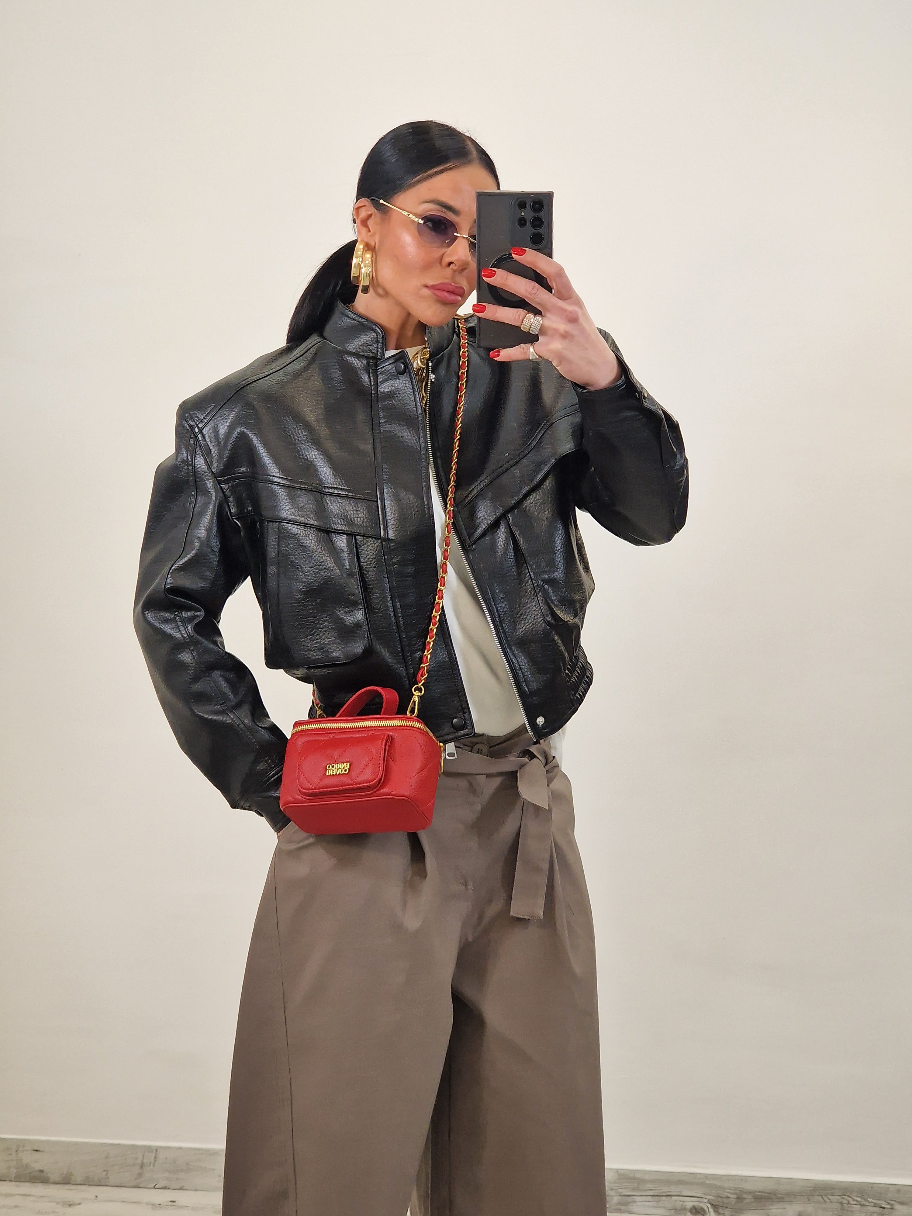 Chiodo bomber con tasche avanti e fascia arricciata sotto