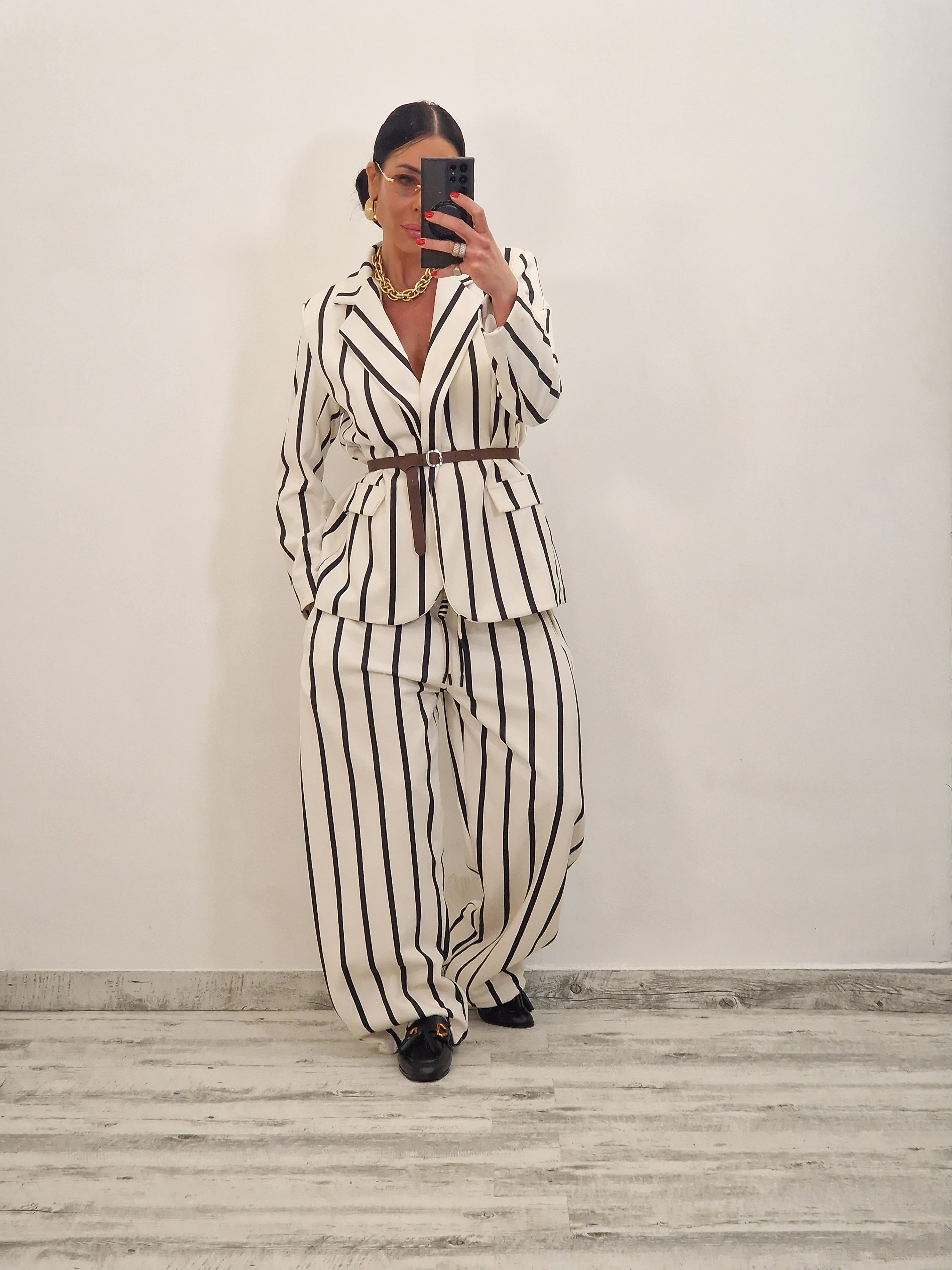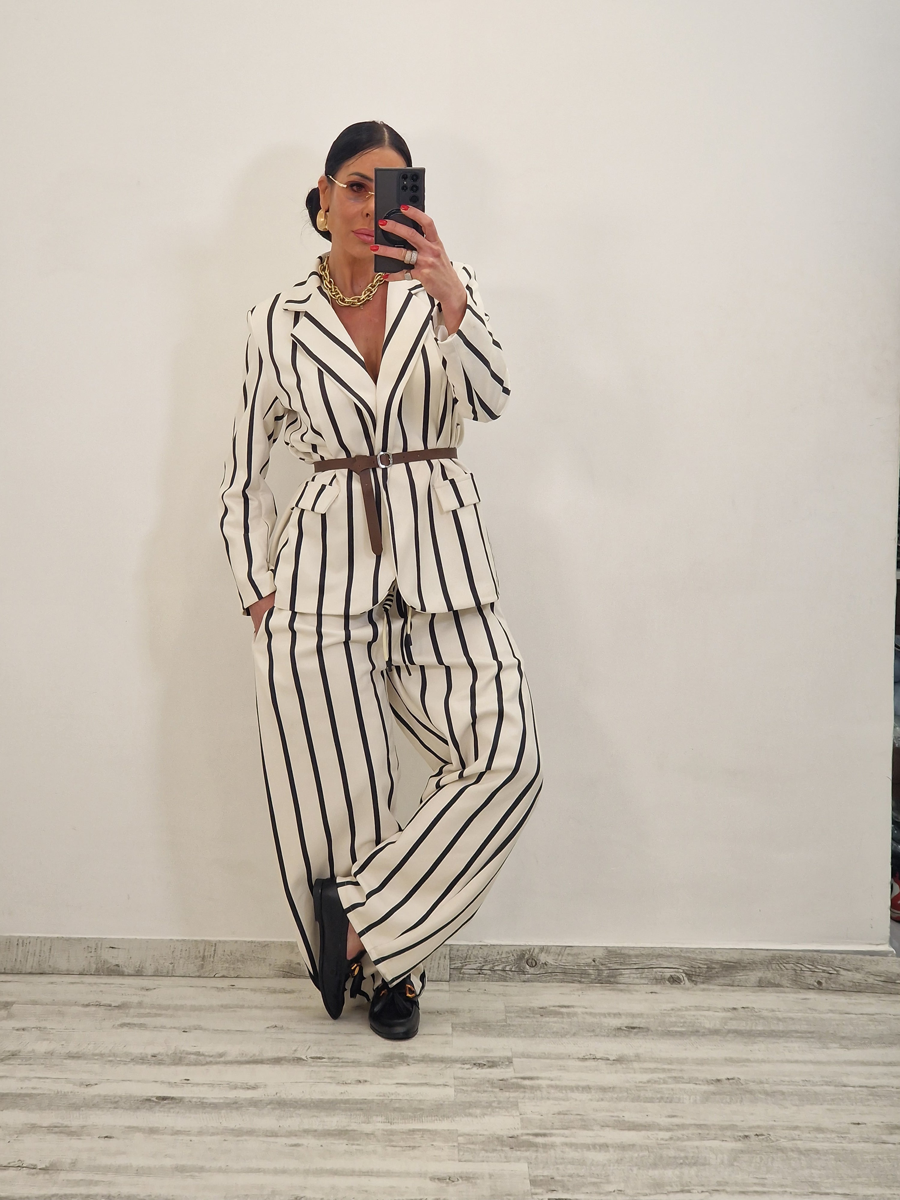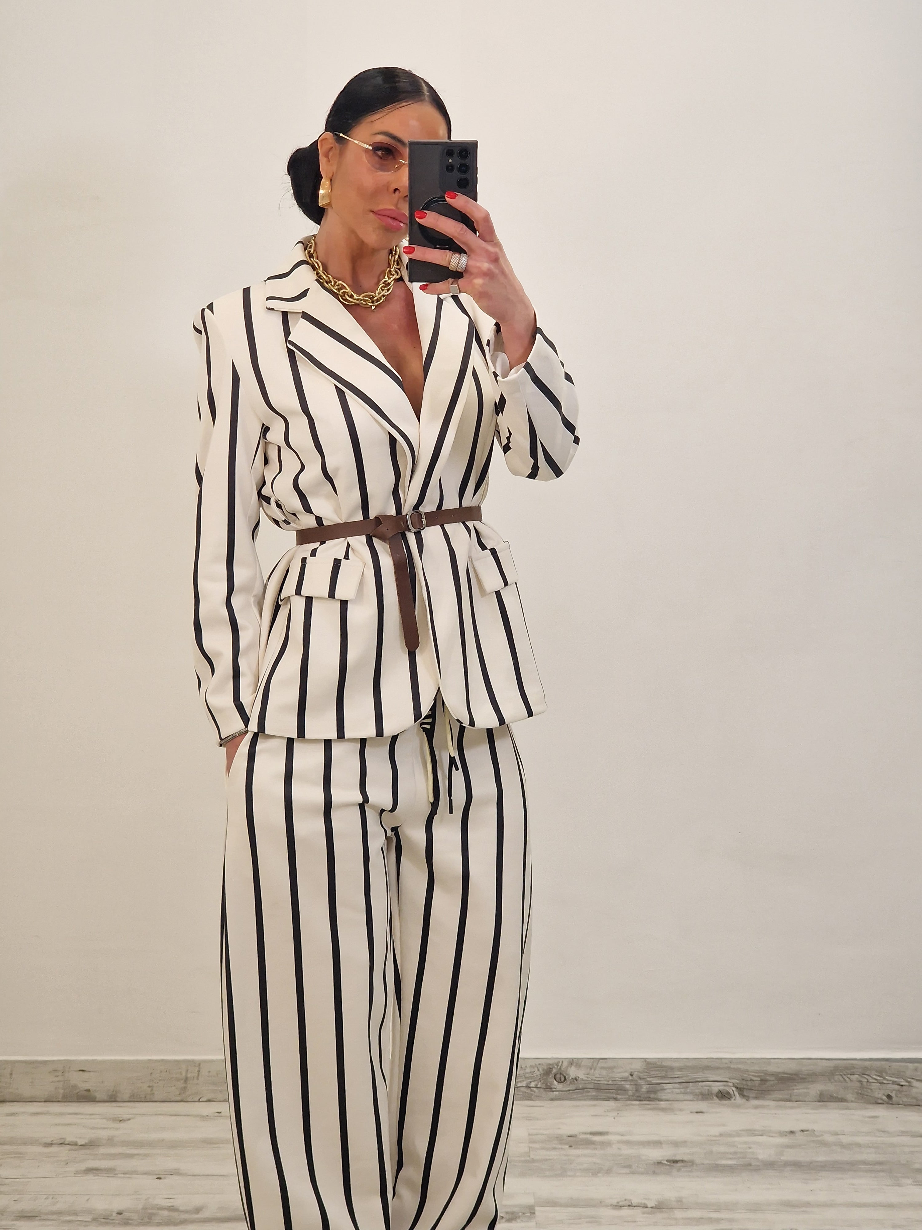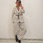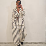 Coordinato a righe effetto SOFT TOUCH composto da giacca con cintura cuoio