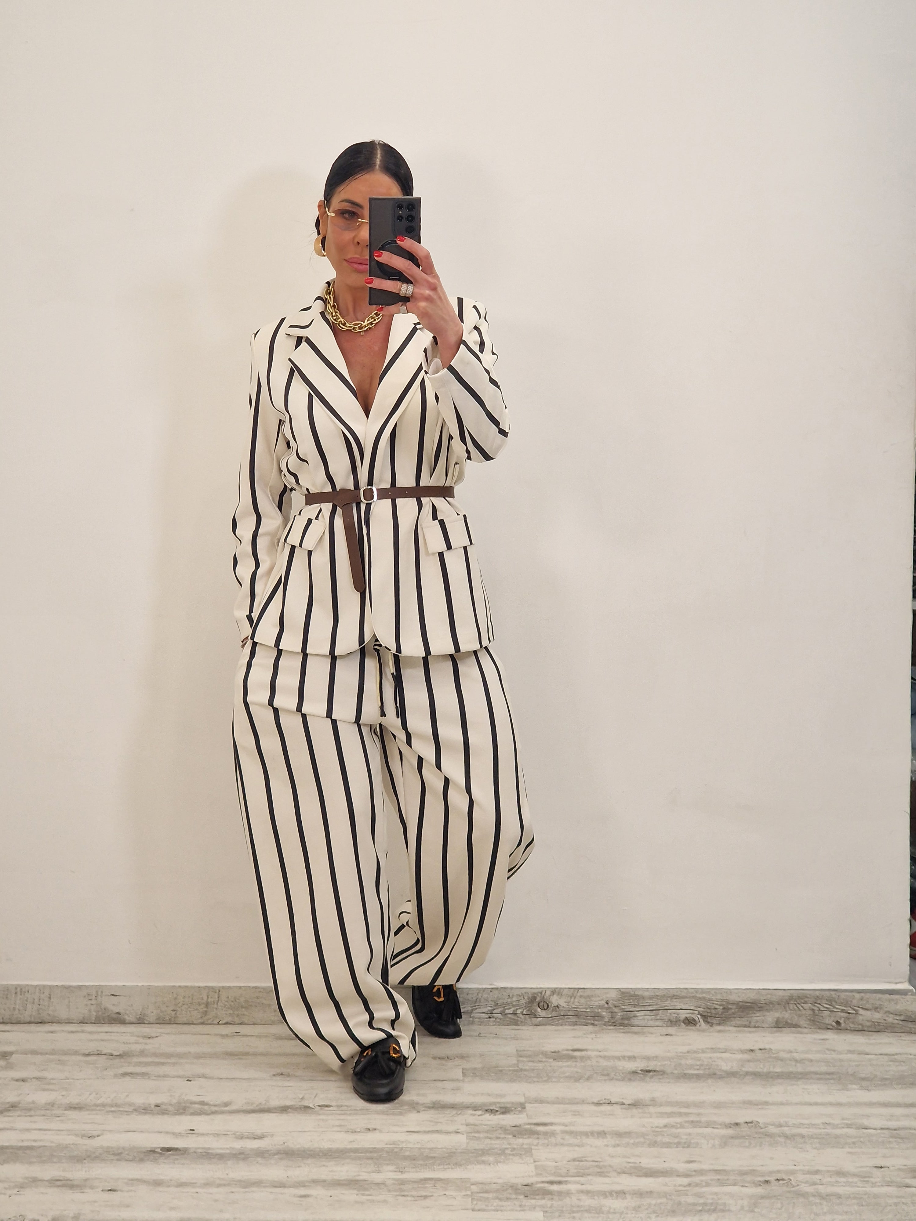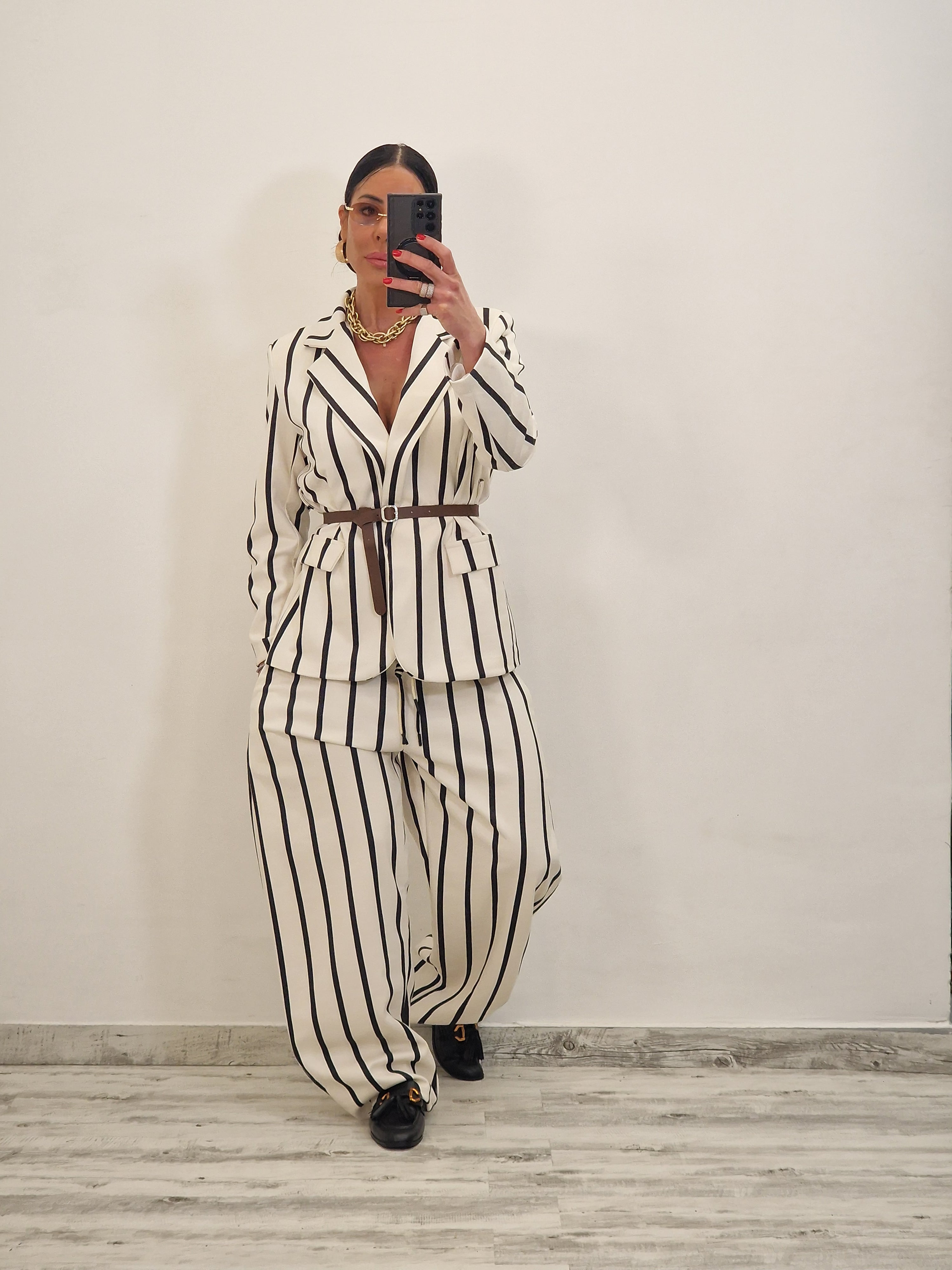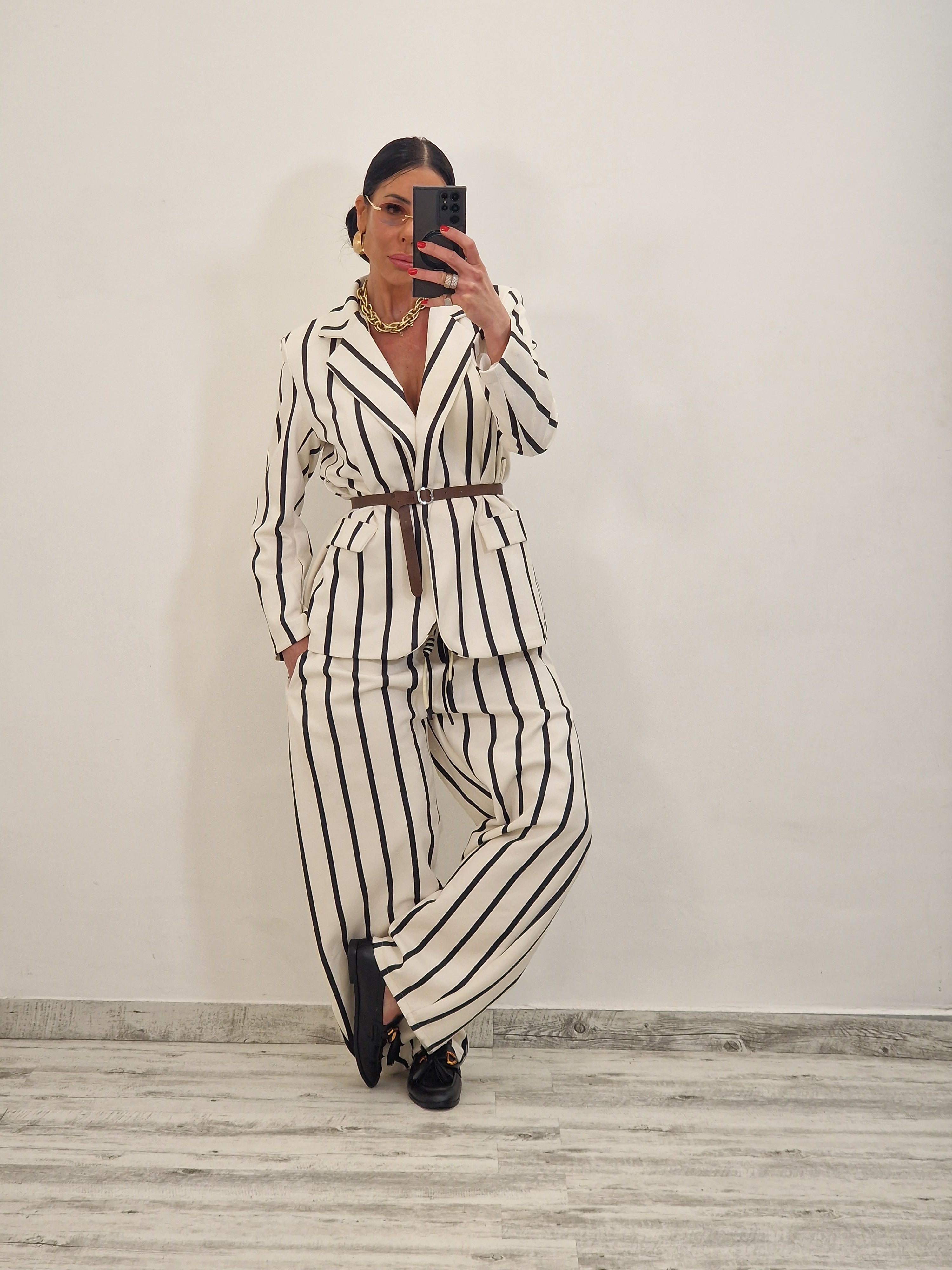 Coordinato a righe effetto SOFT TOUCH composto da giacca con cintura cuoio