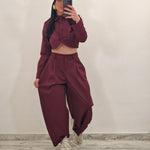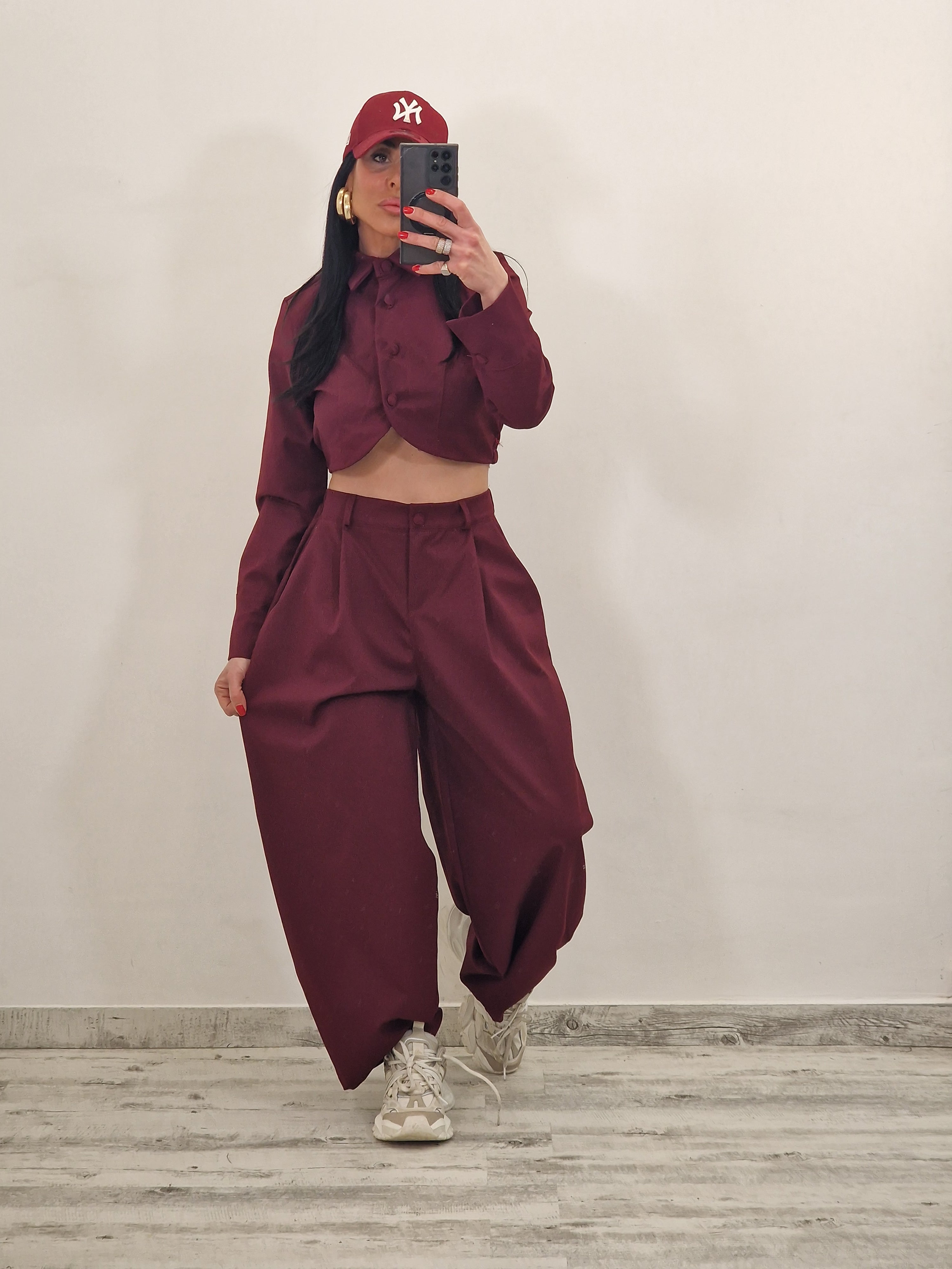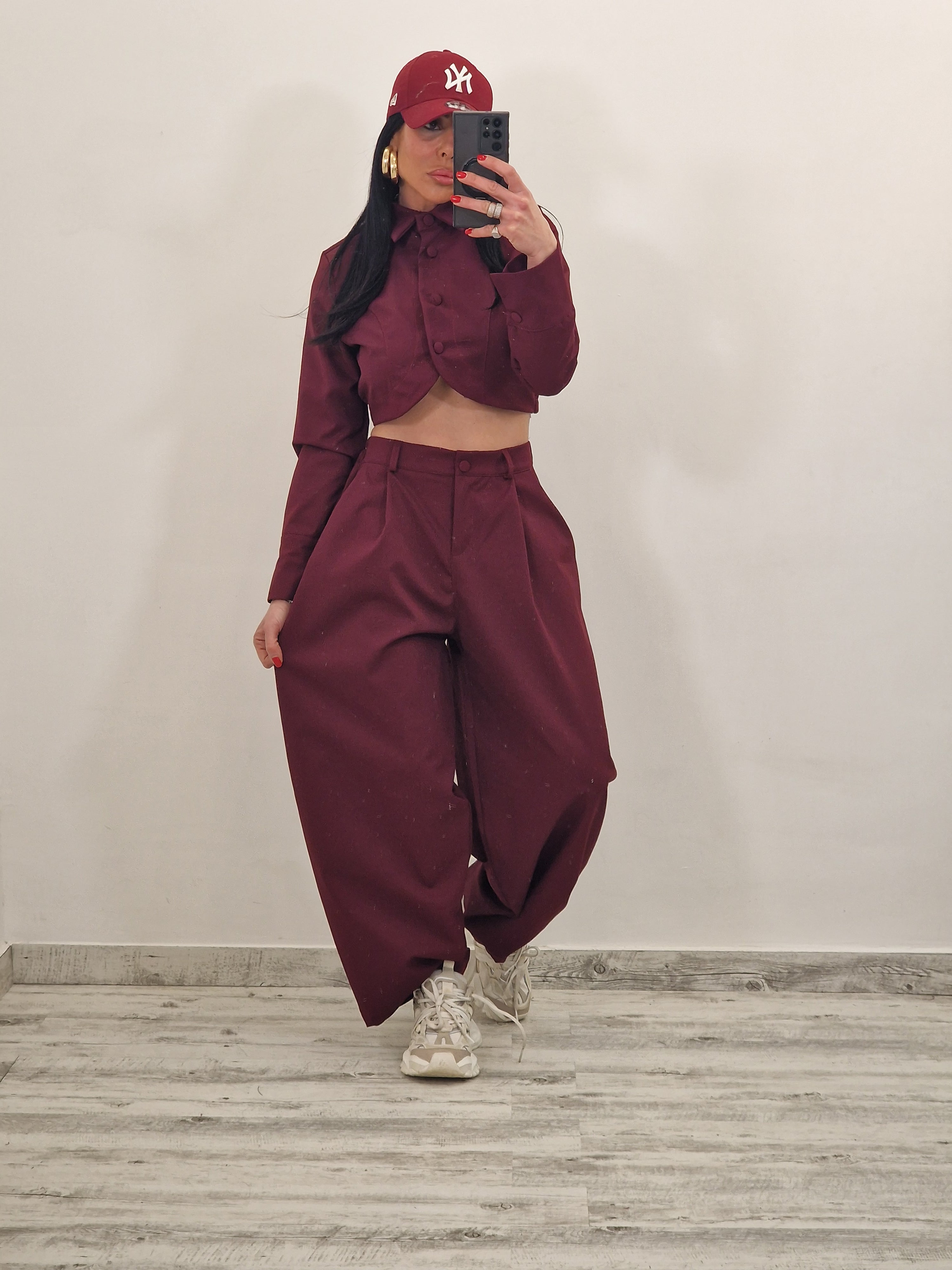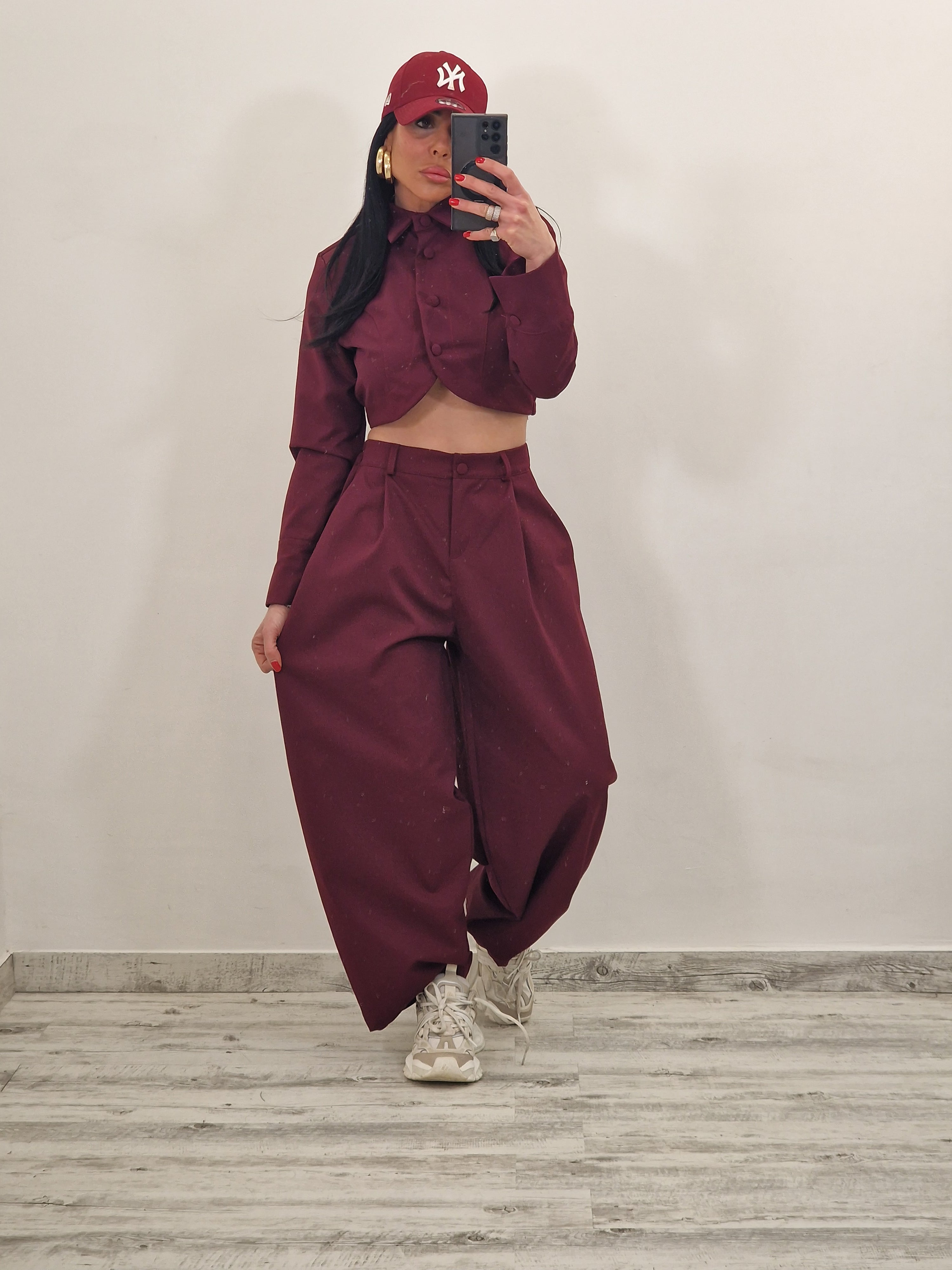 Coordinato composto da giacca crop con bottoni rivestiti e pantalone con bottone ed elastico con pence.