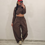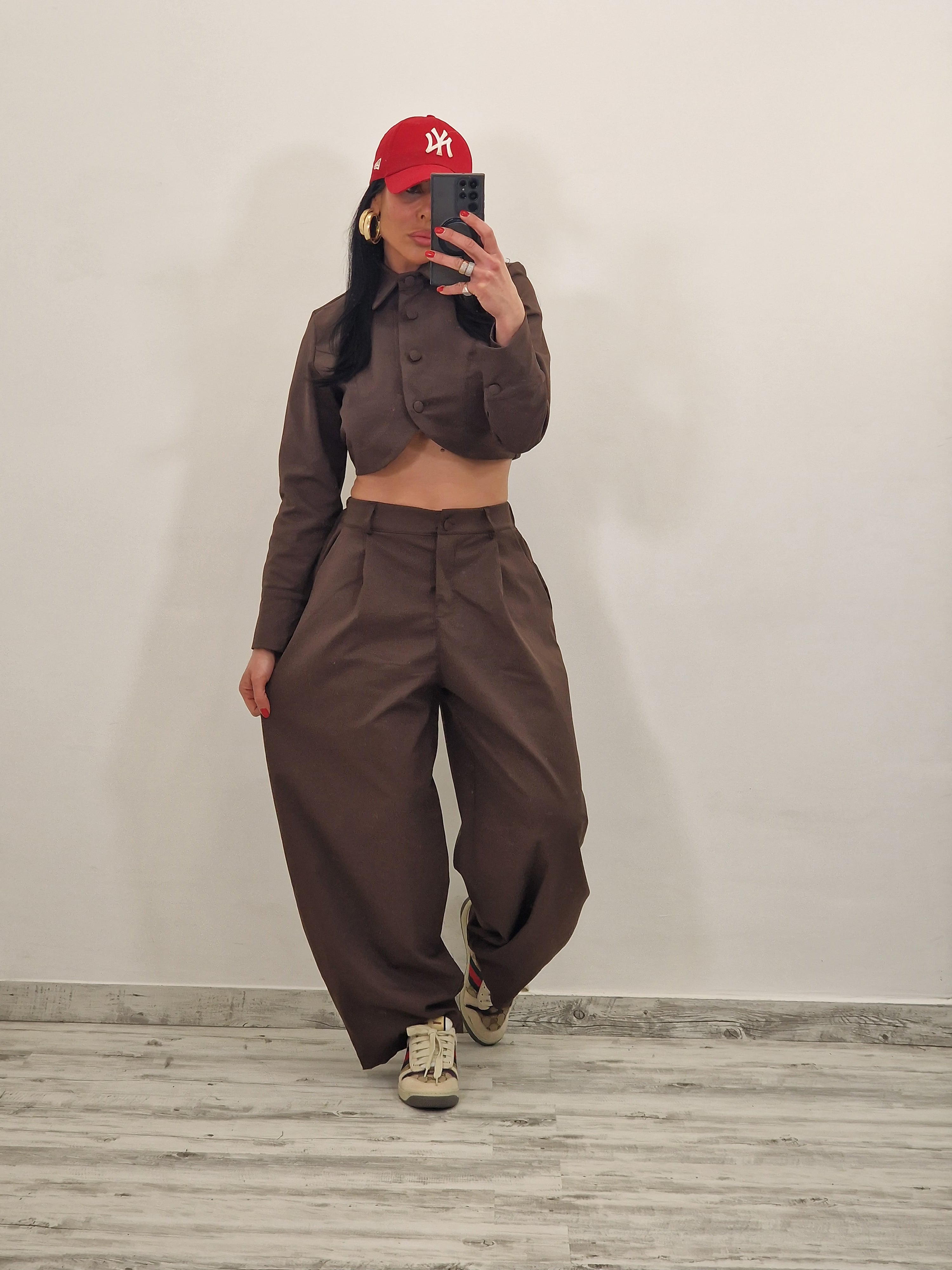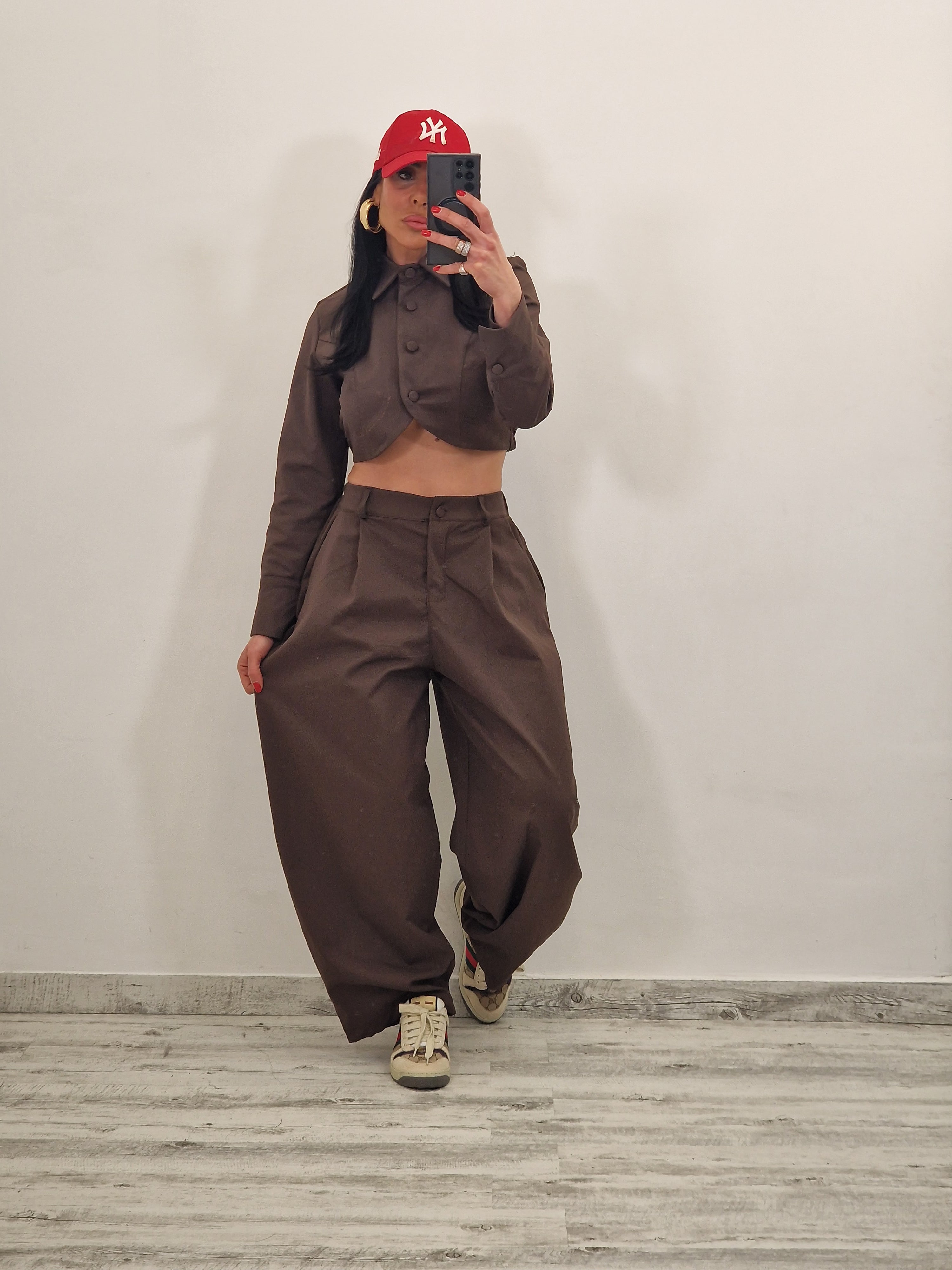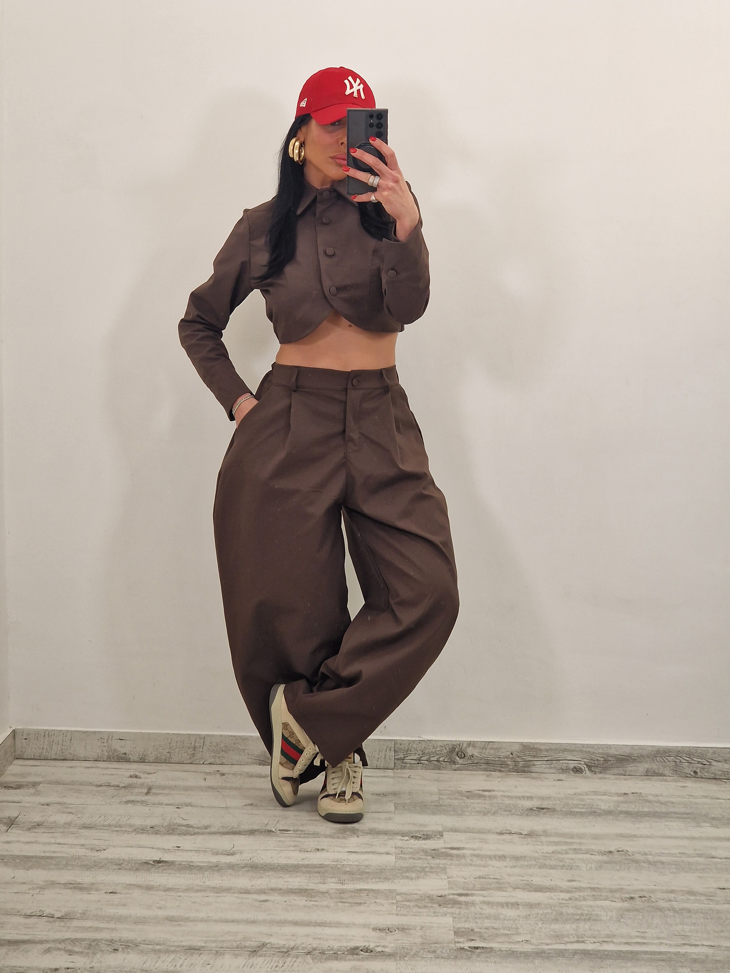 Coordinato composto da giacca crop con bottoni rivestiti e pantalone con bottone ed elastico con pence.
