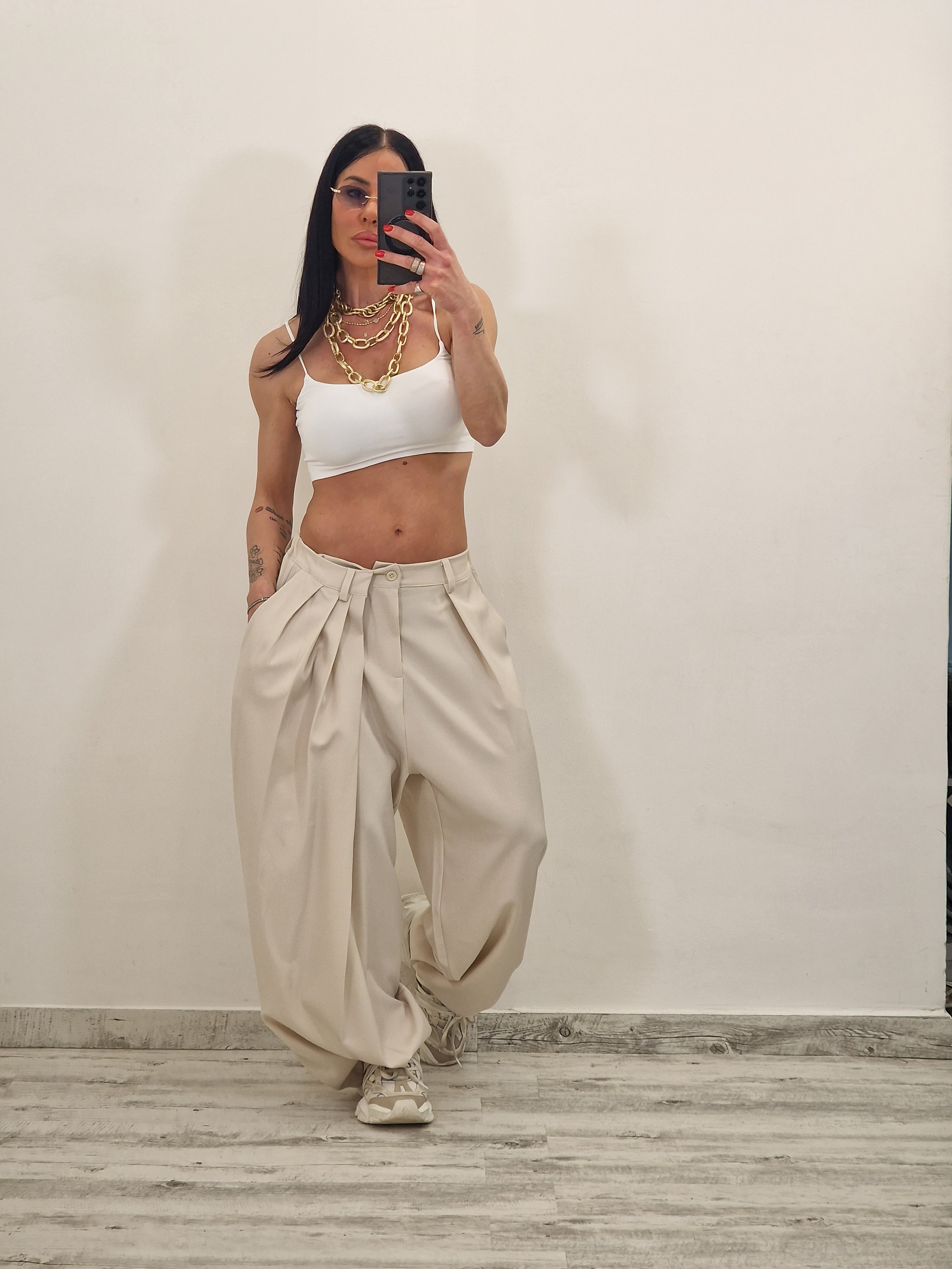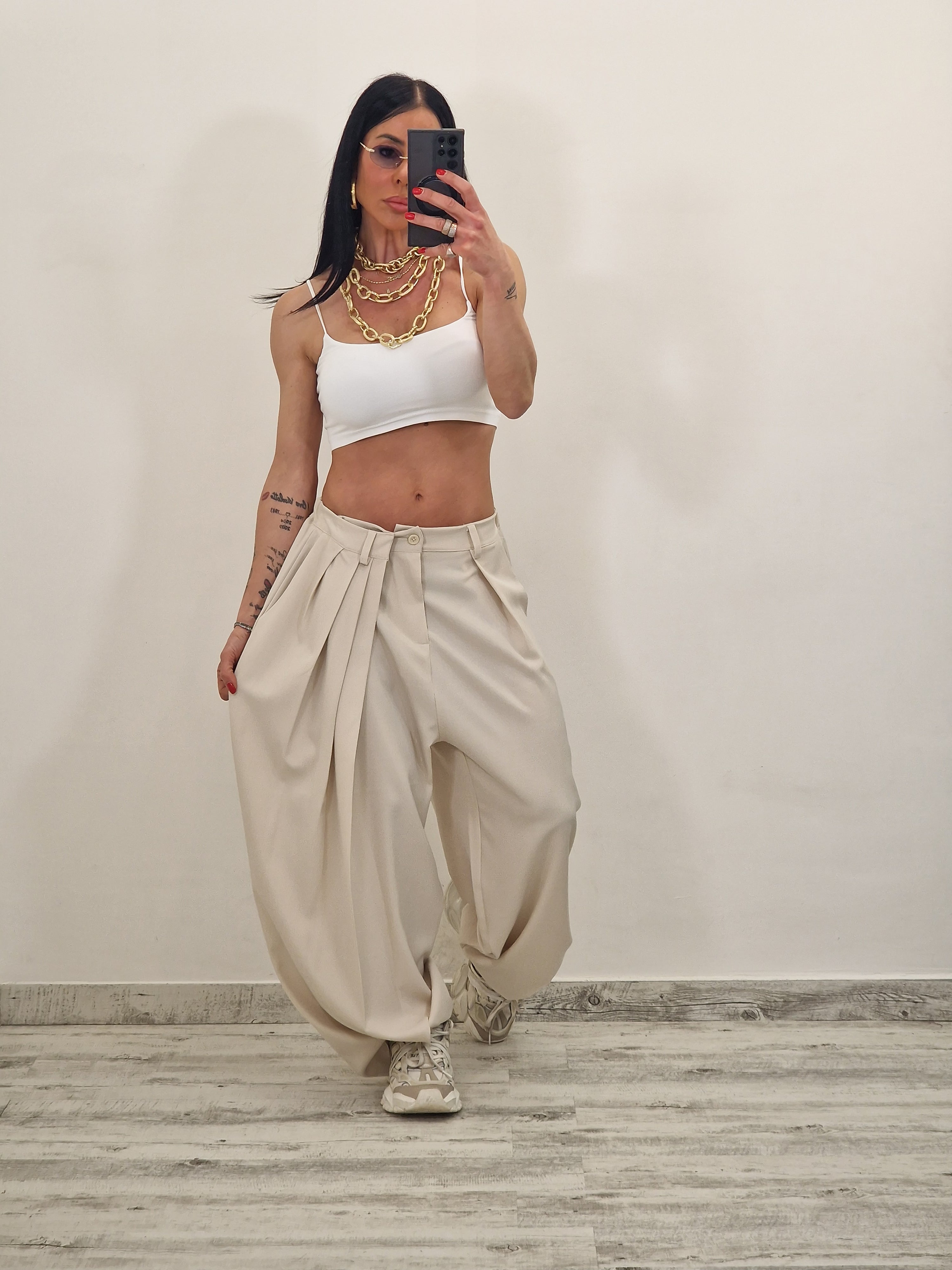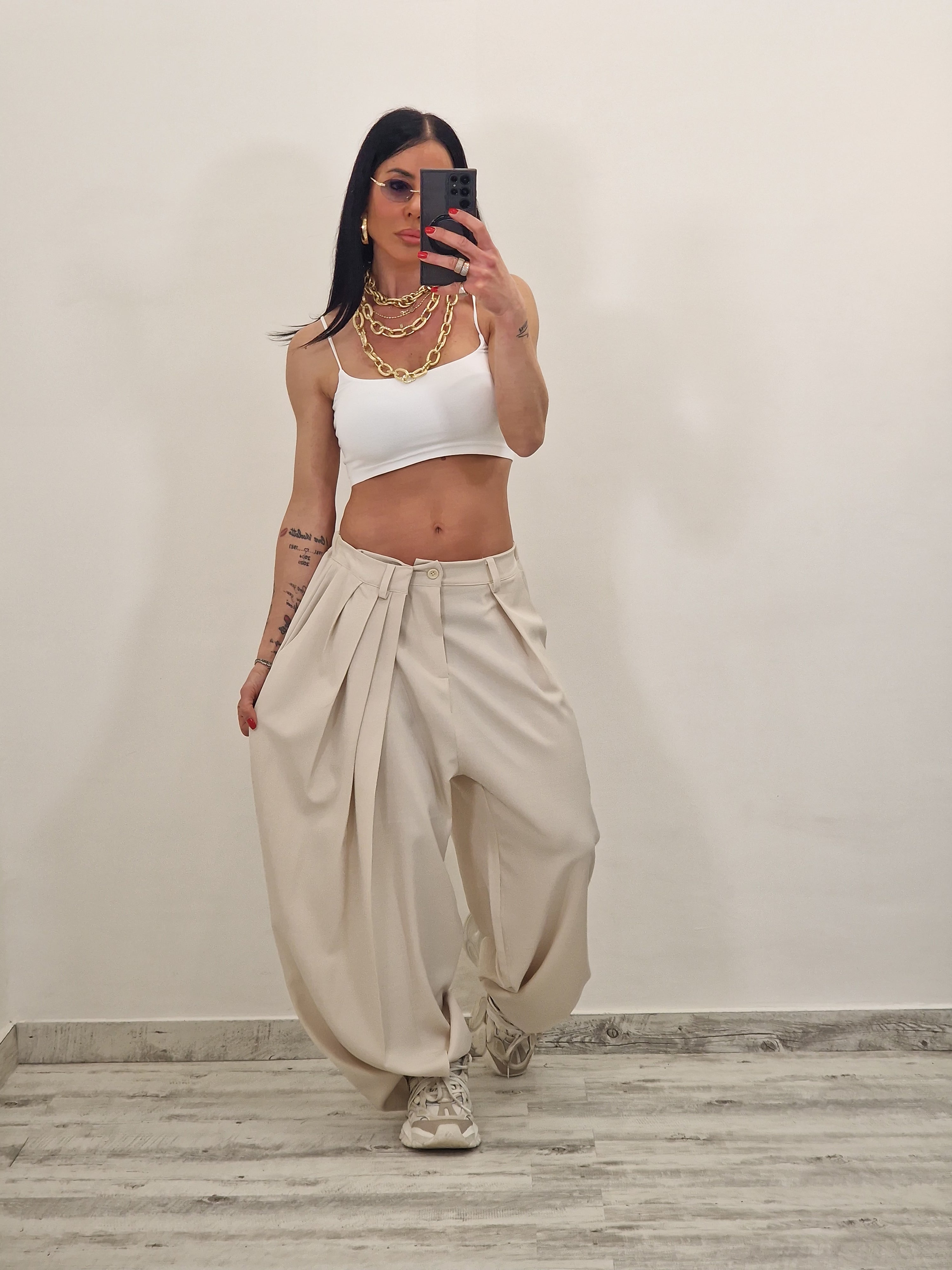 E IL PANTALONE MODELLO BALLOON CON PENCE