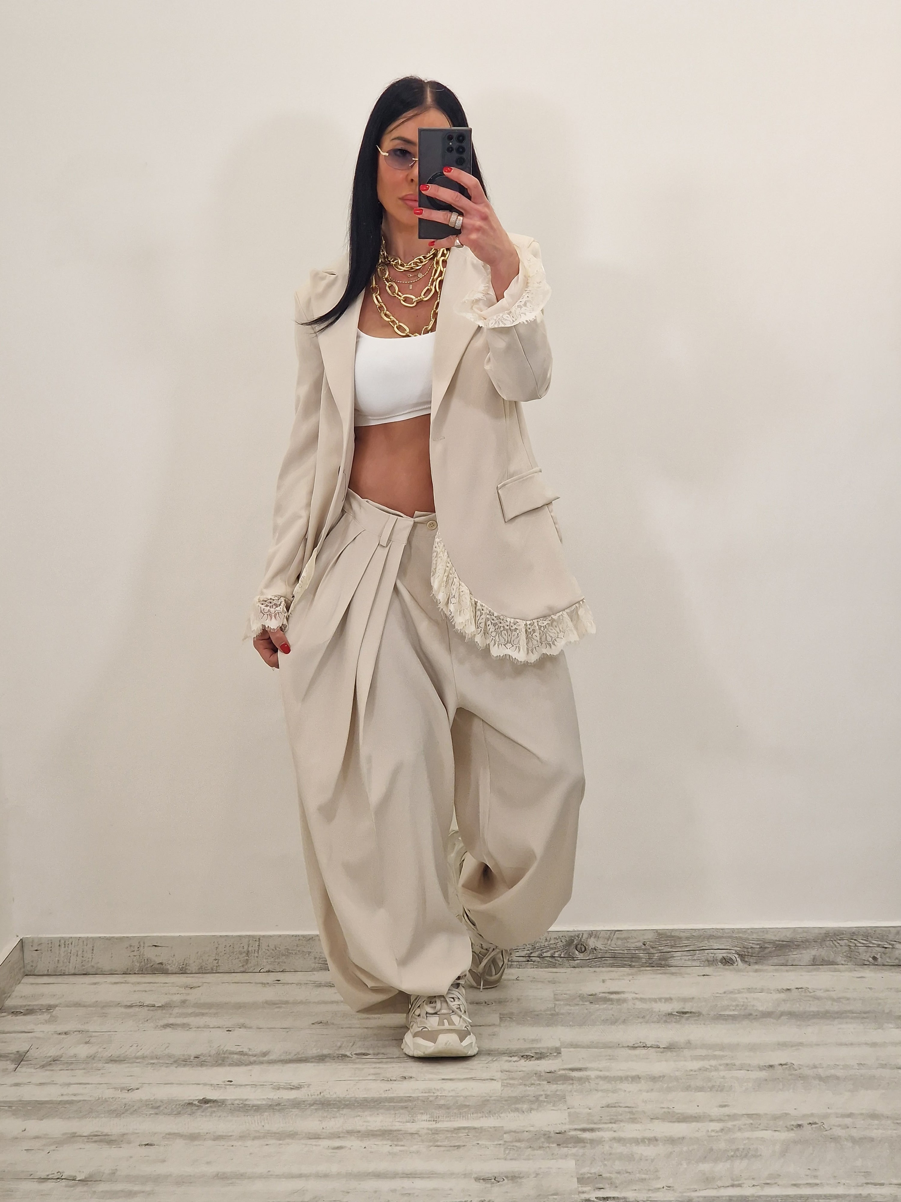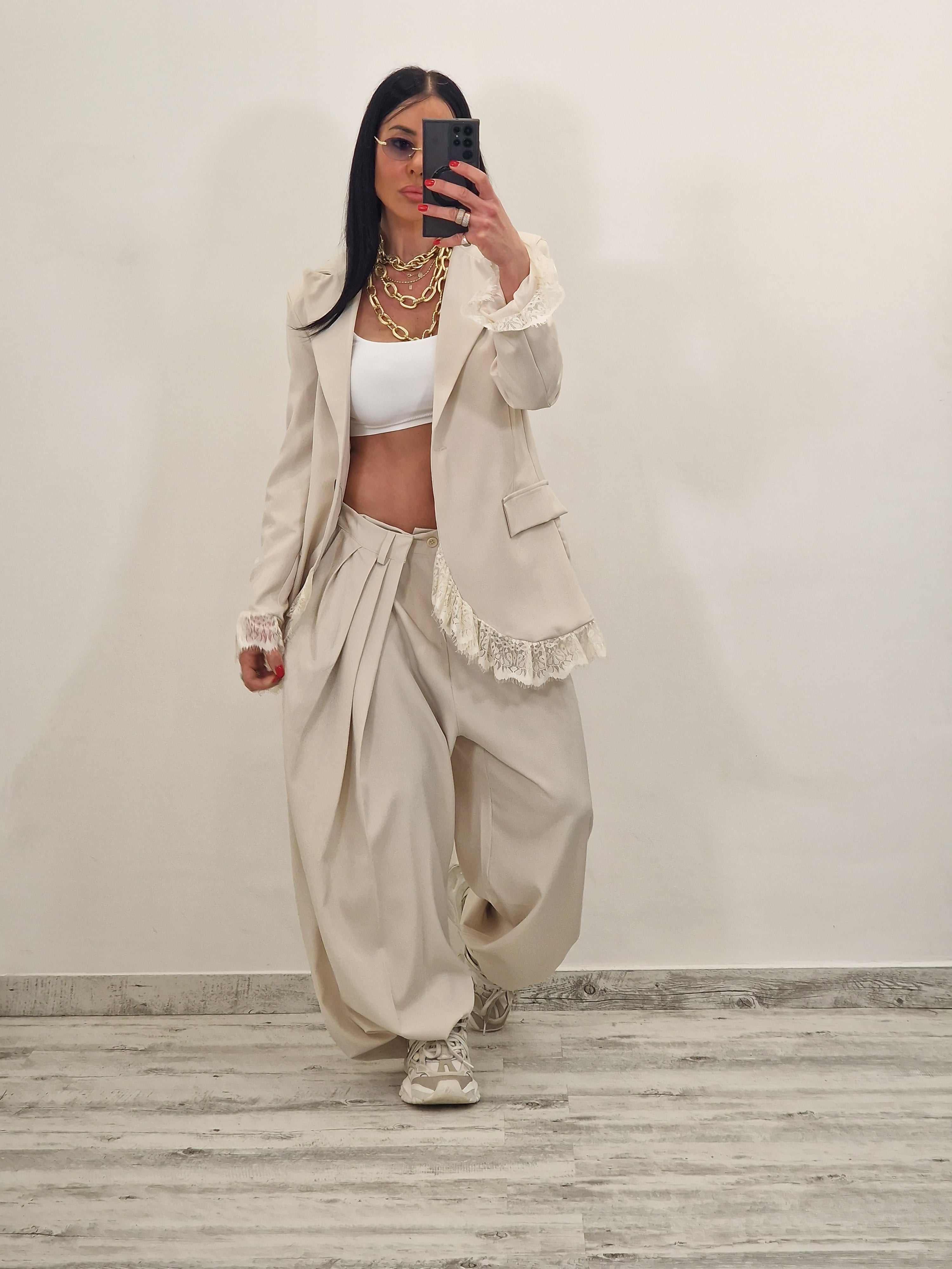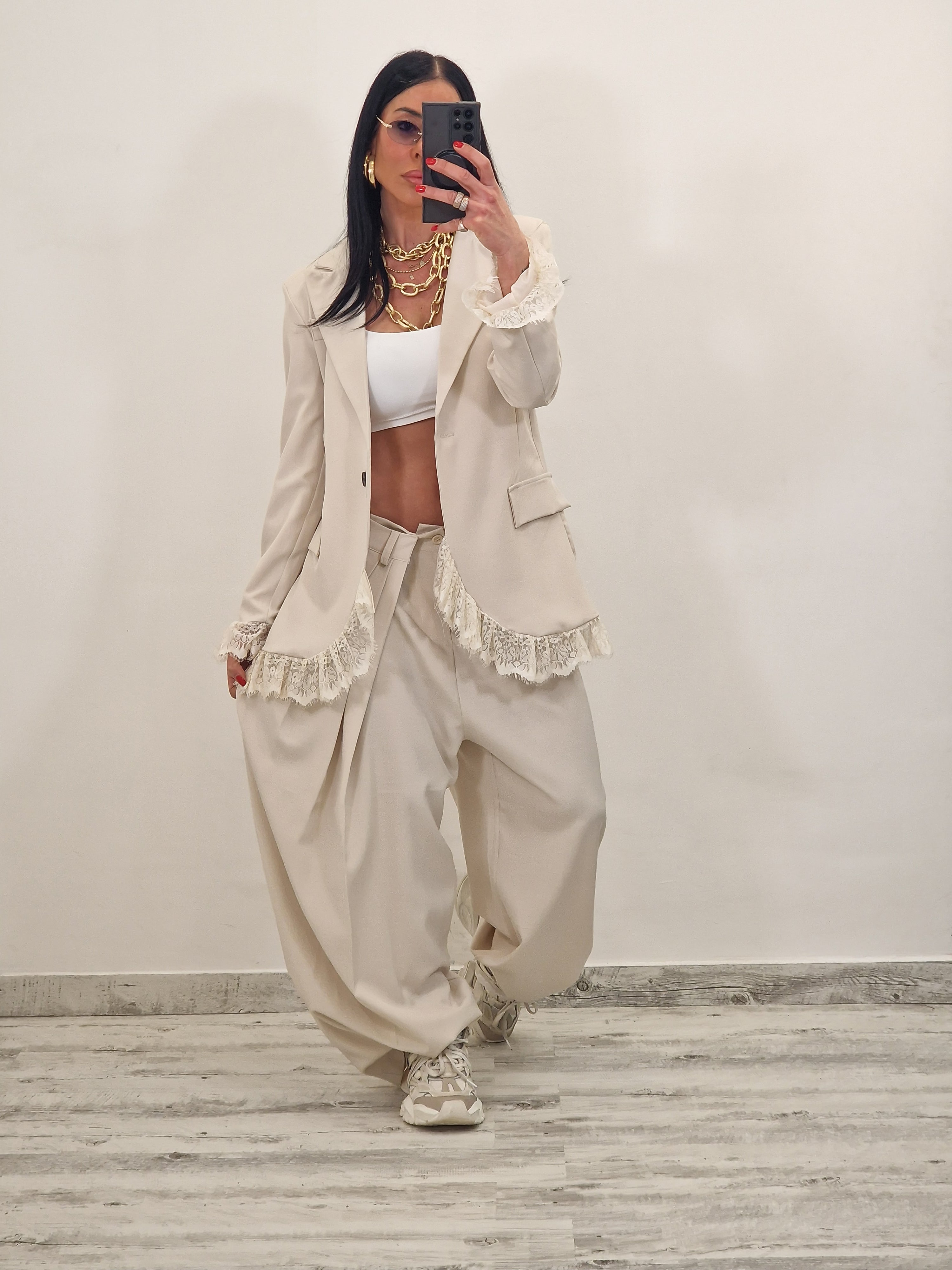 Coordinato composto da blazer morbido con pizzo in fondo e sui polsini