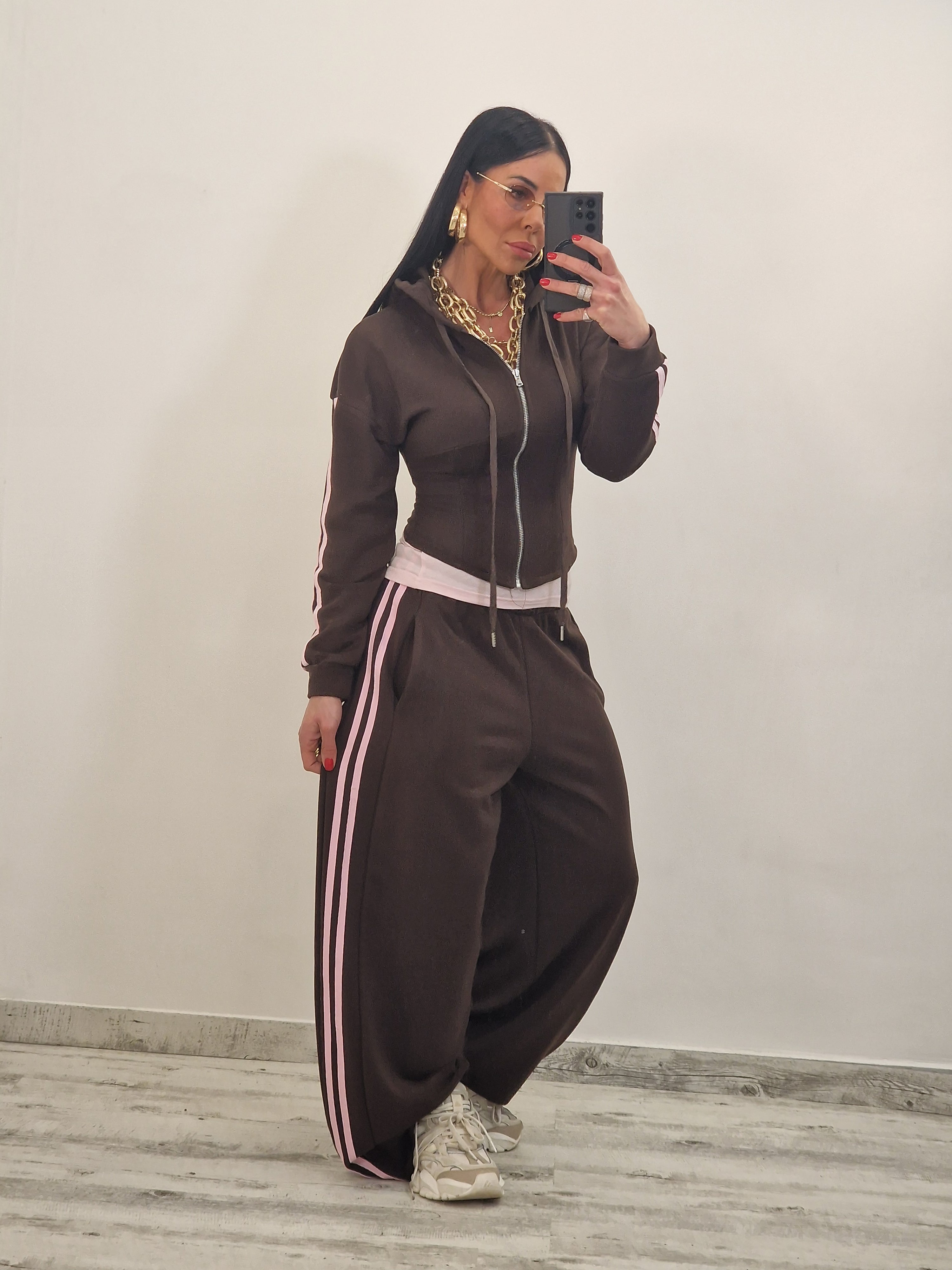 composto da felpa avvitata con cappuccio e zip e pantatuta con elastico