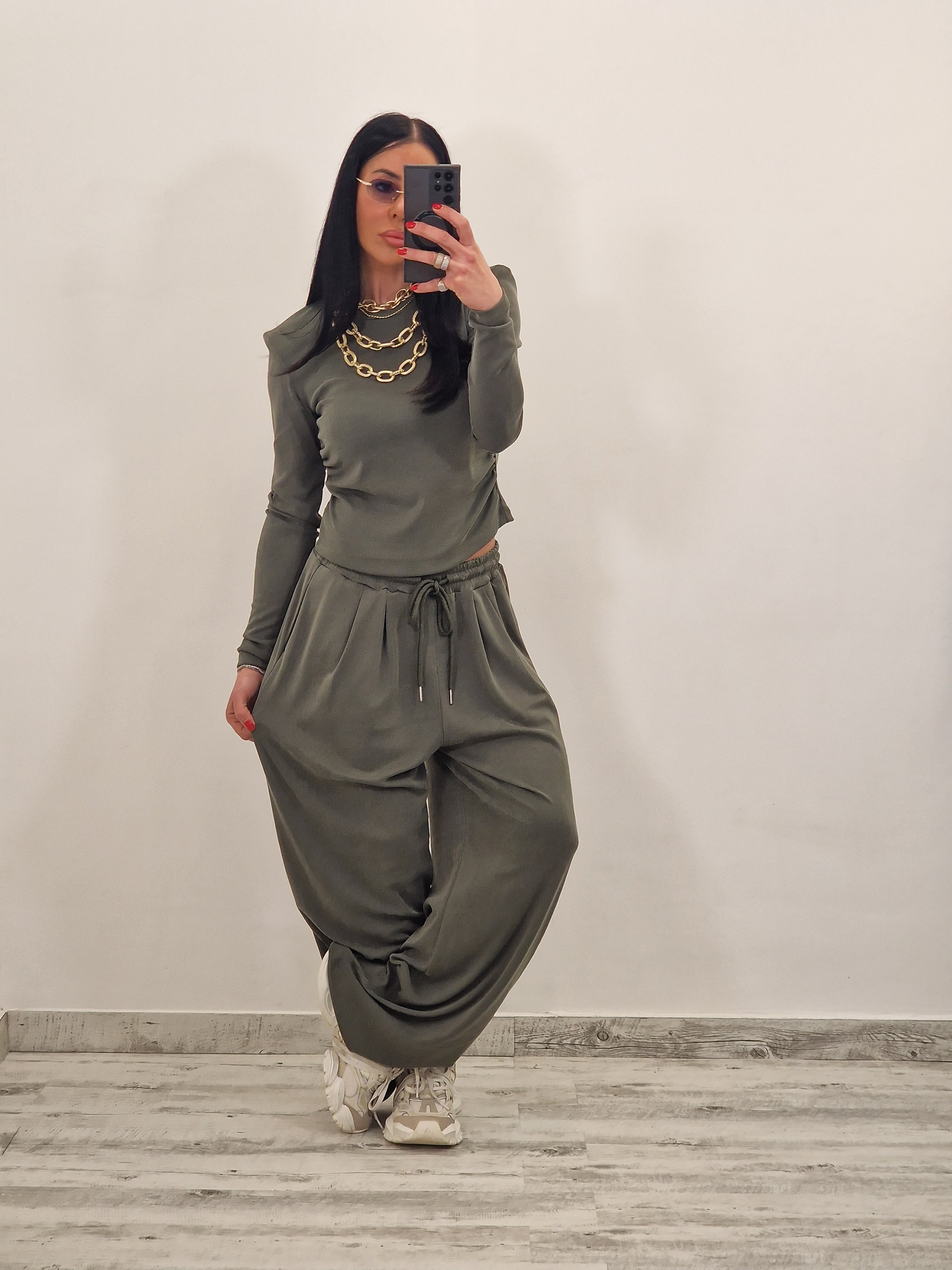 con pantalone morbido  con elastico in vita