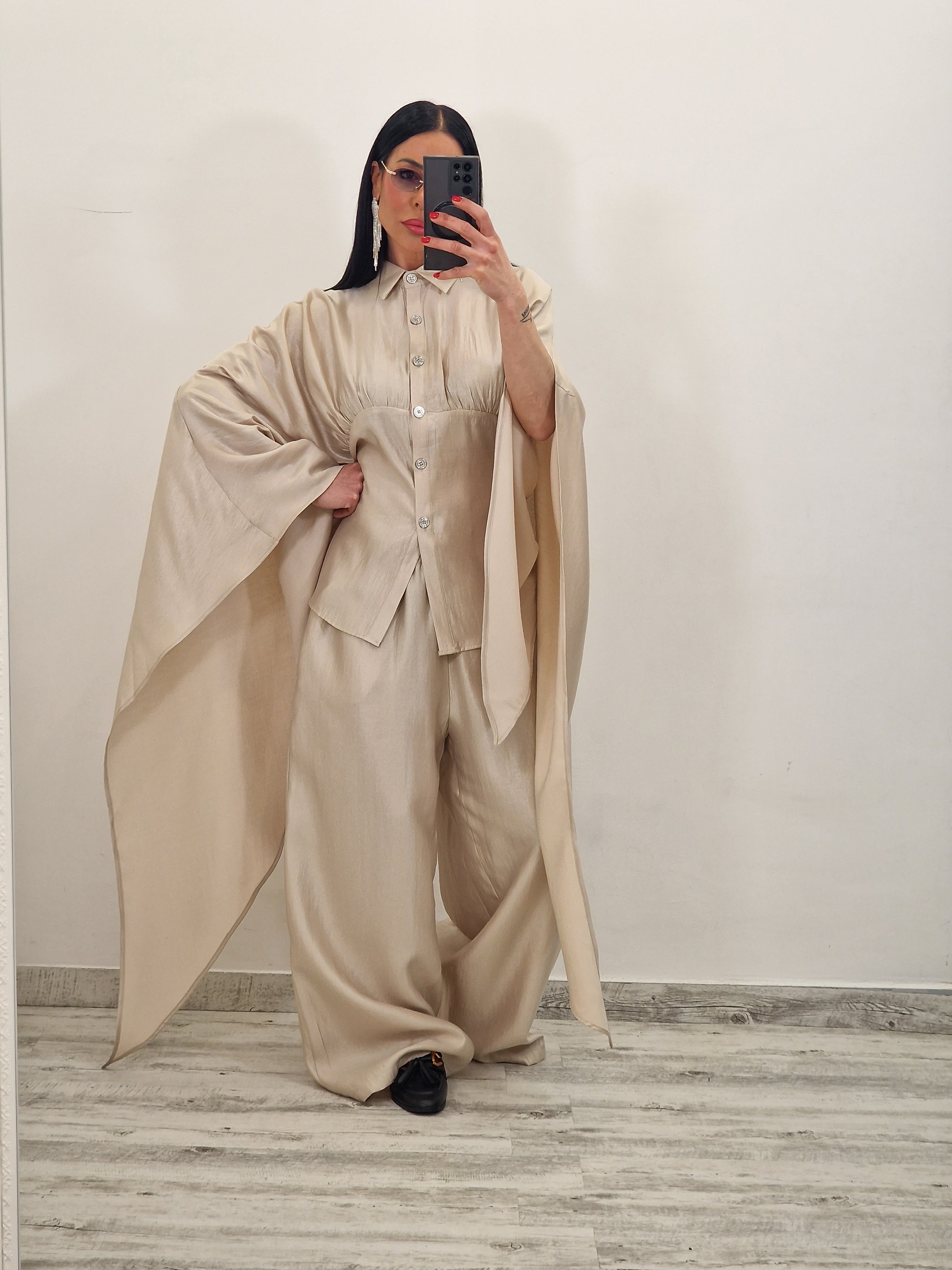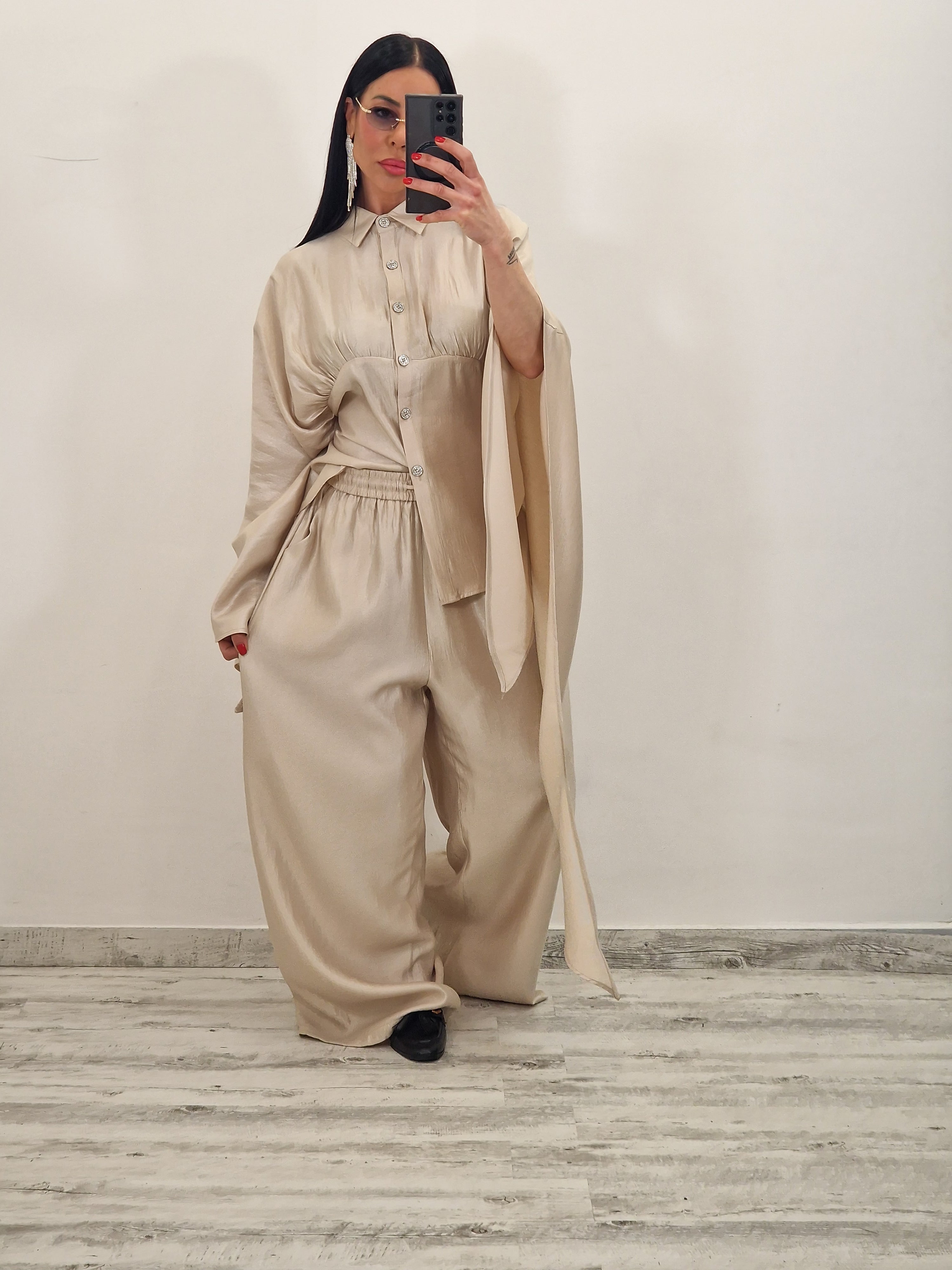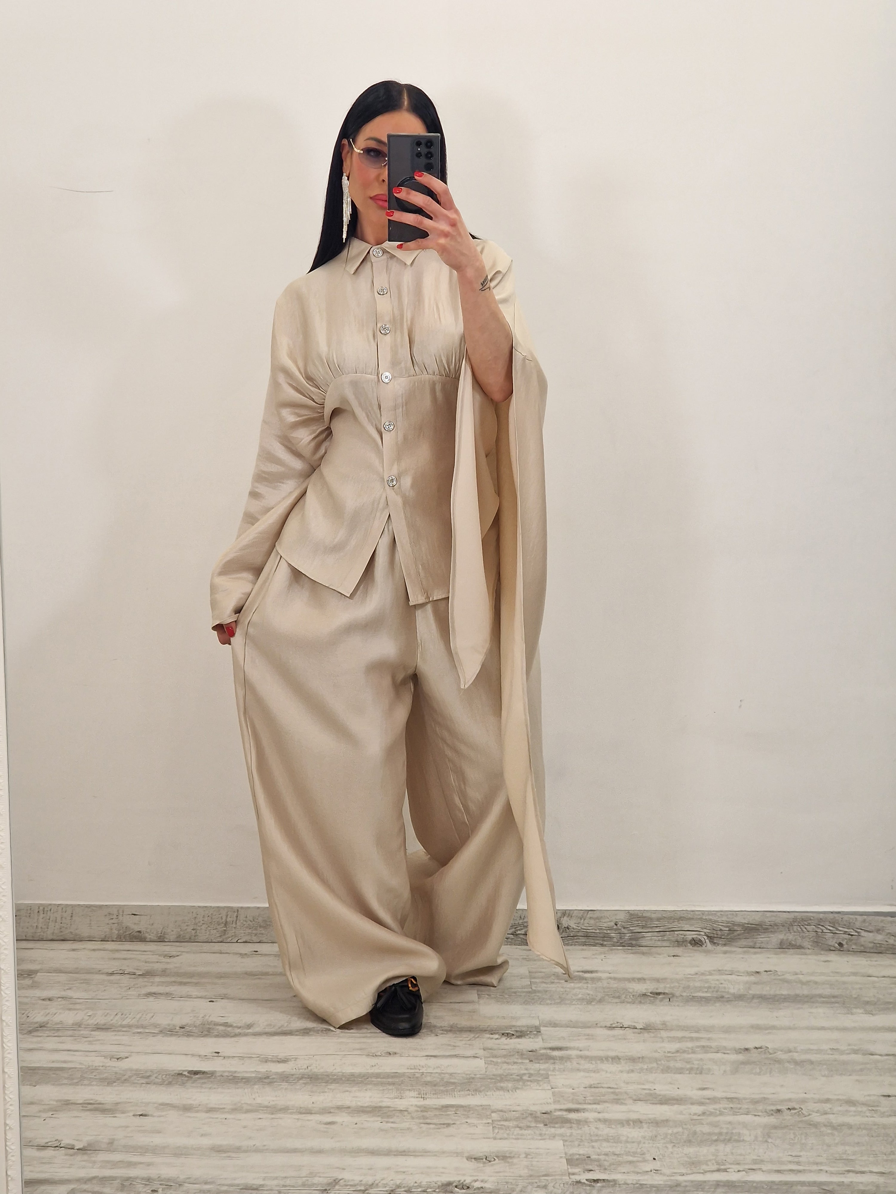 Coordinato sofisticato composto da pantalone a palazzo con elastico in vita effetto laminato e casacca regolabile in vita con lacci che partano dal girovita e si chiudono dietro, impreziosita da bottoni ricoperti di Swarovski. Un mix perfetto di luce, movimento e dettagli preziosi, ideale per occasioni speciali in cui distinguersi con stile e raffinatezza.