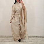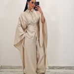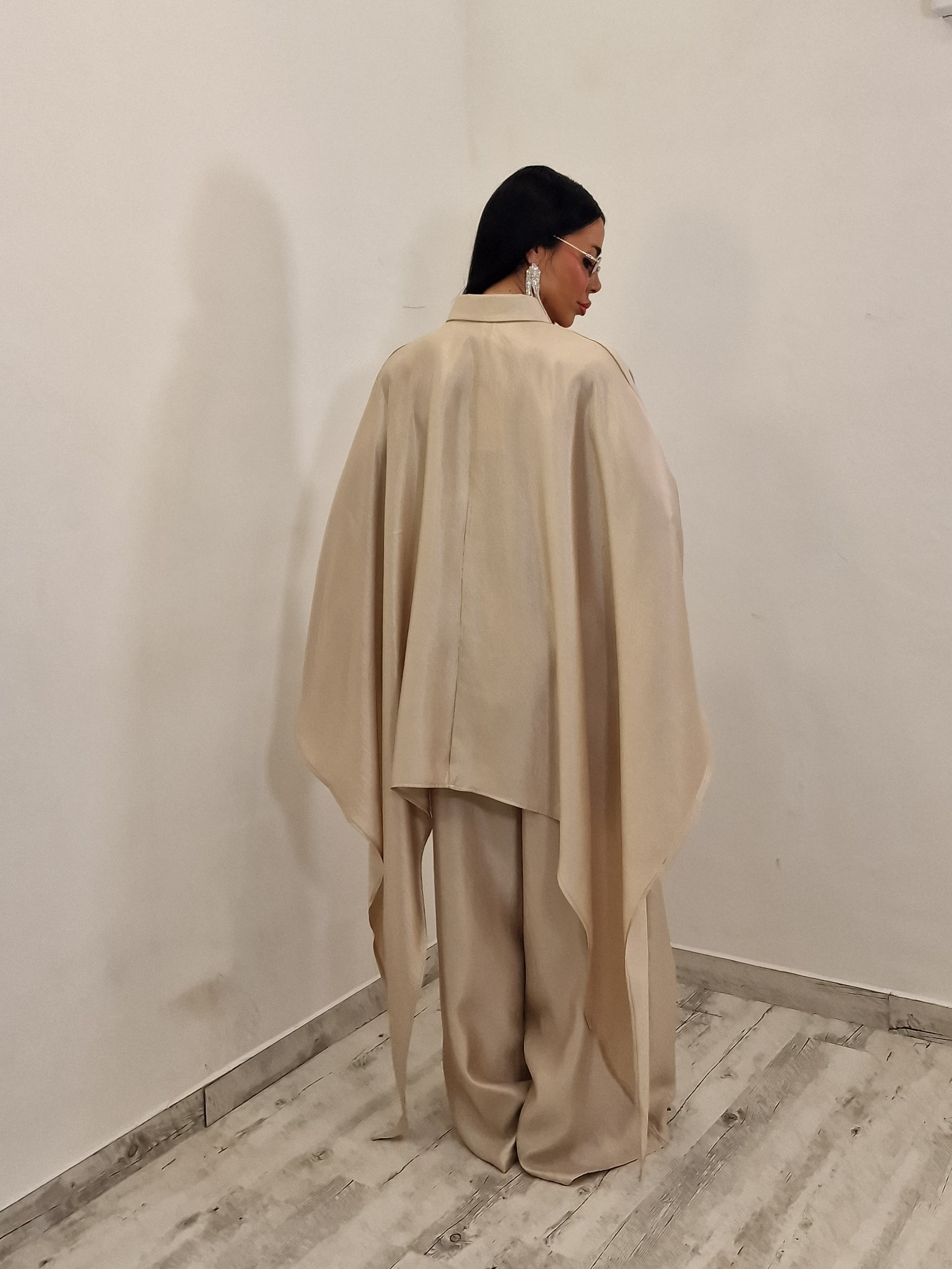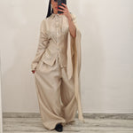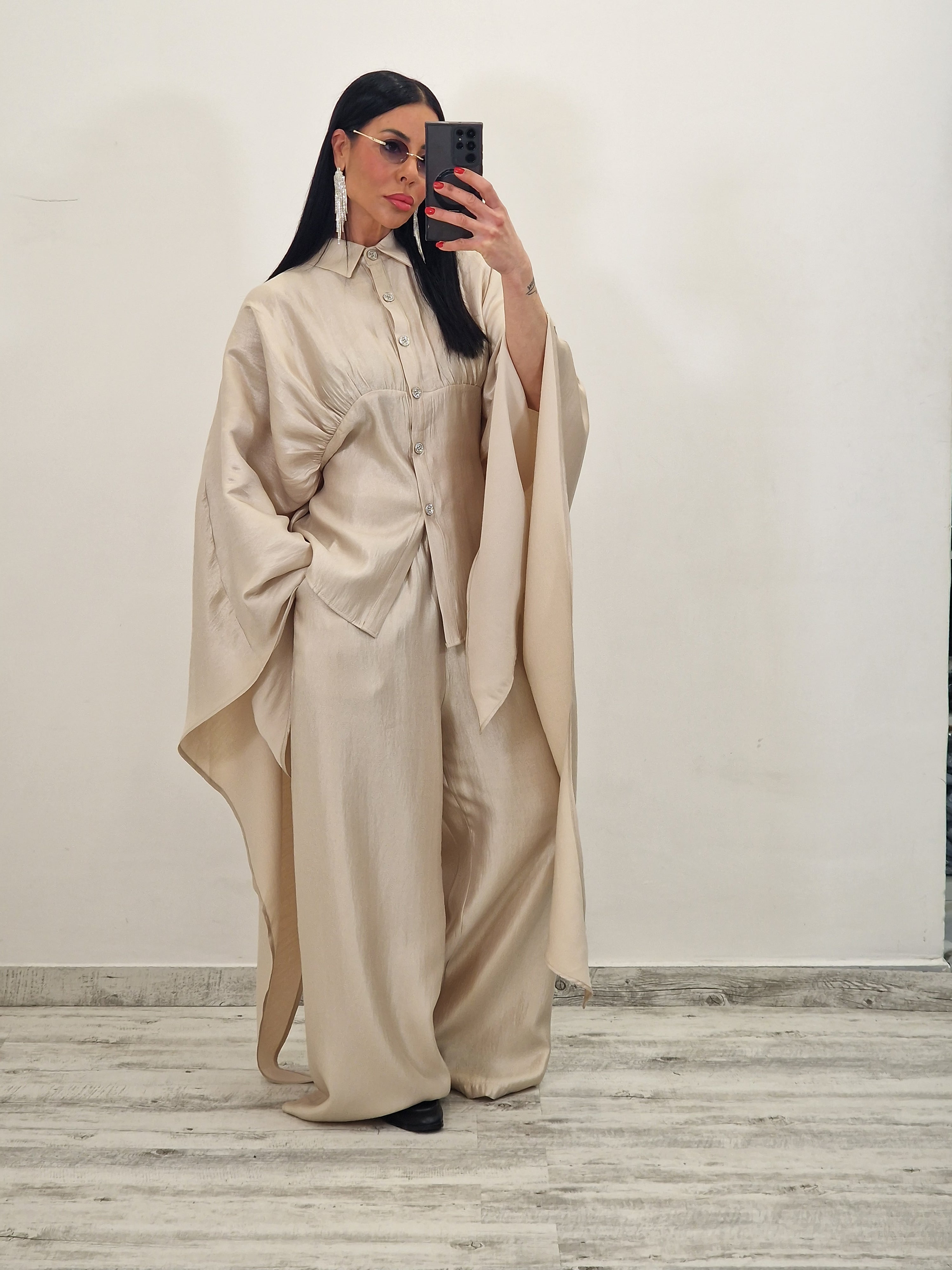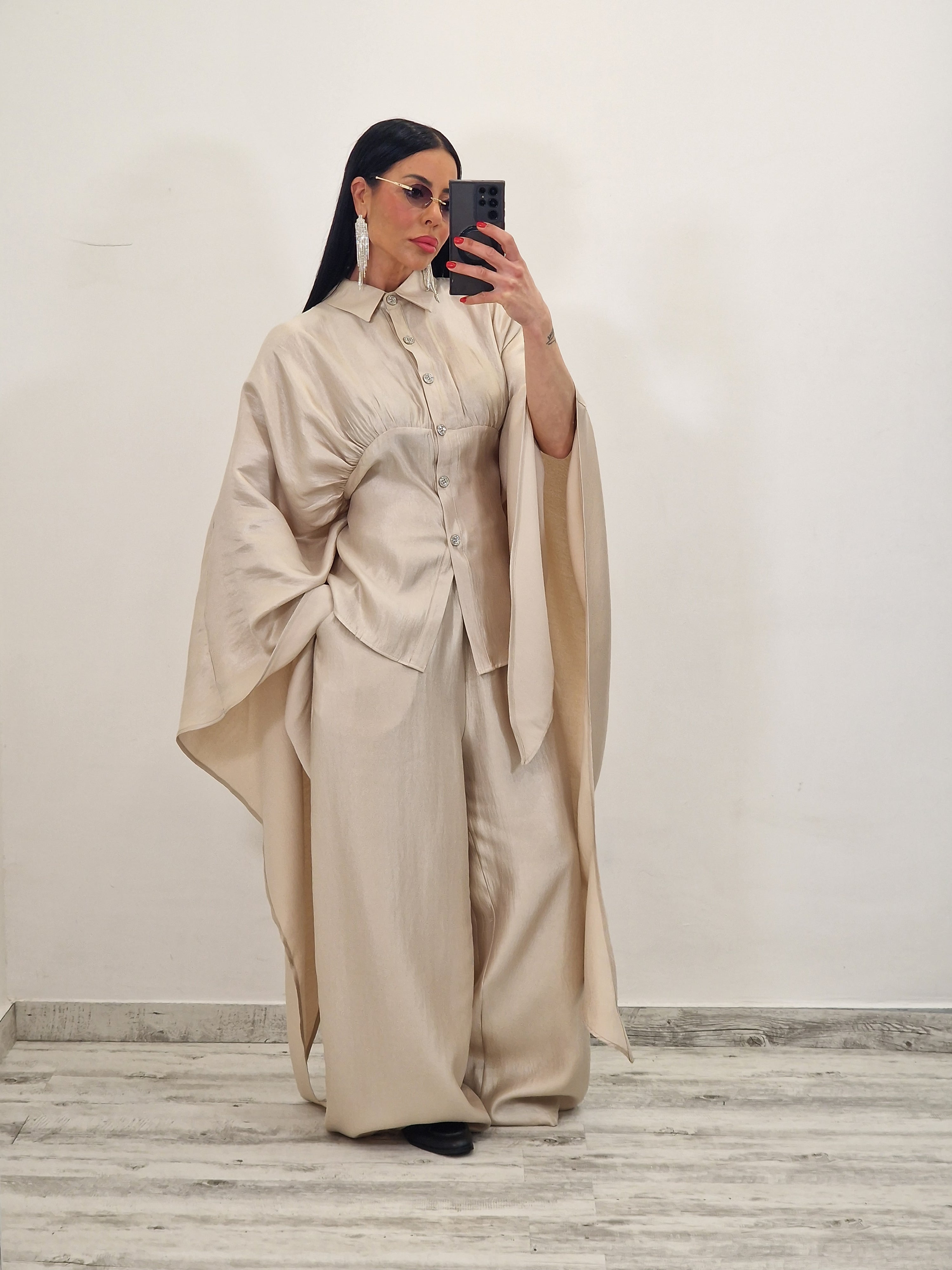 Coordinato sofisticato composto da pantalone a palazzo con elastico in vita effetto laminato e casacca regolabile in vita con lacci che partano dal girovita e si chiudono dietro, impreziosita da bottoni ricoperti di Swarovski. Un mix perfetto di luce, movimento e dettagli preziosi, ideale per occasioni speciali in cui distinguersi con stile e raffinatezza.