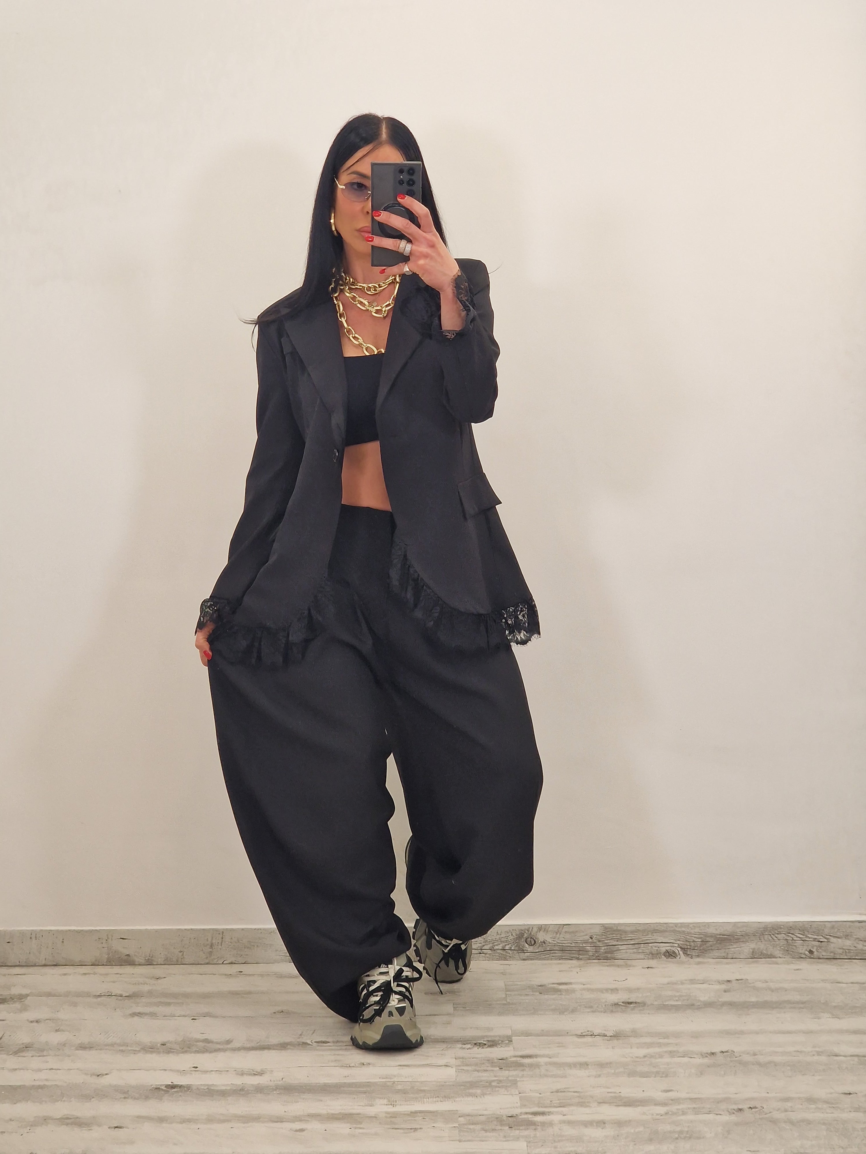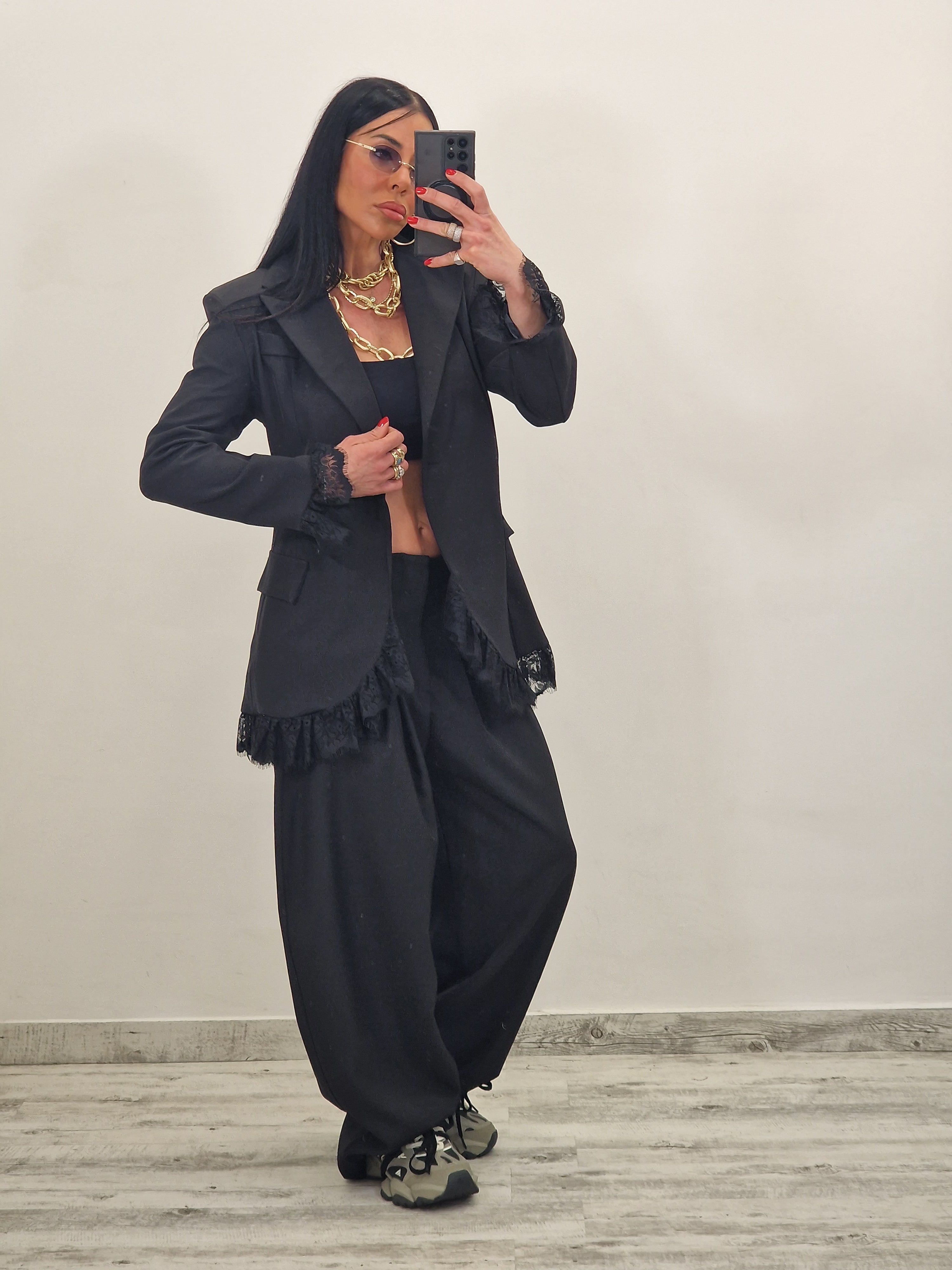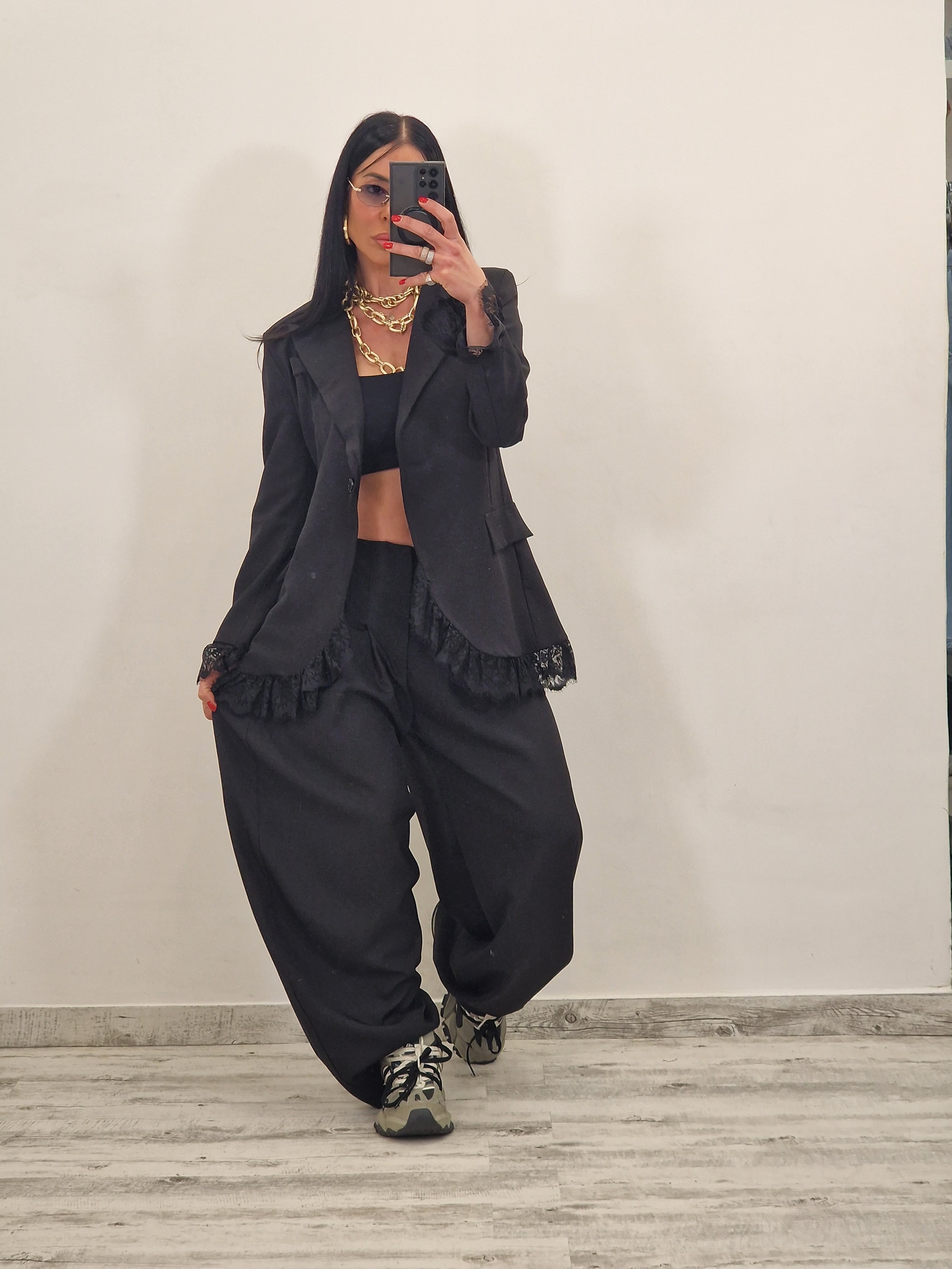 Coordinato composto da blazer morbido con pizzo in fondo e sui polsini