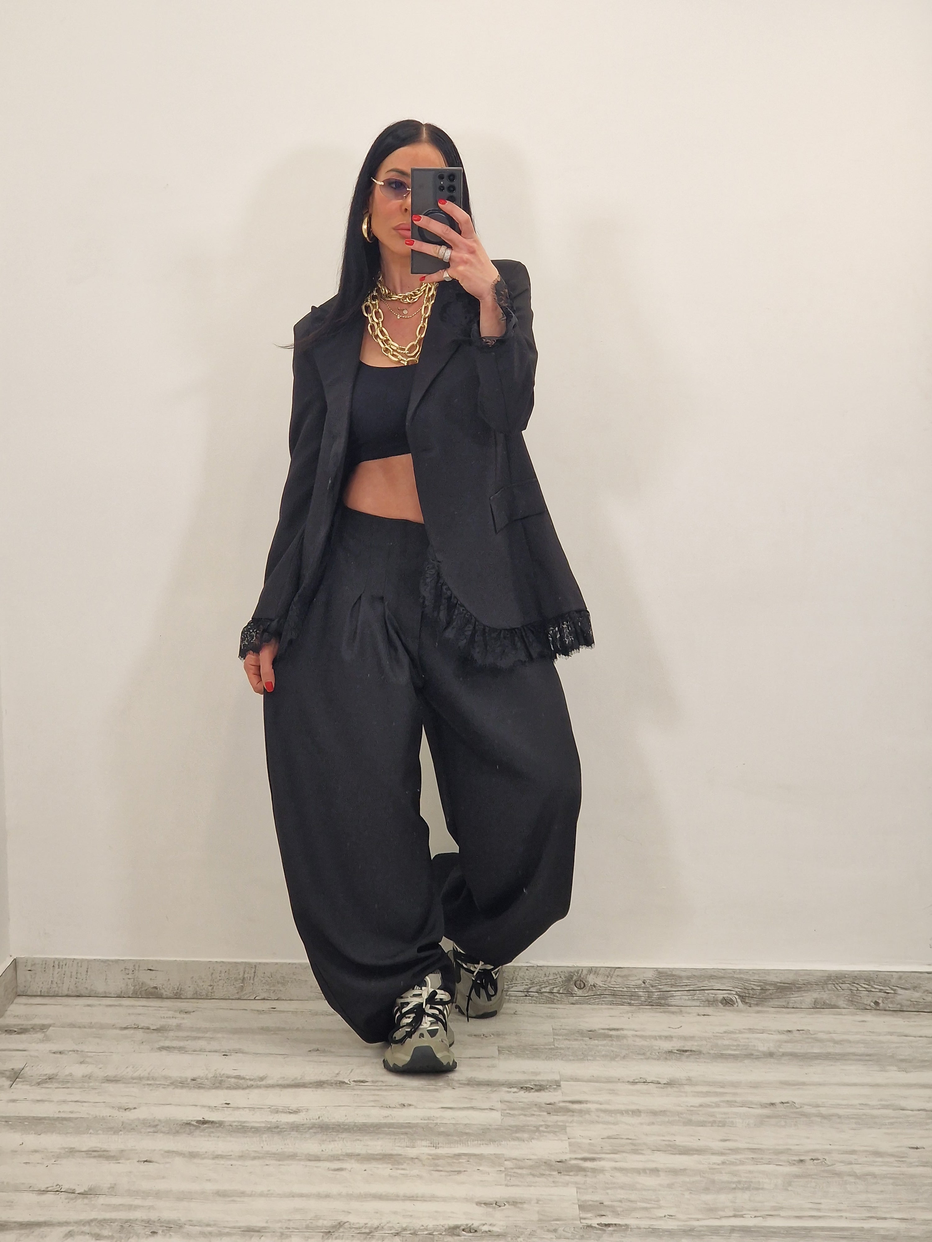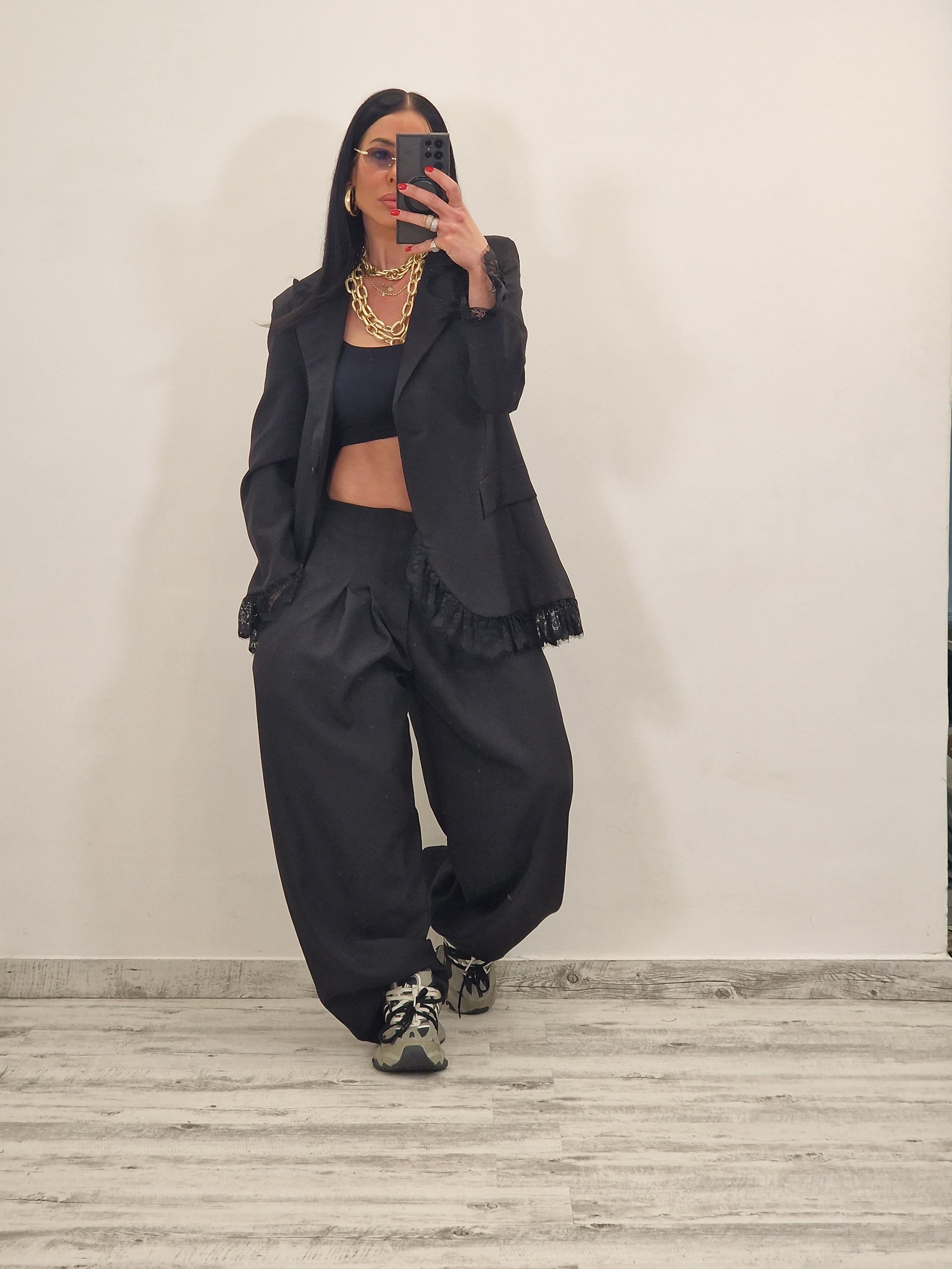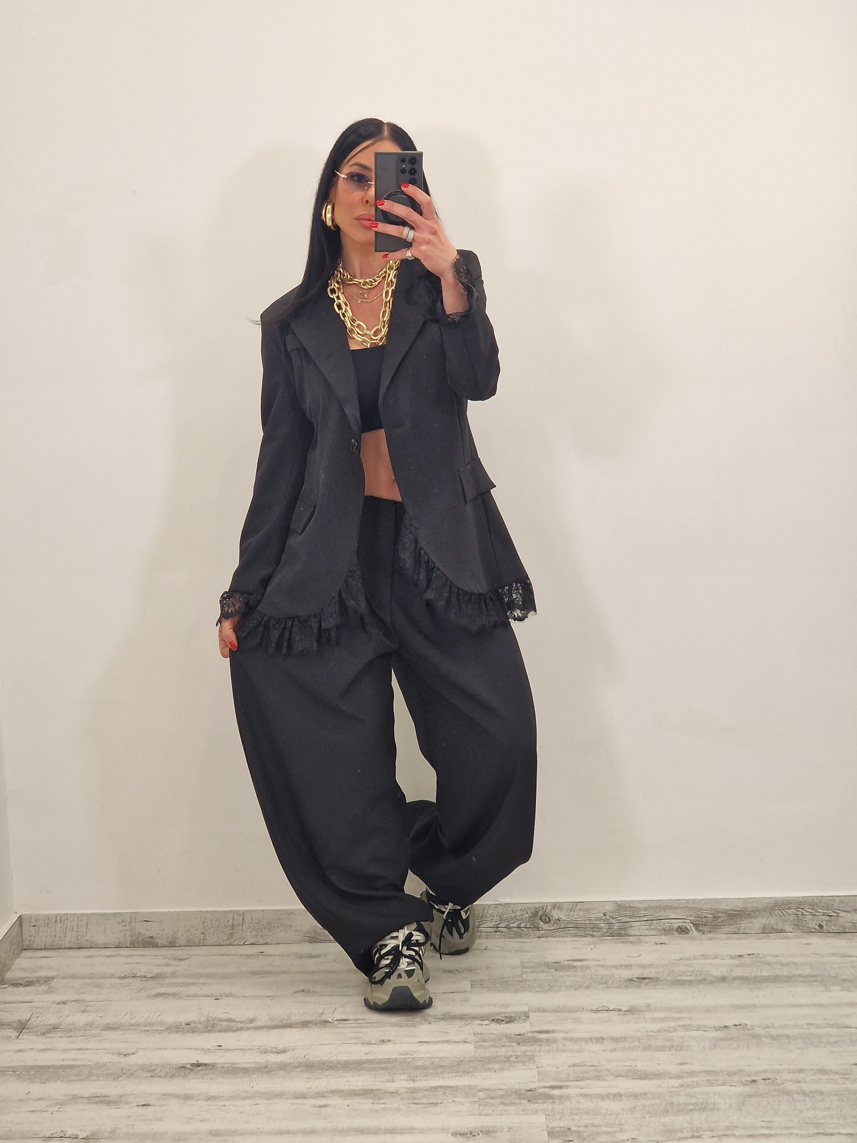 Coordinato composto da blazer morbido con pizzo in fondo e sui polsini