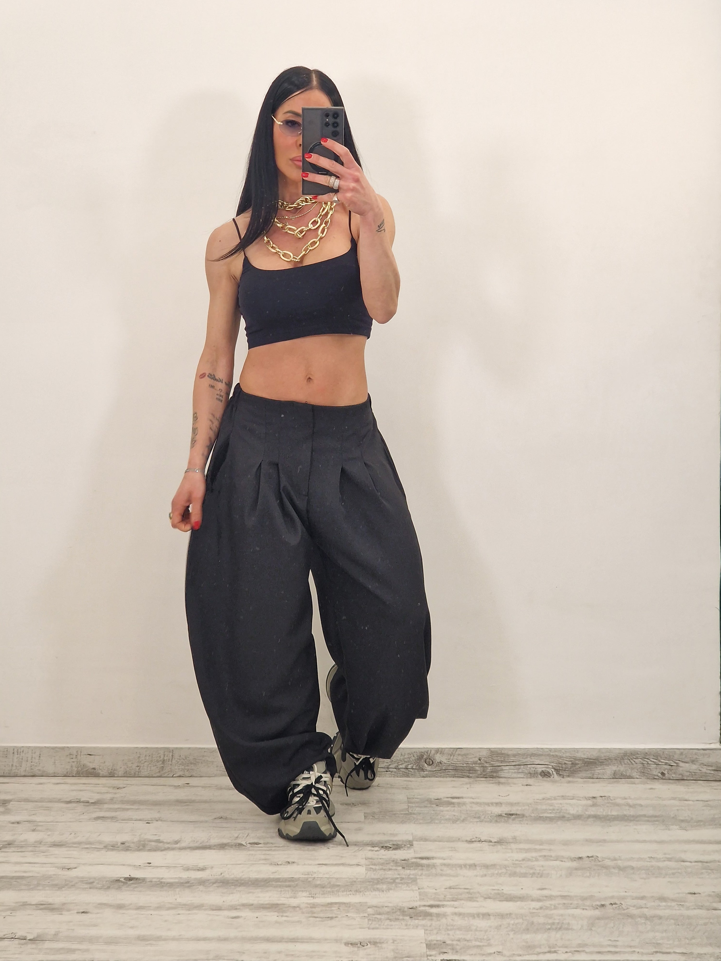 E IL PANTALONE MODELLO BALLOON CON PENCE VITA LEGGERMENTE ALTA
