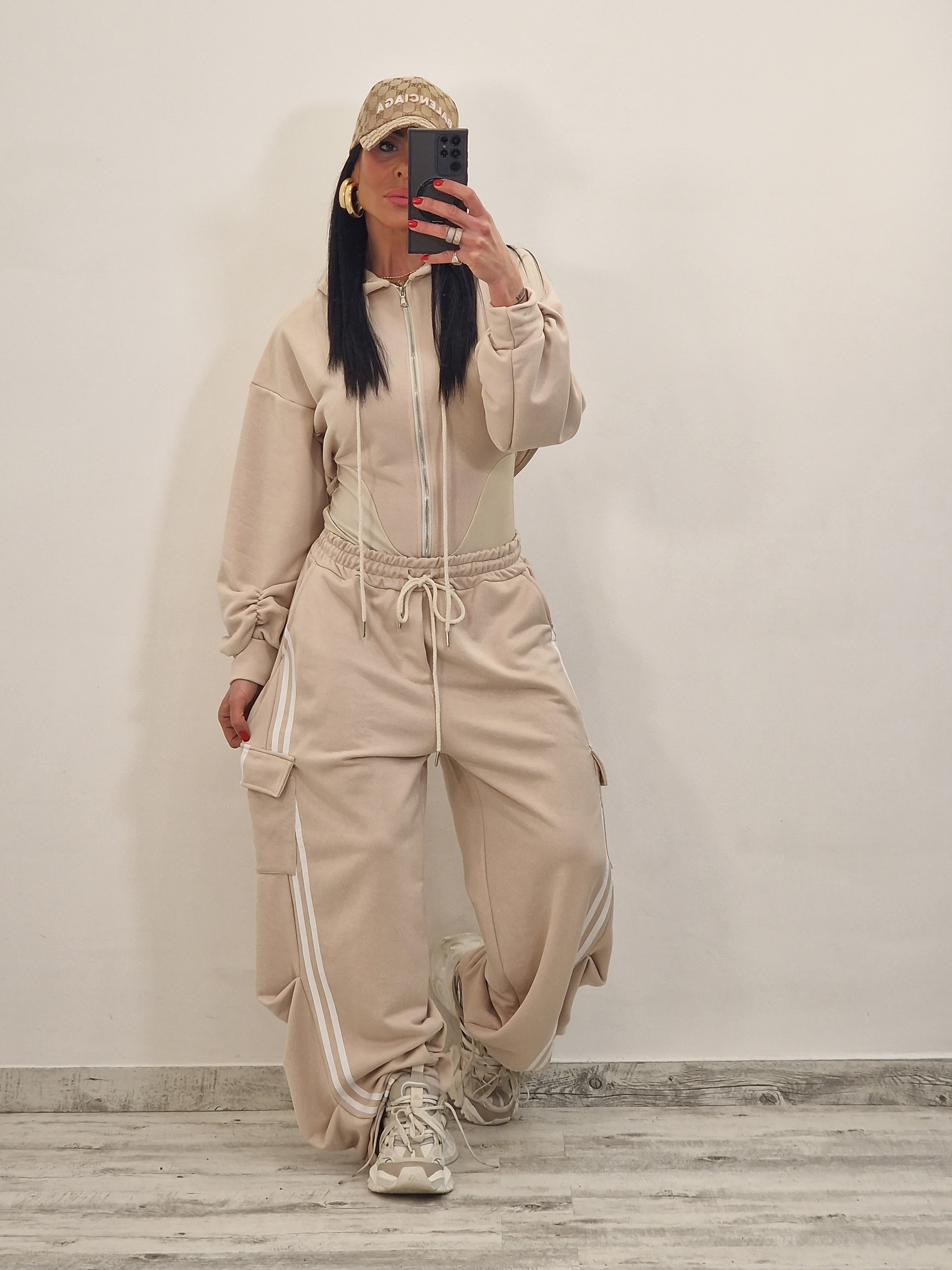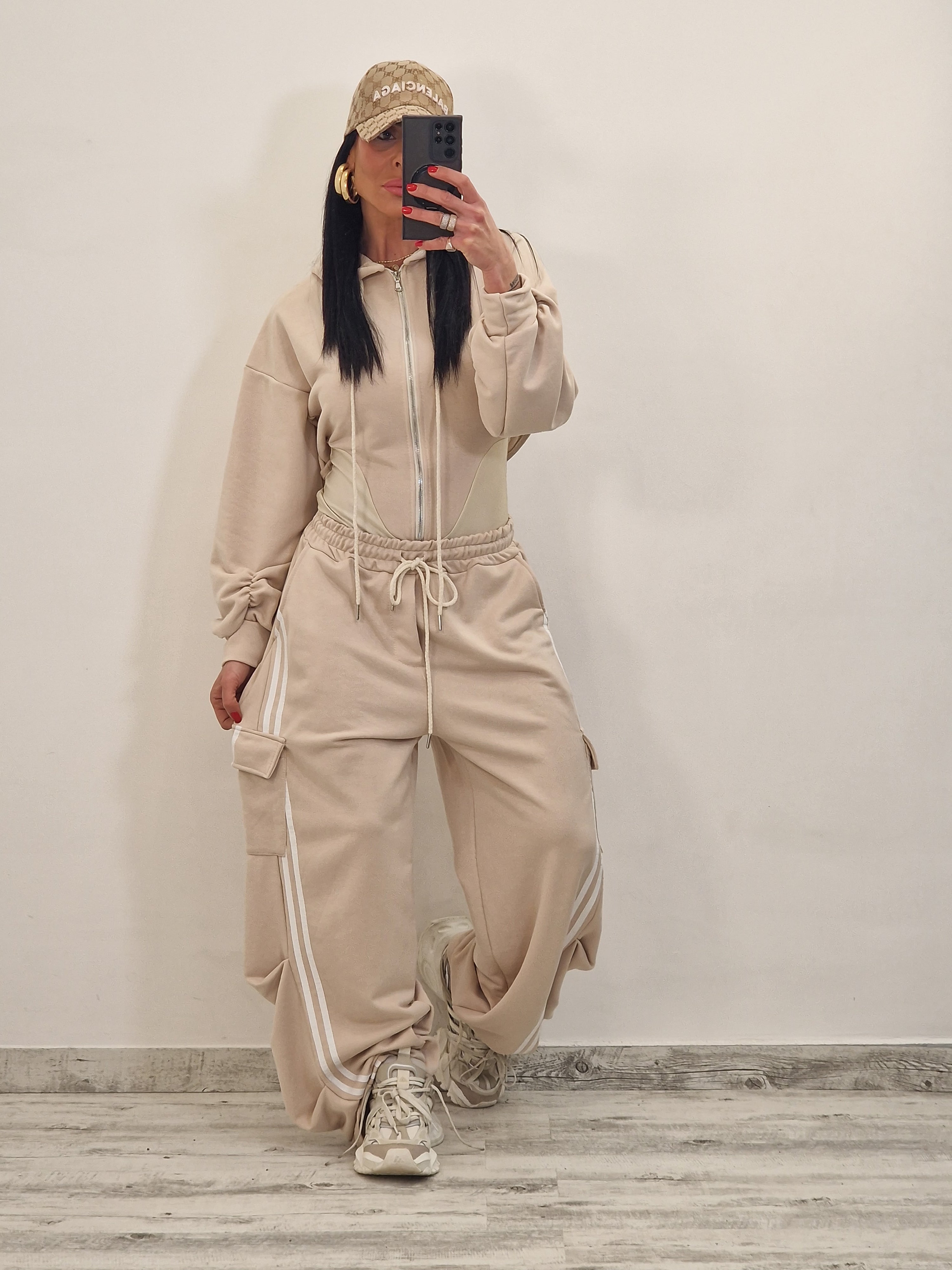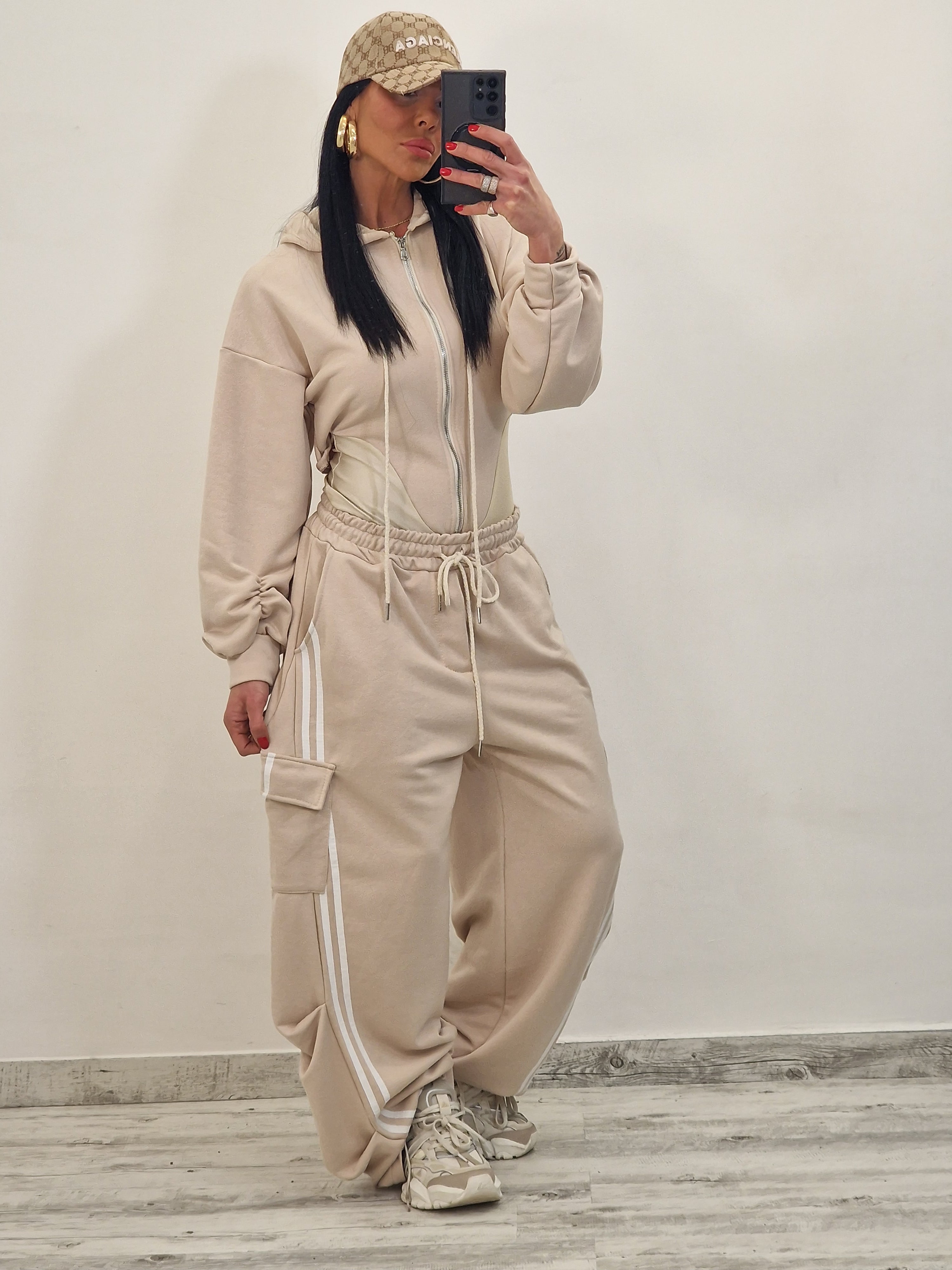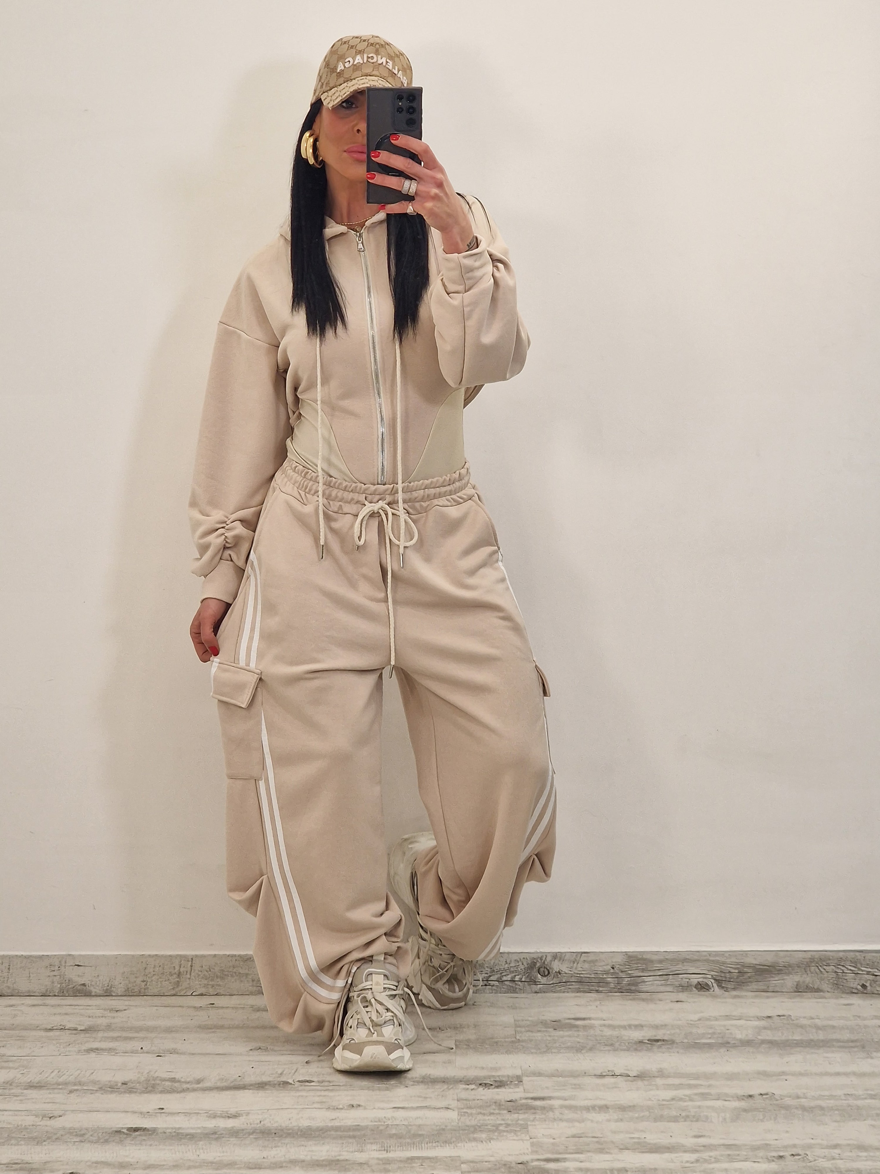 composto da body/felpa con cappuccio e zip e pantatuta cargo con elastico