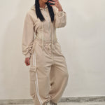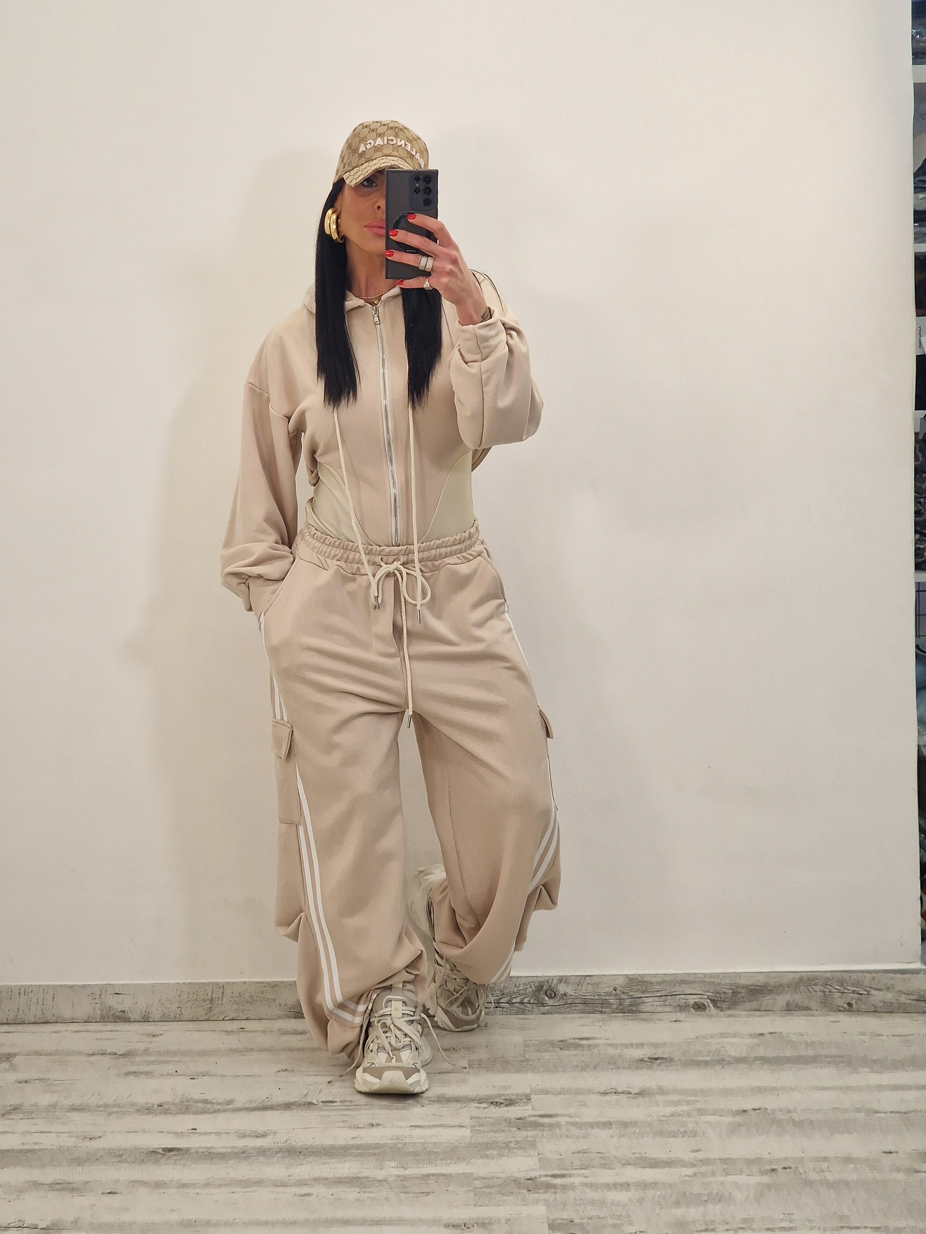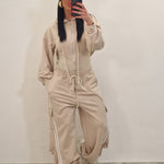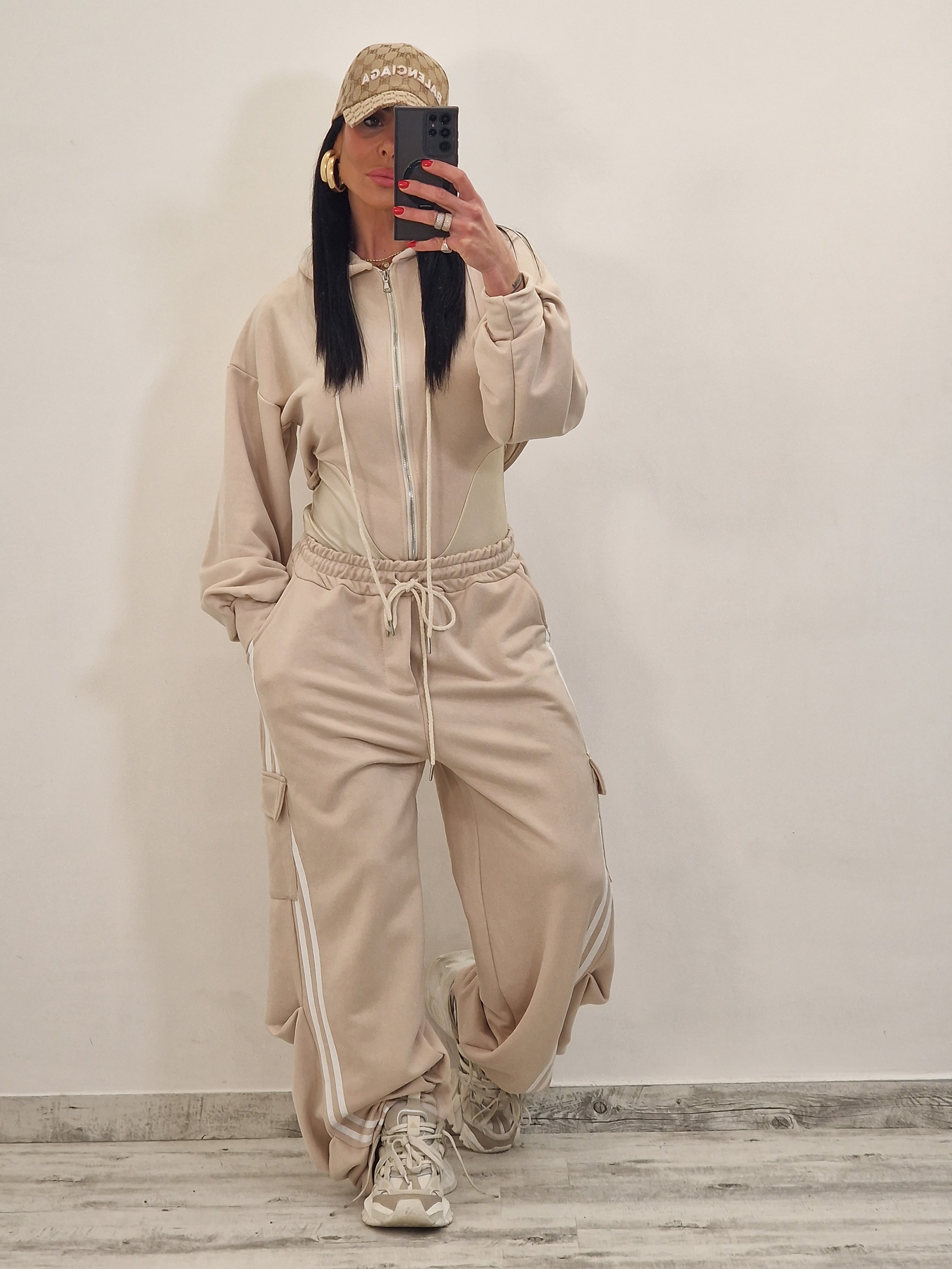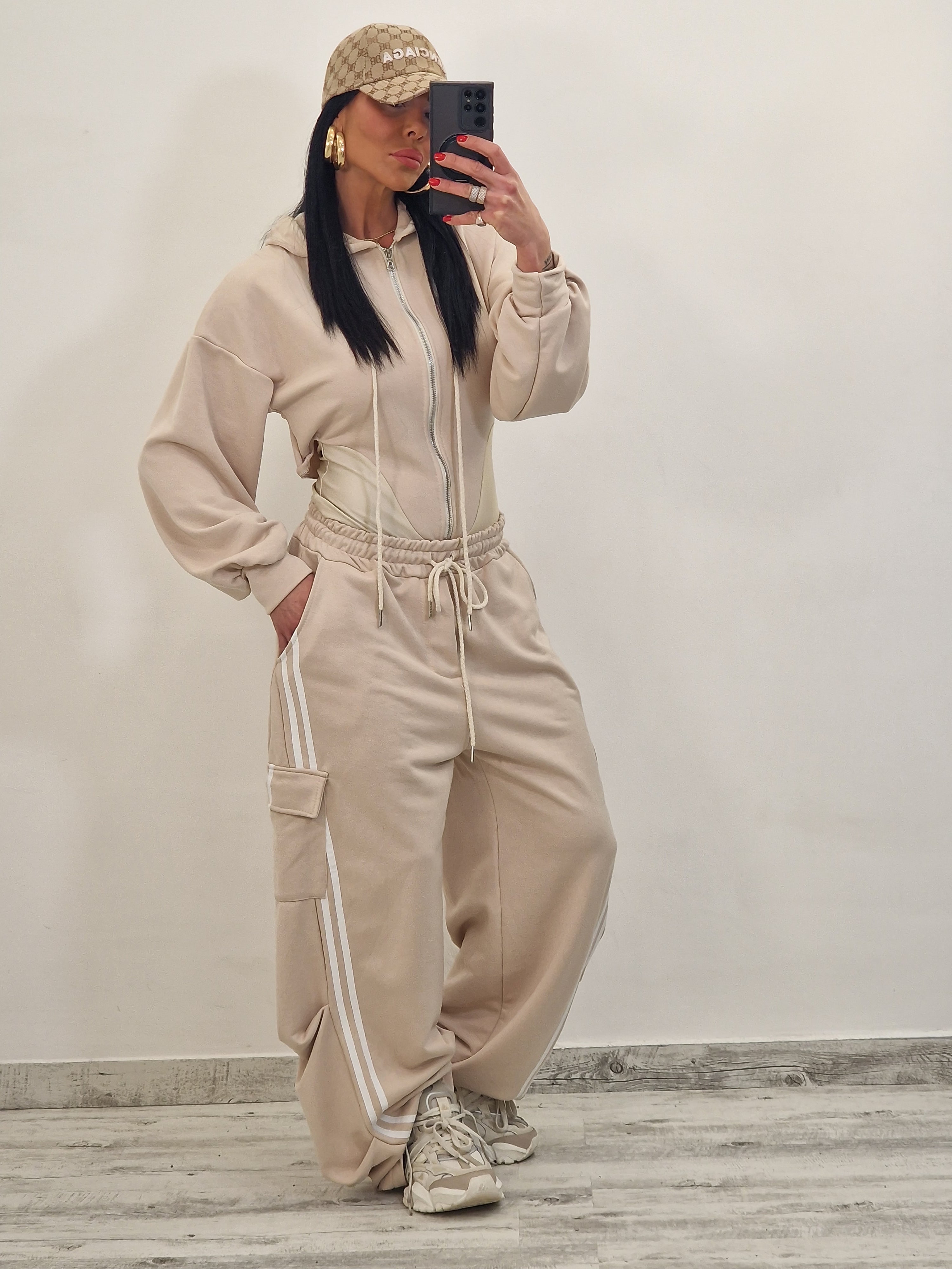 composto da body/felpa con cappuccio e zip e pantatuta cargo con elastico