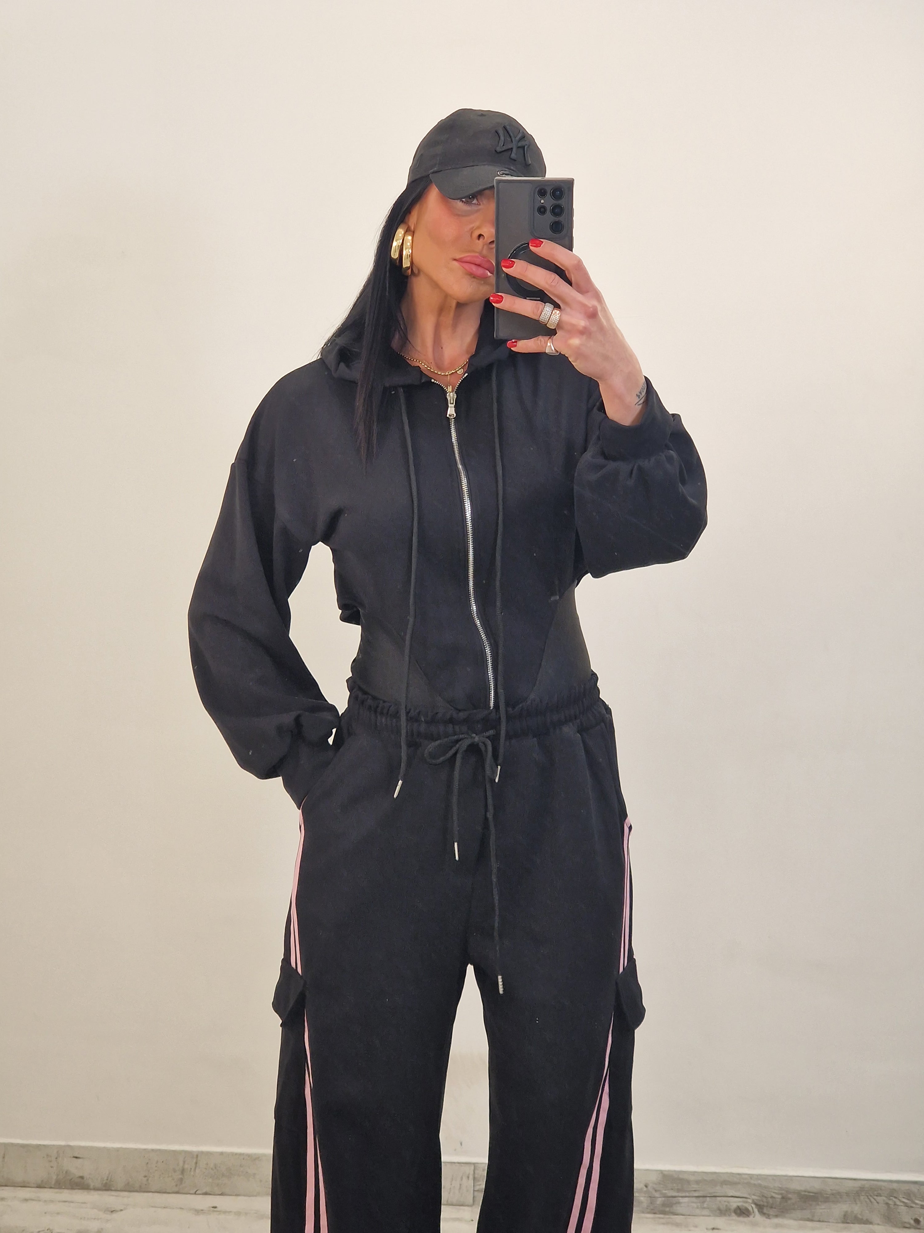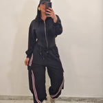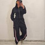 composto da body/felpa con cappuccio e zip e pantatuta cargo con elastico