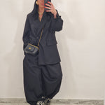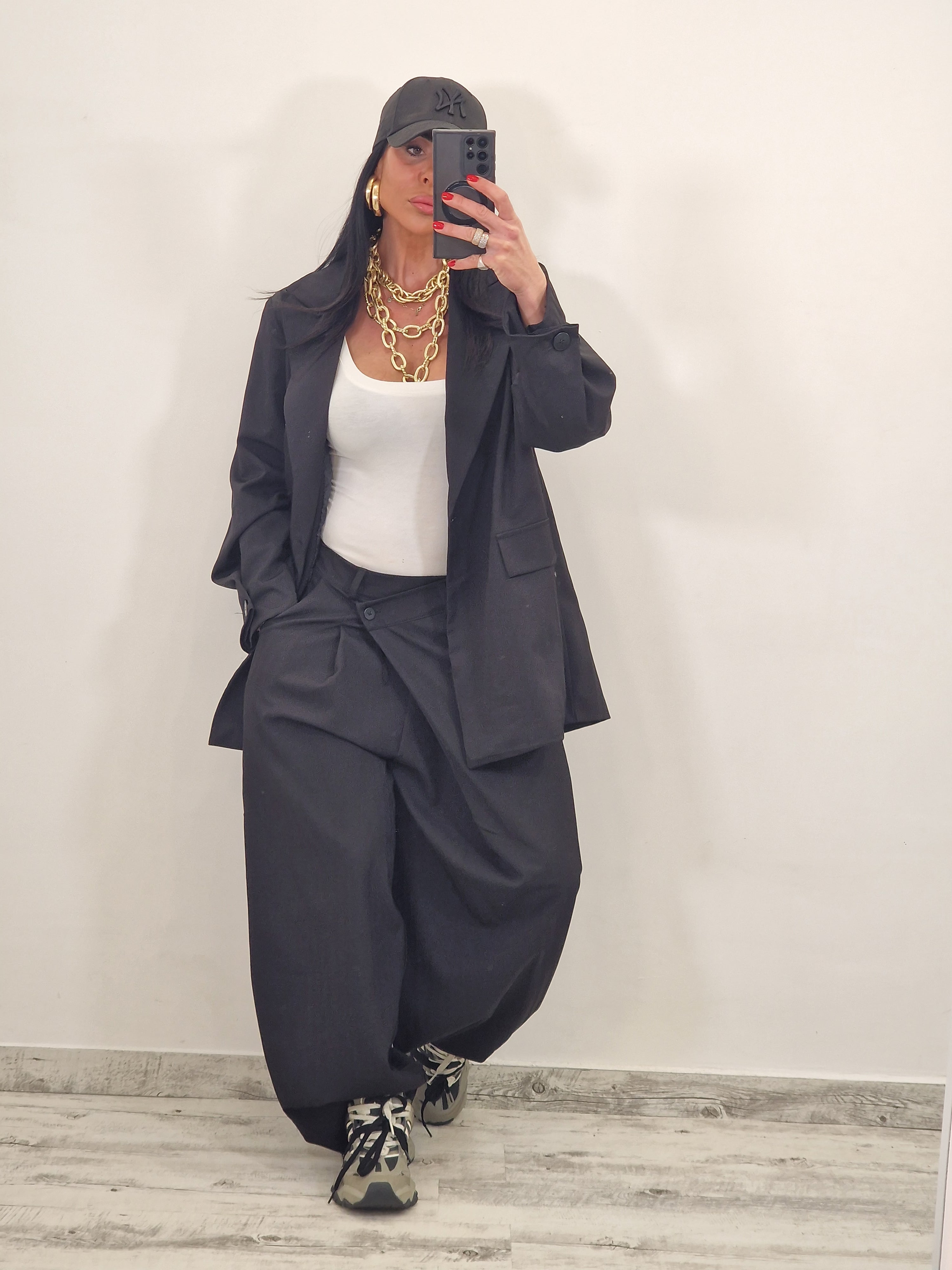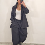 Coordinato con blazer over e pantalone con bottone laterale.