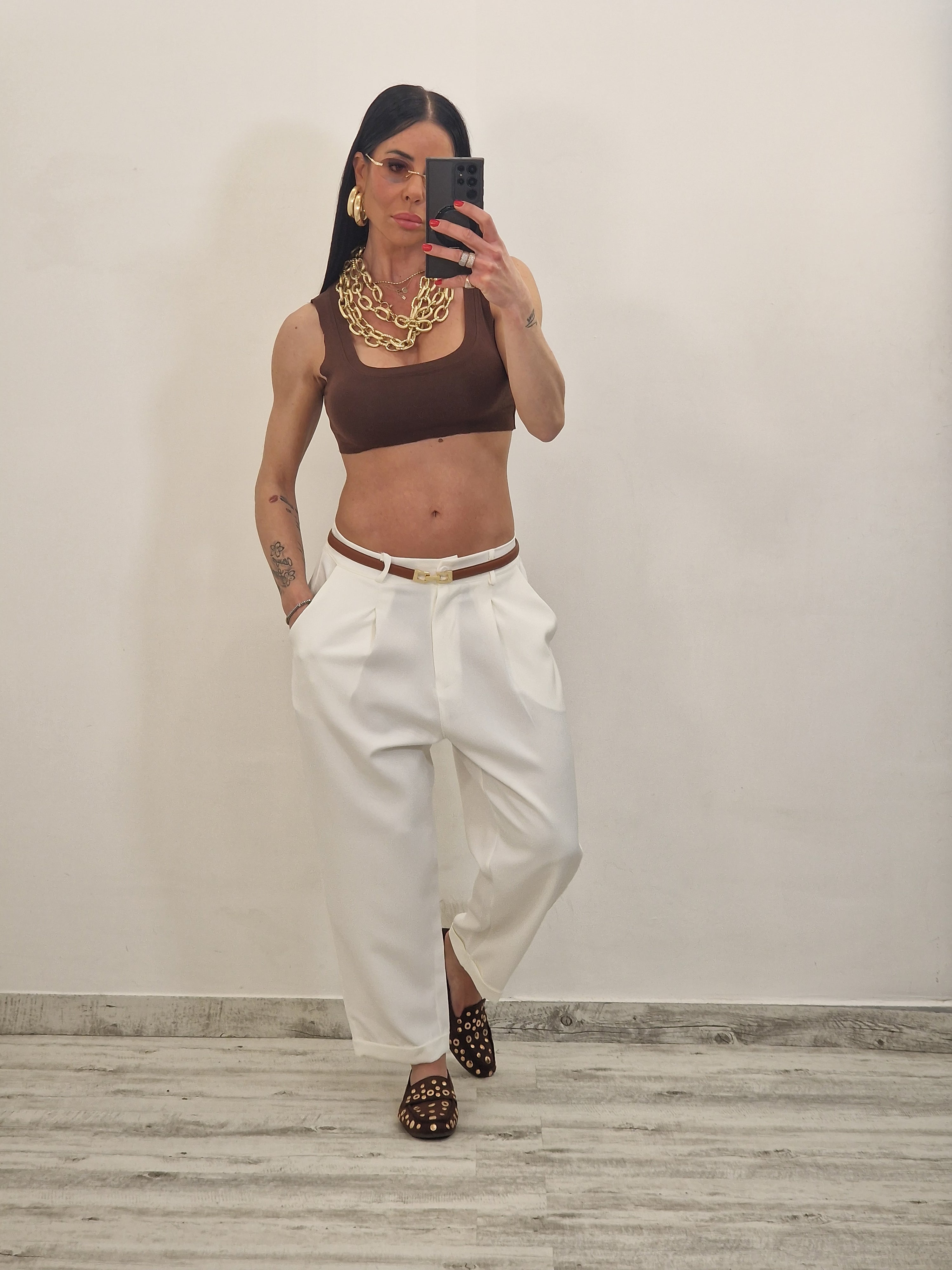 e pantalone con elastico dietro e bottone in avanti.