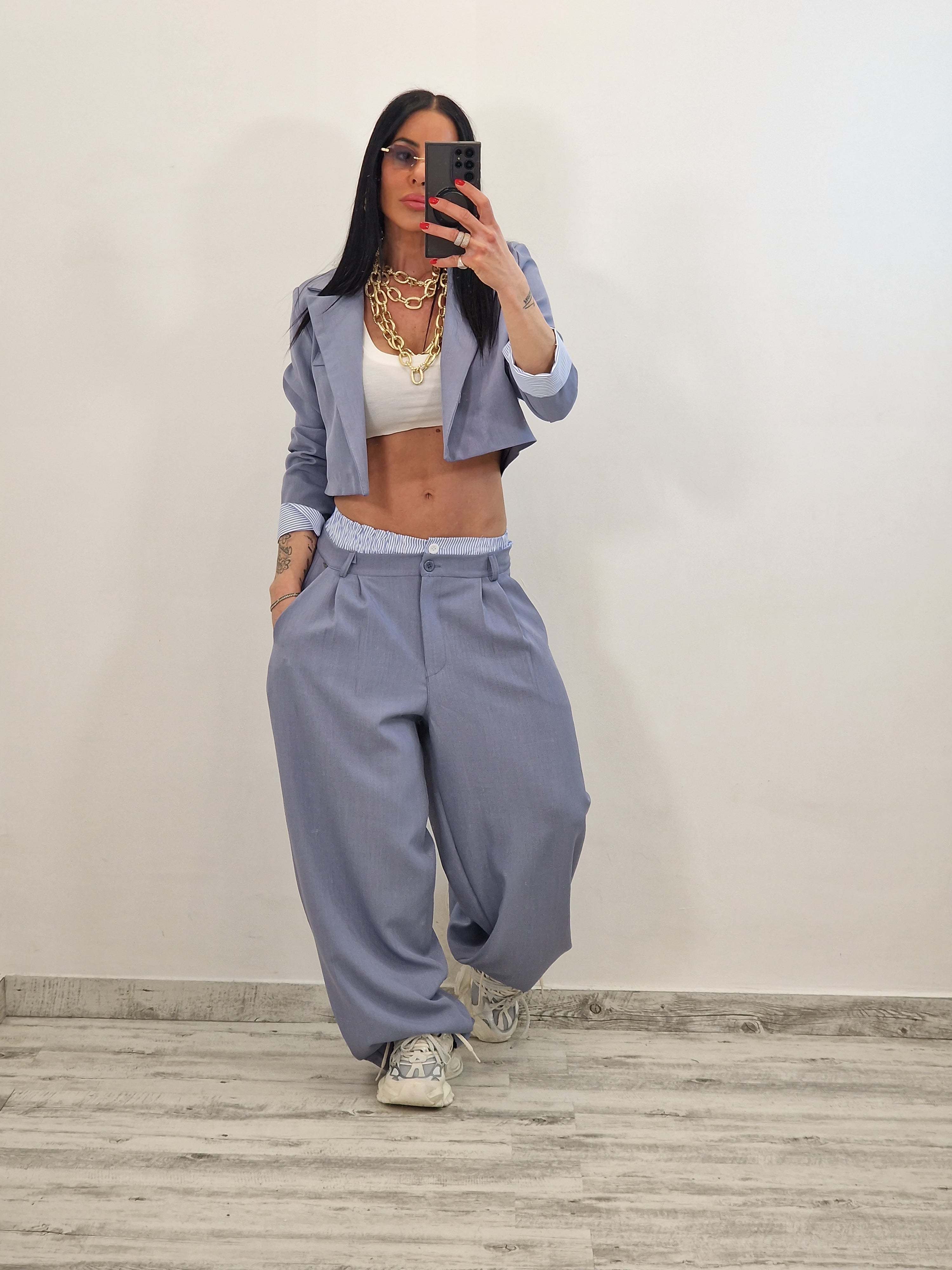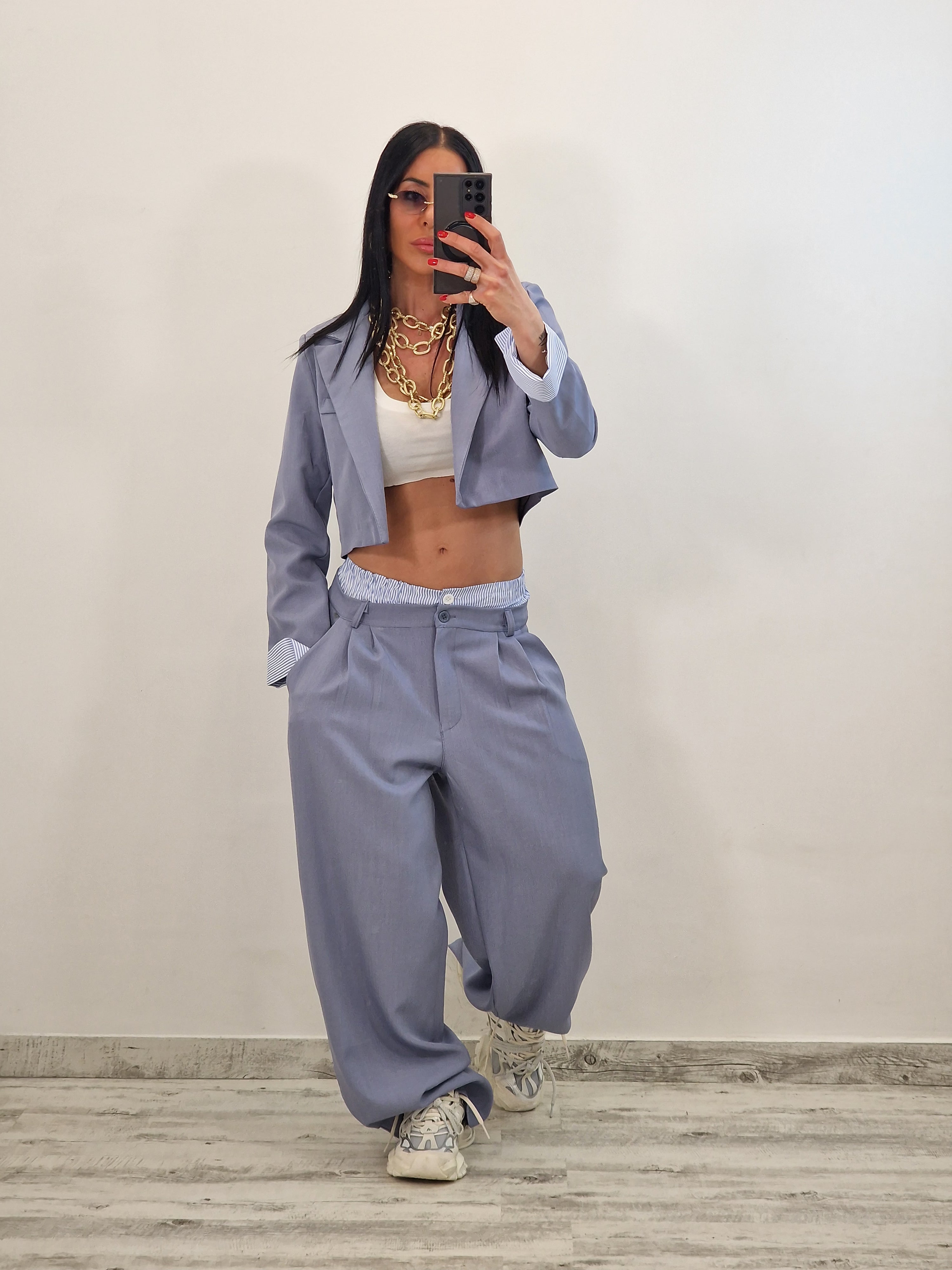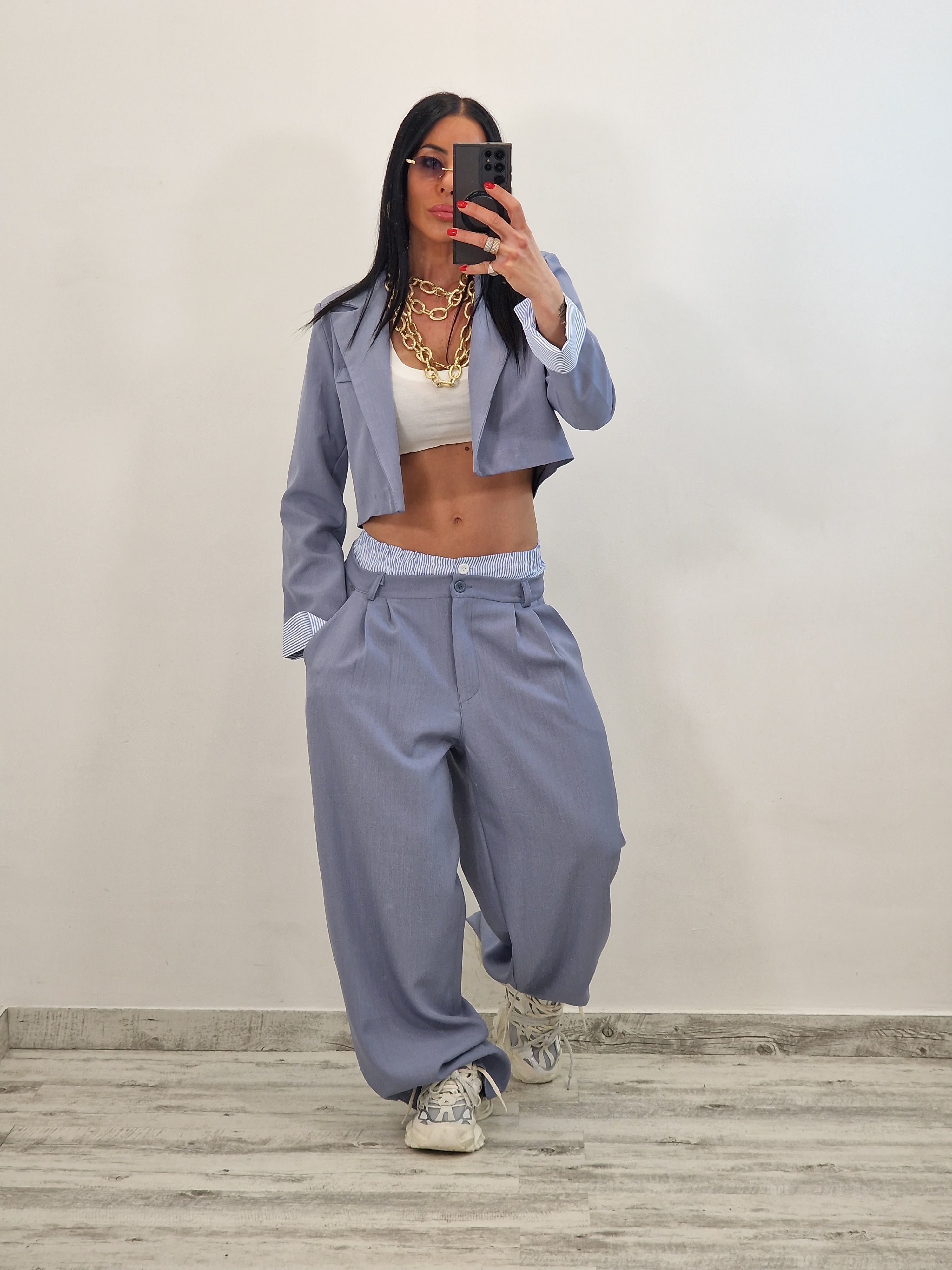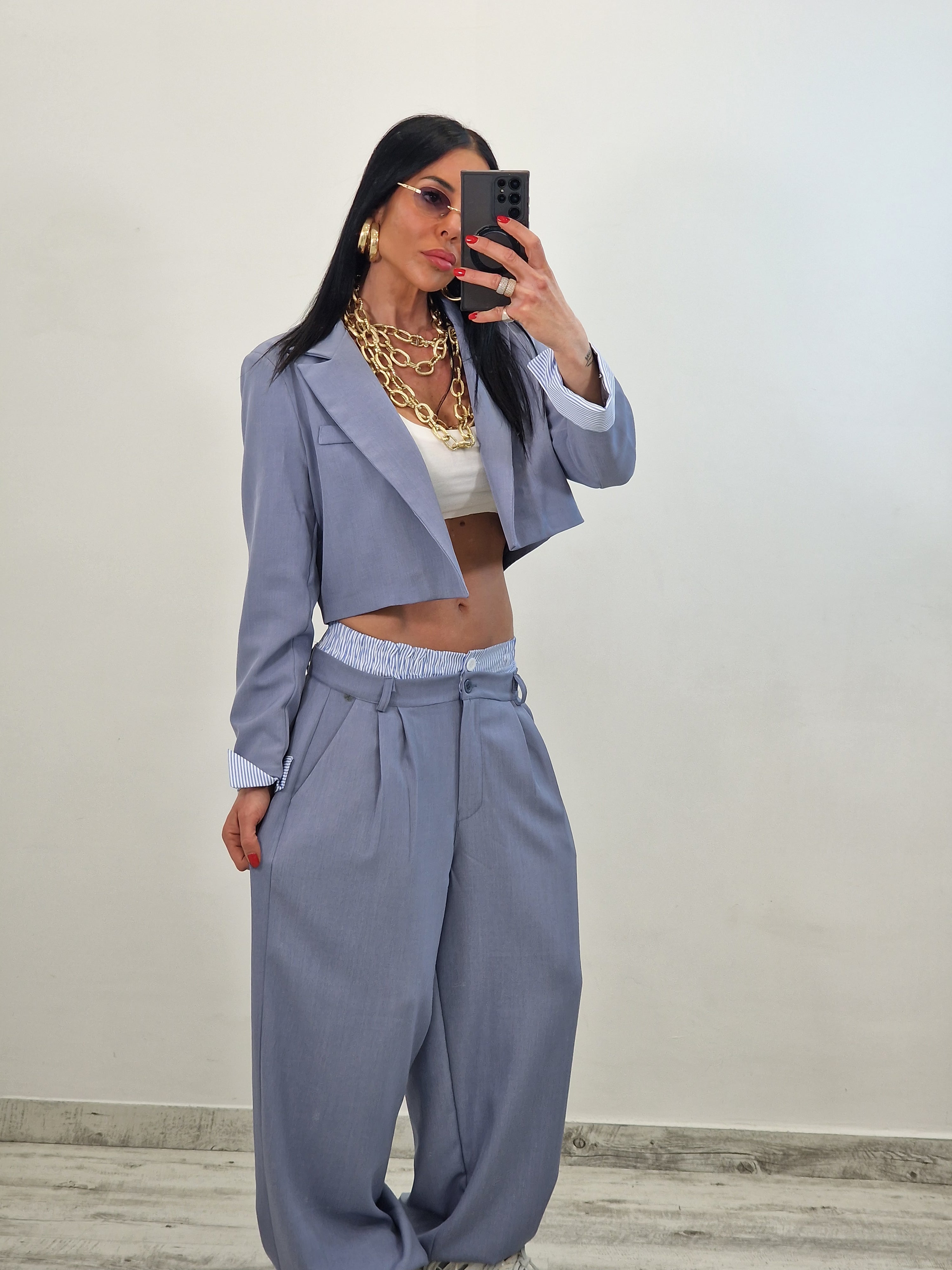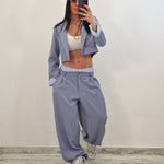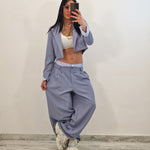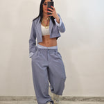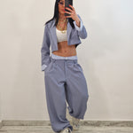 Coordinato composto da giacca crop e pantalone con elastico in cotone a vista