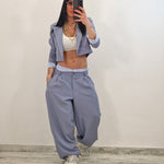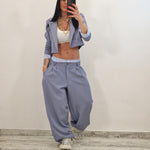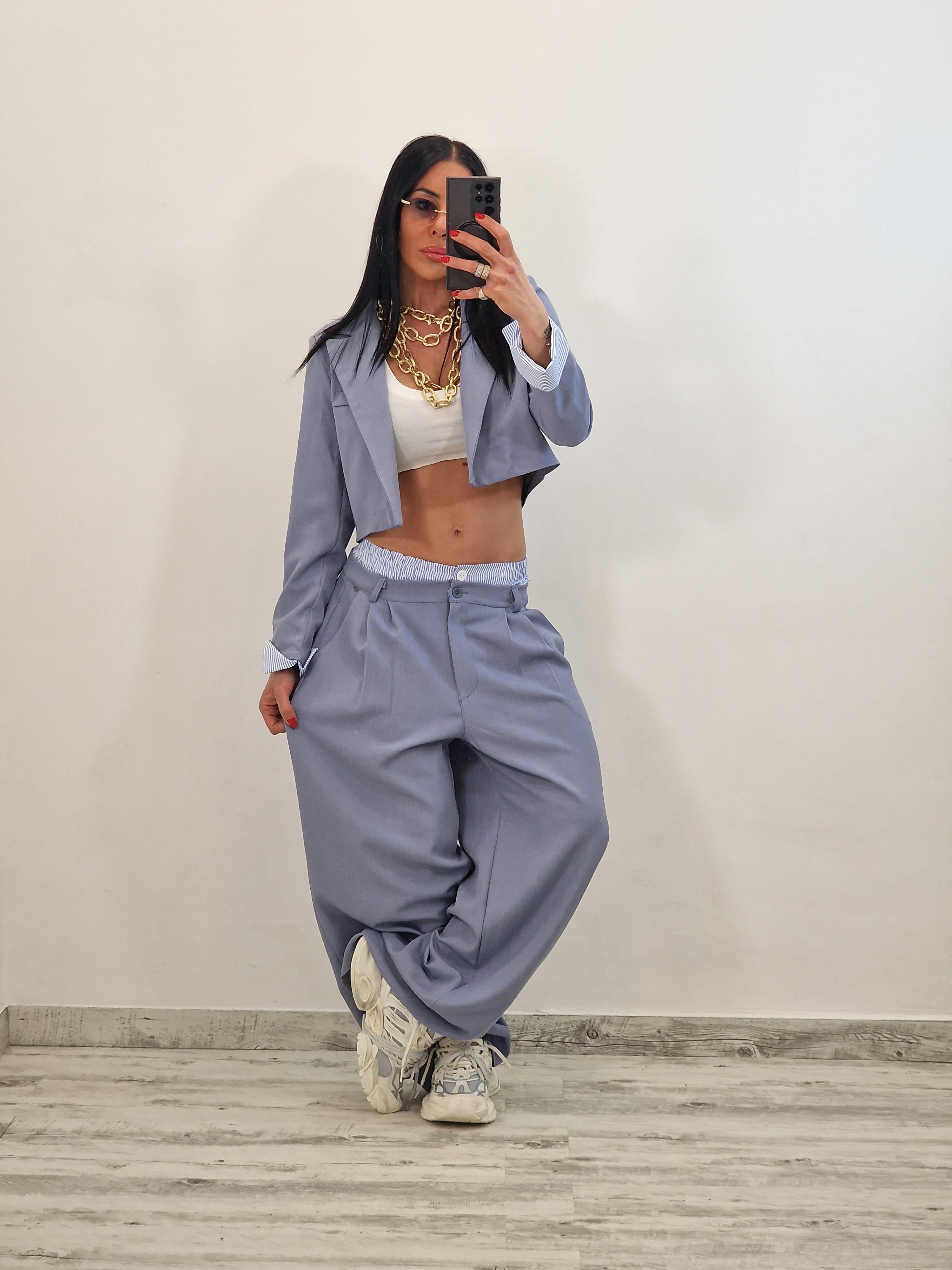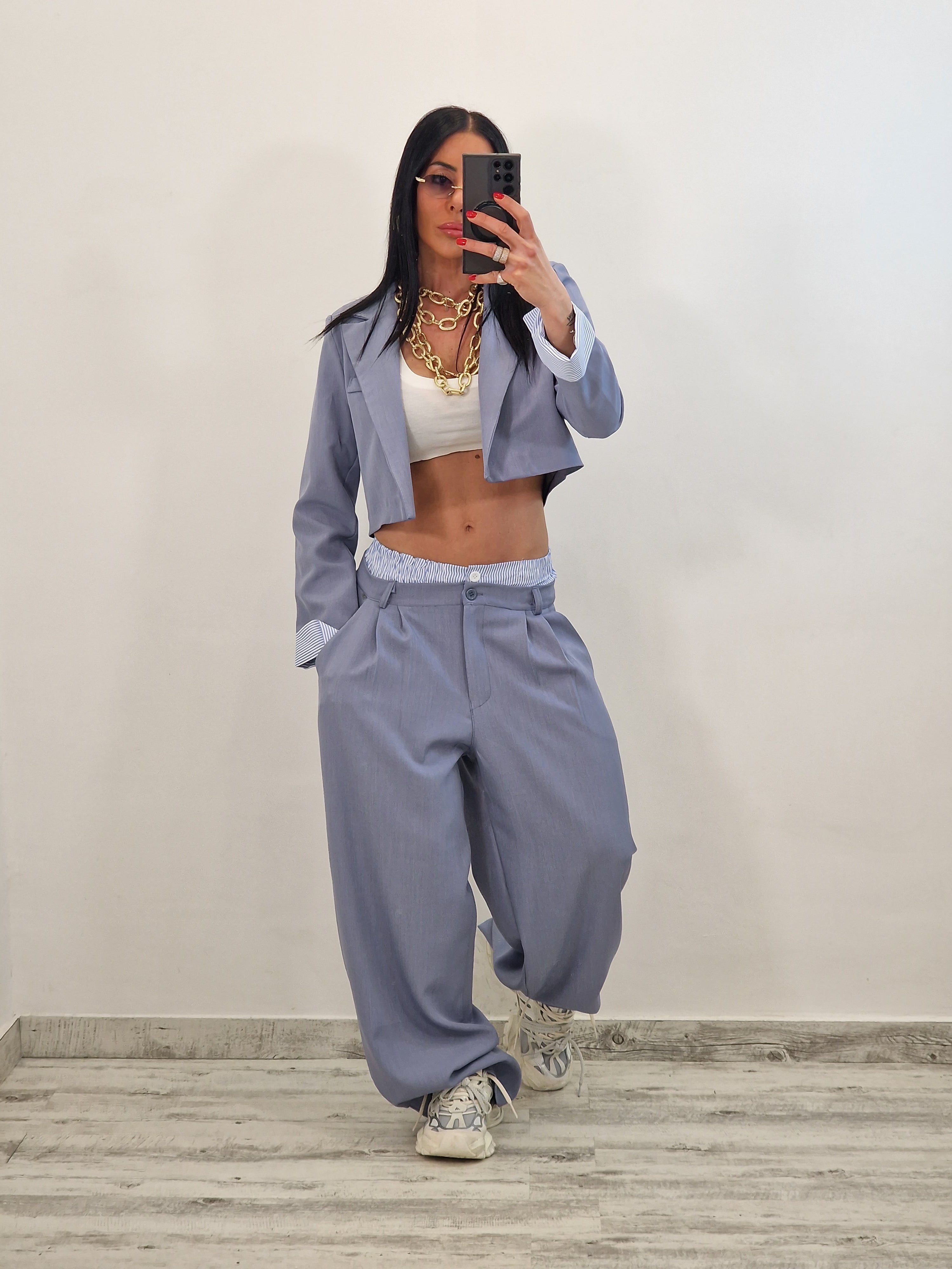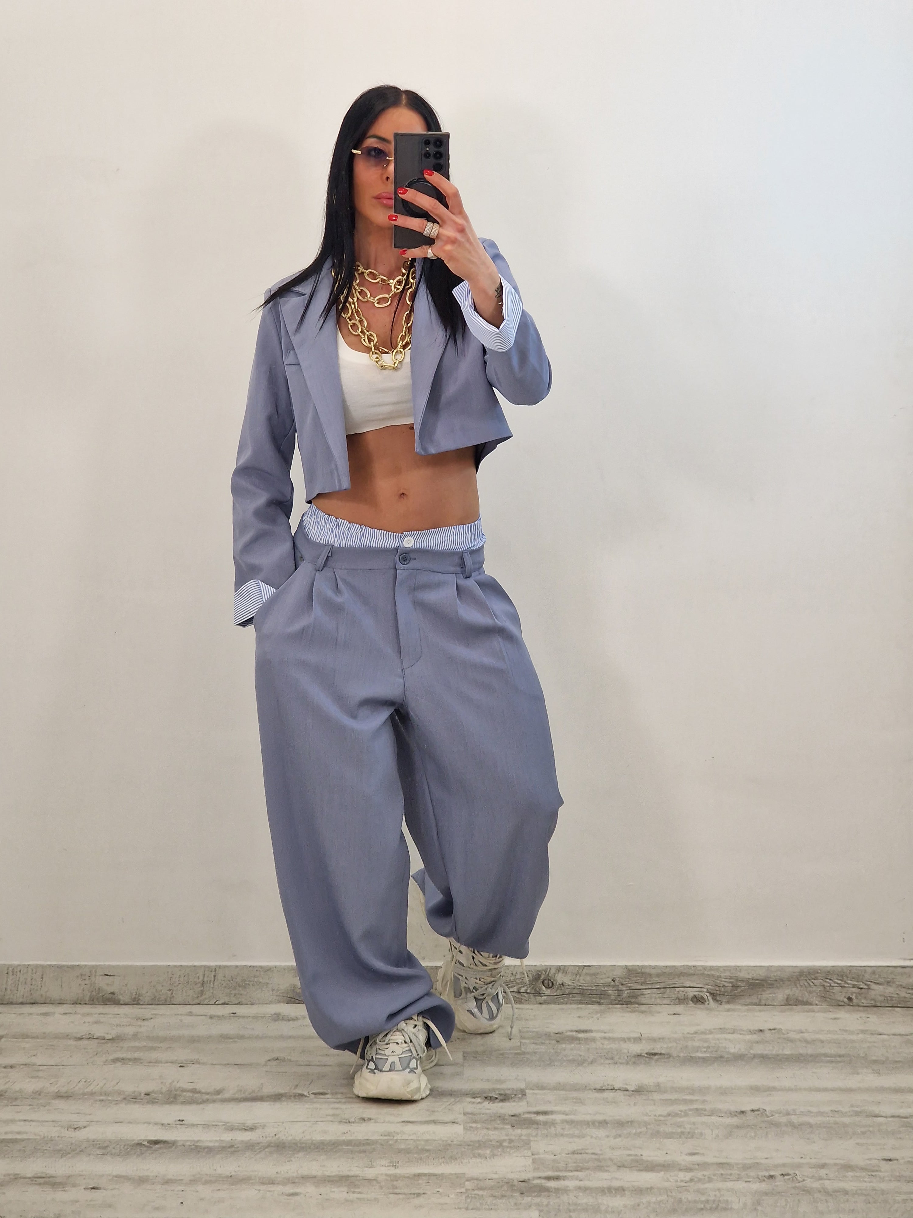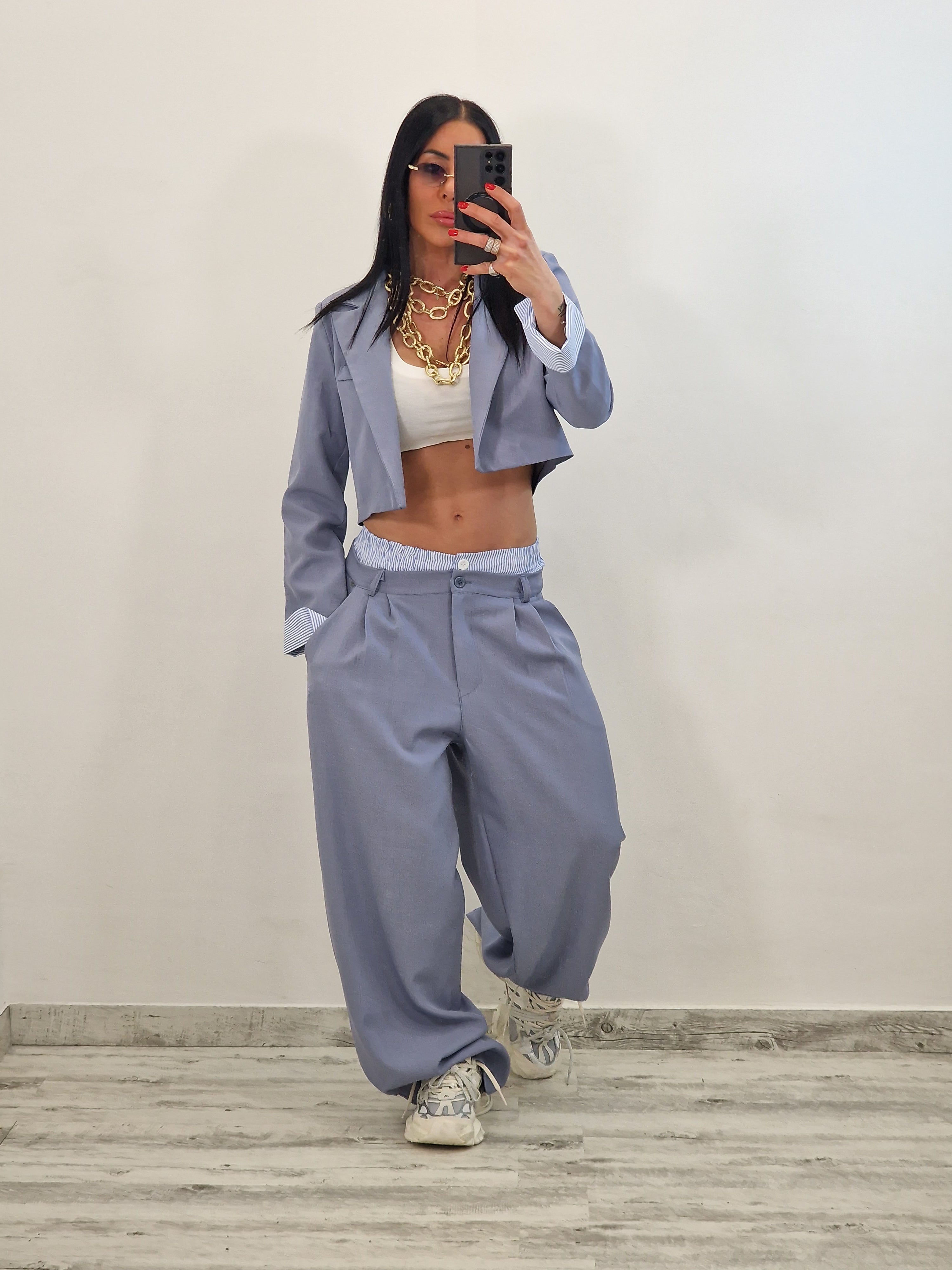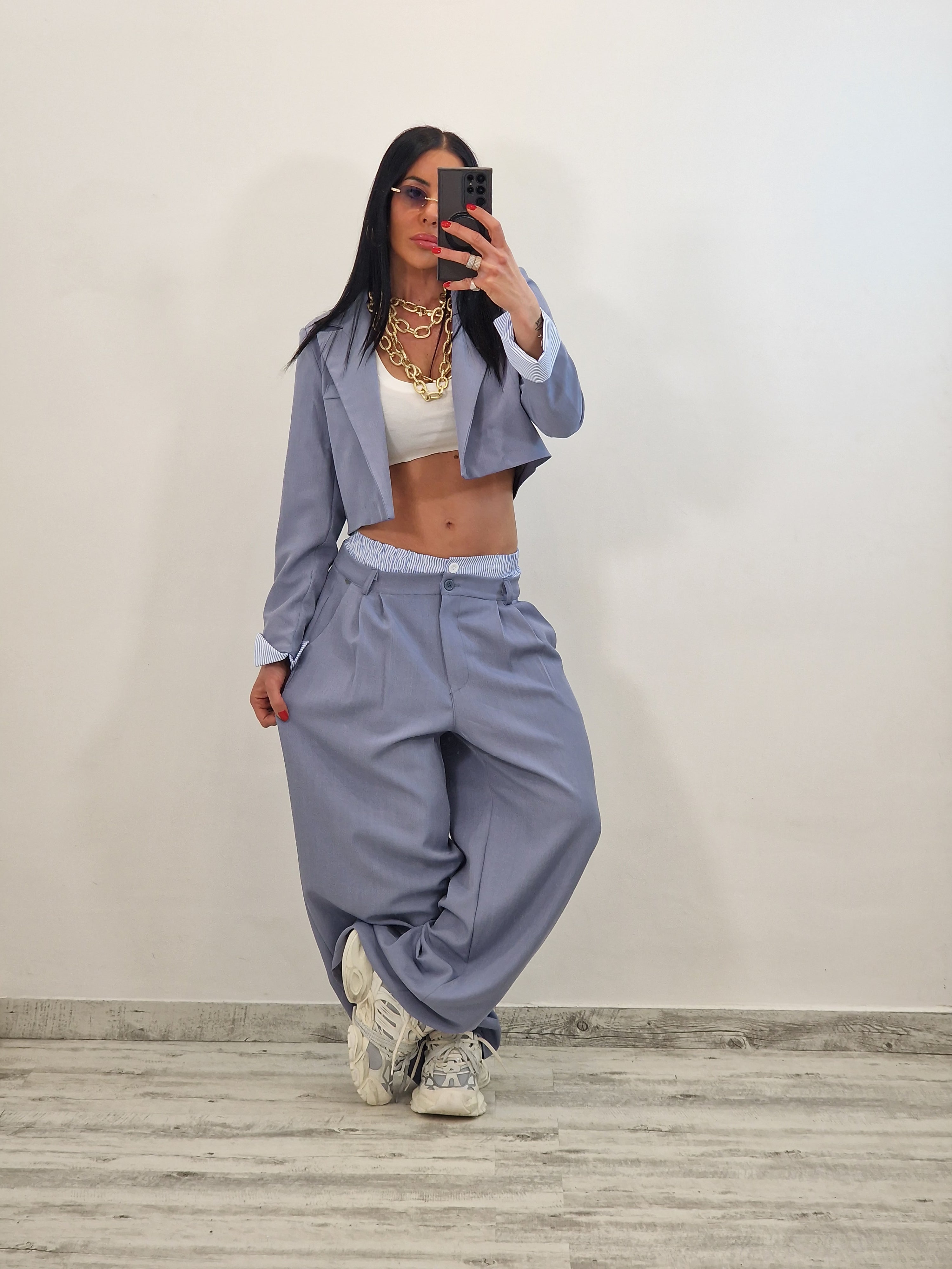 Coordinato composto da giacca crop e pantalone con elastico in cotone a vista