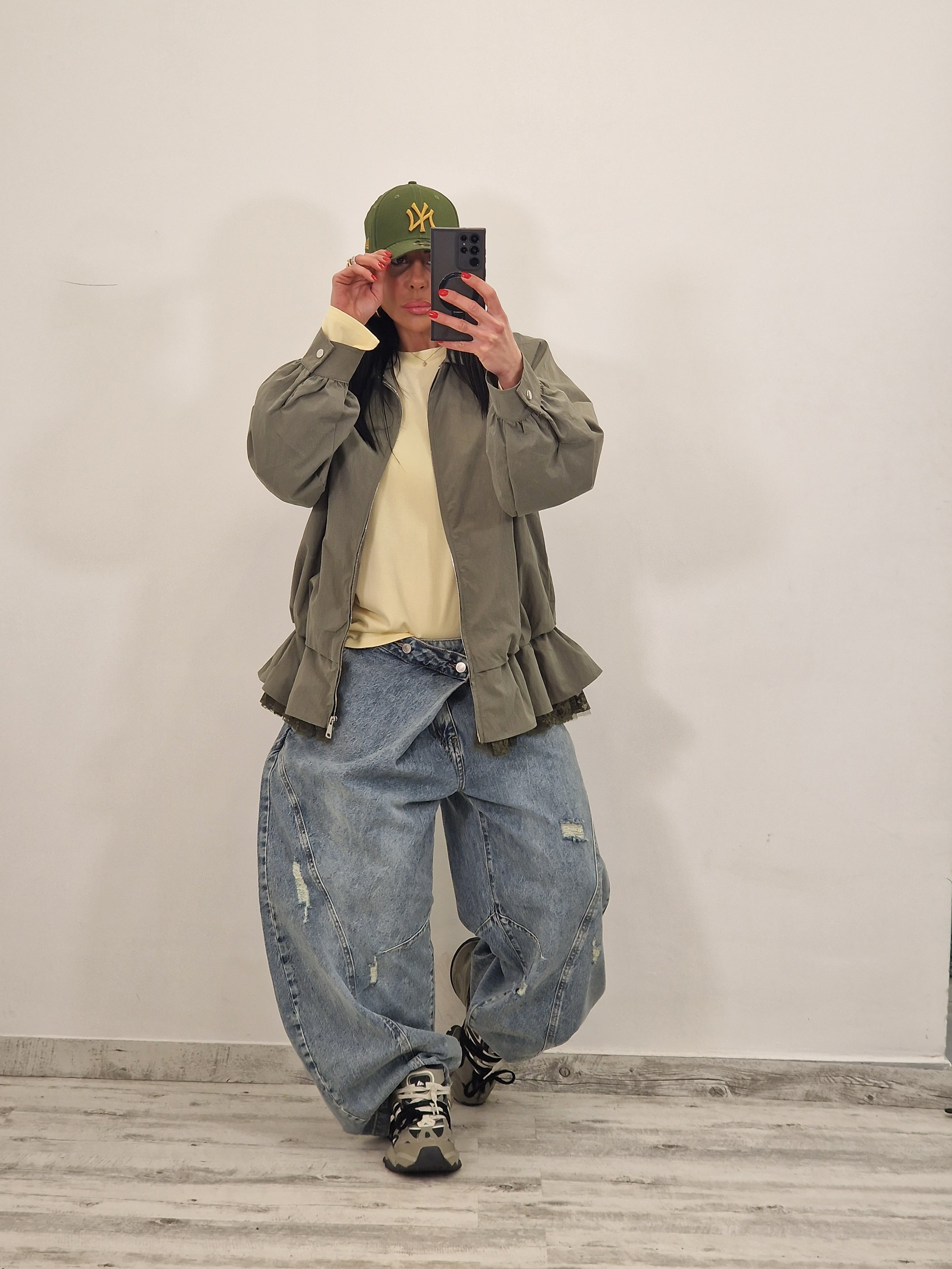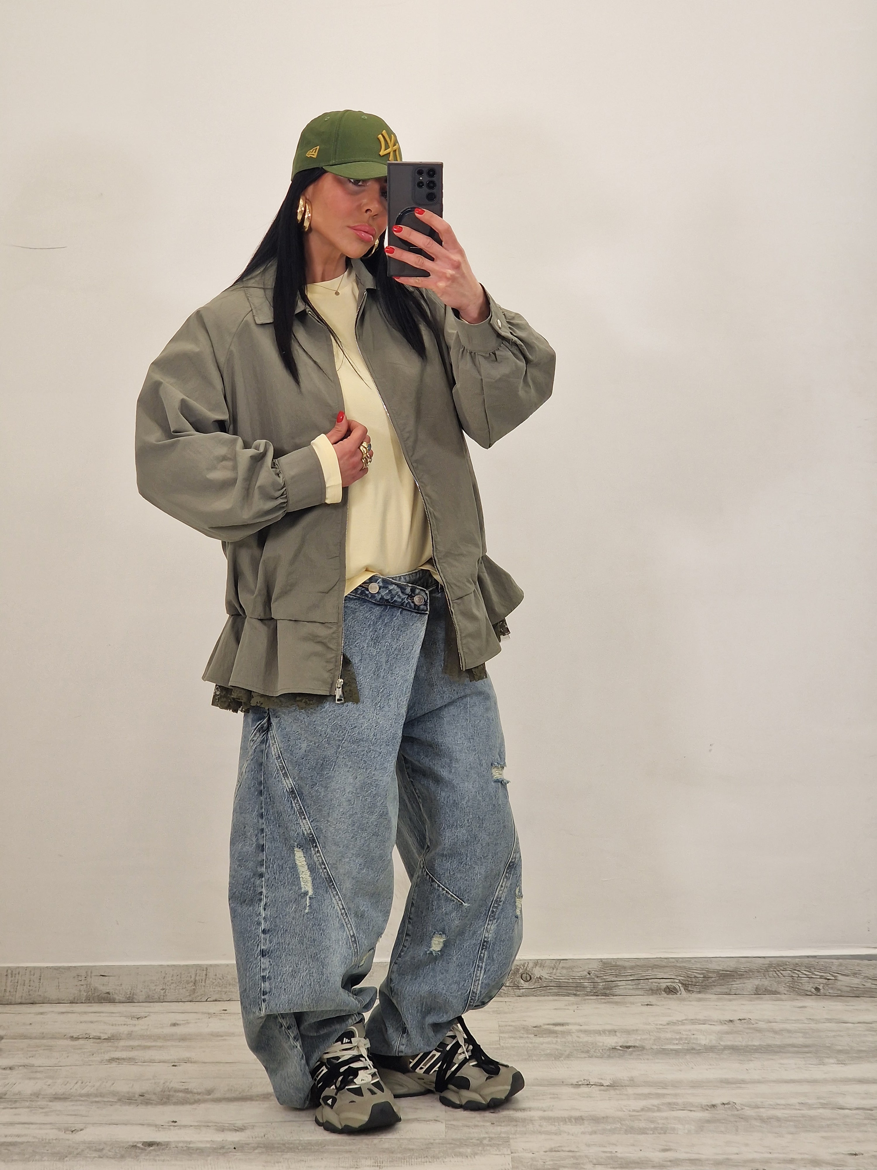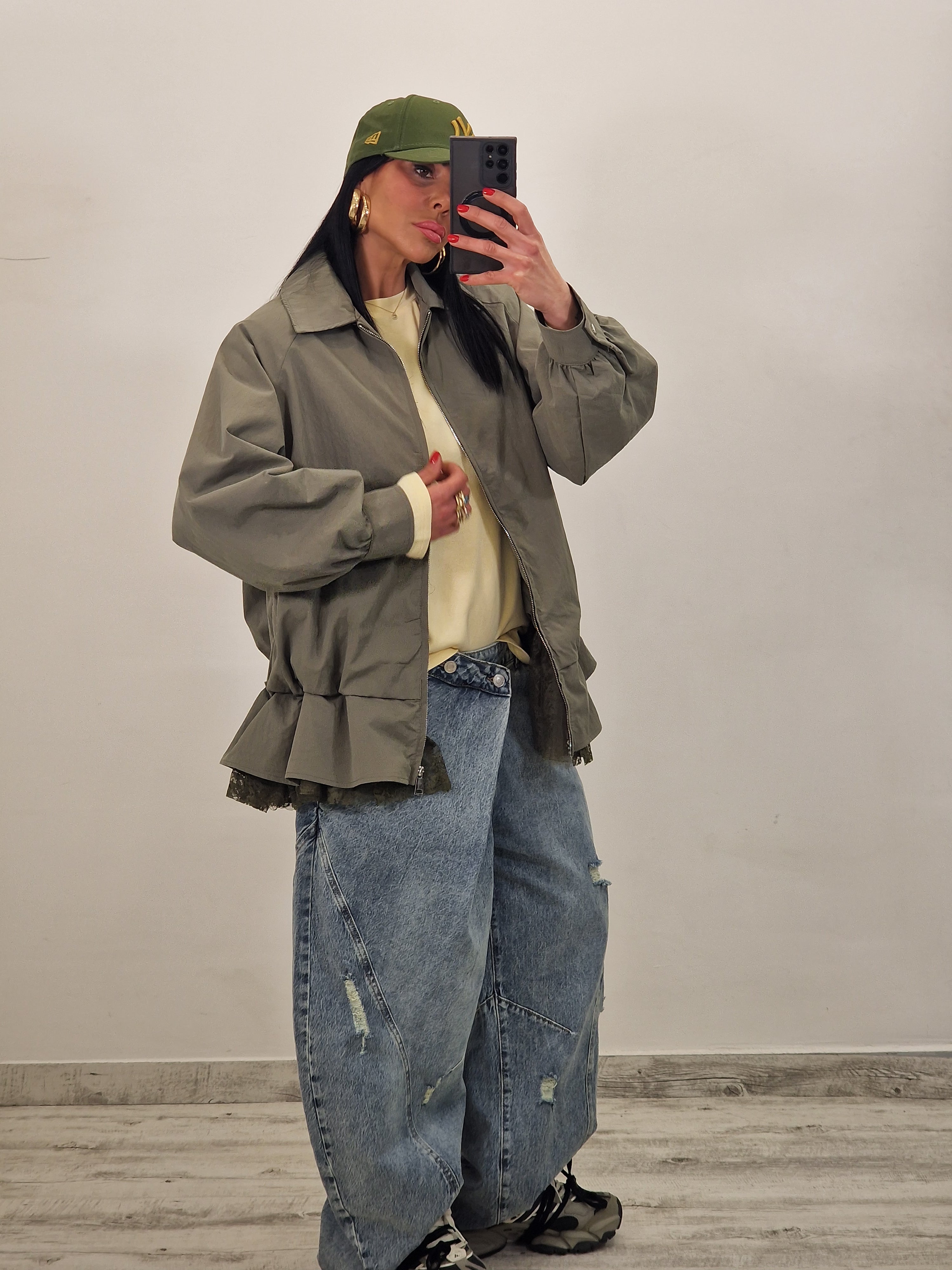 Giubbino leggero dal taglio over, con pizzo interno che fuoriesce dal fondo ed elastico, pensato per garantire comfort e libertà di movimento. Realizzato in tessuto leggero e traspirante, è perfetto per la mezza stagione e per completare outfit casual e dinamici. Il design oversize lo rende versatile e di tendenza, ideale da indossare tutti i giorni.