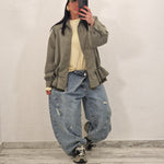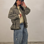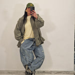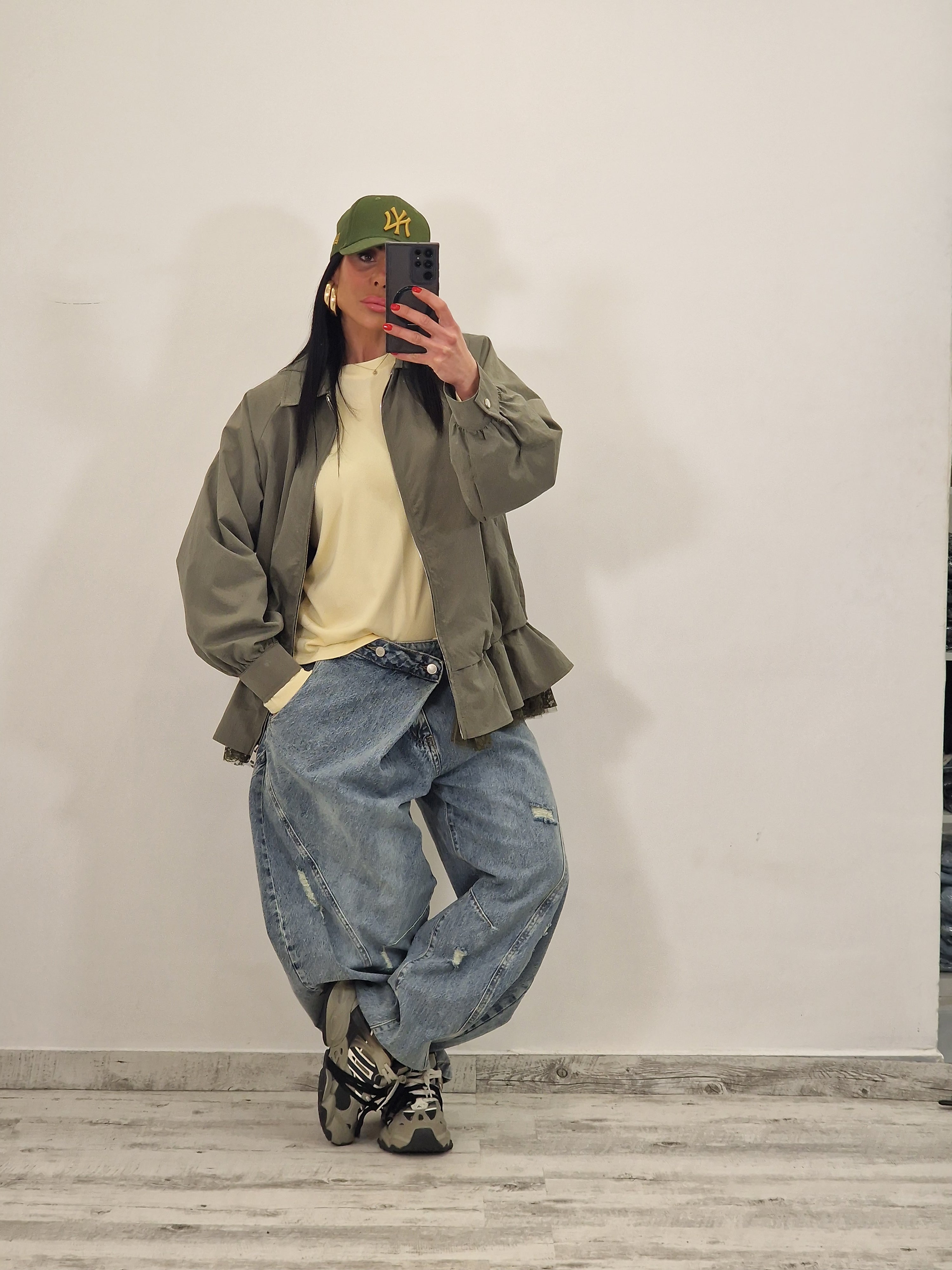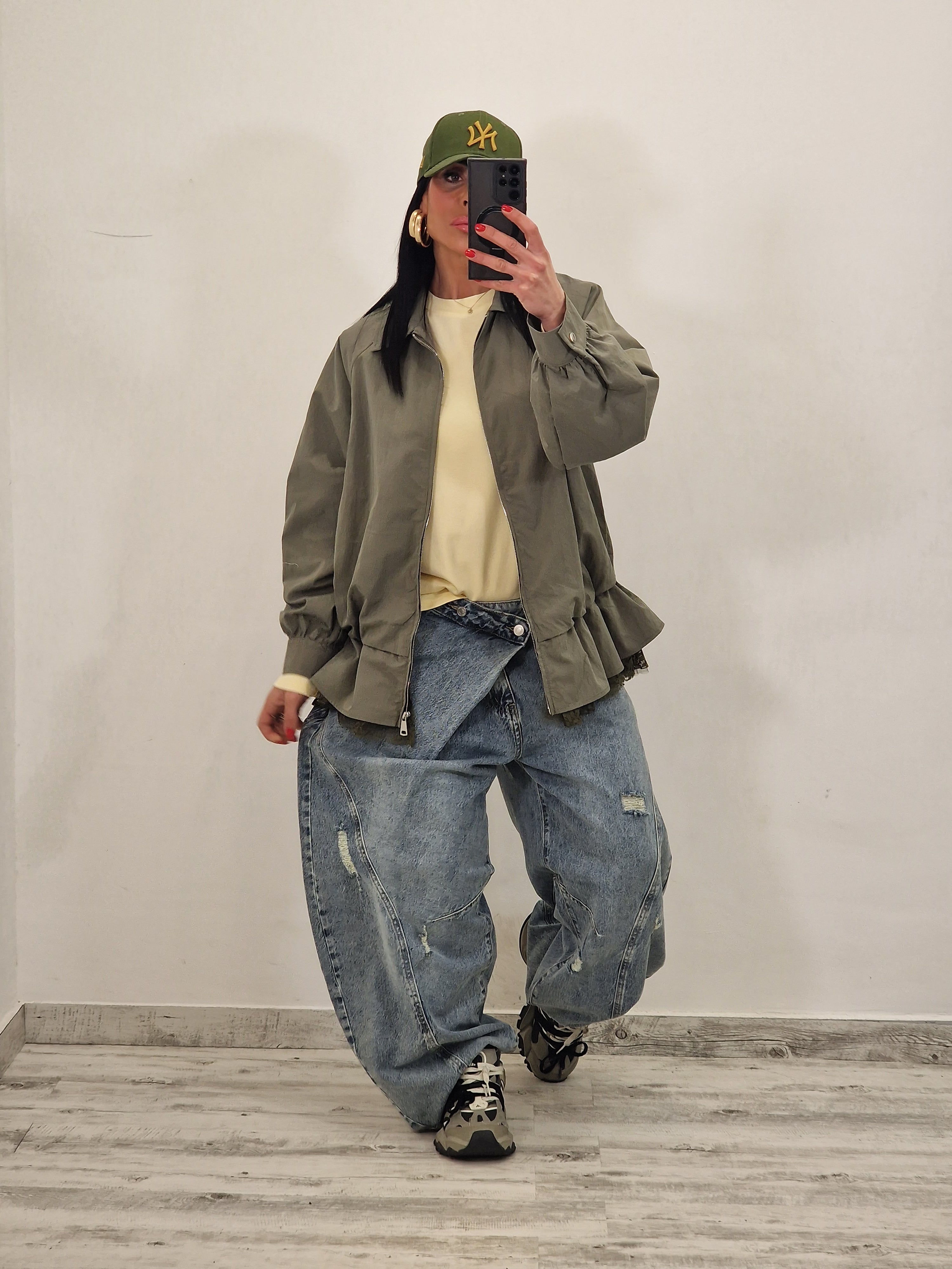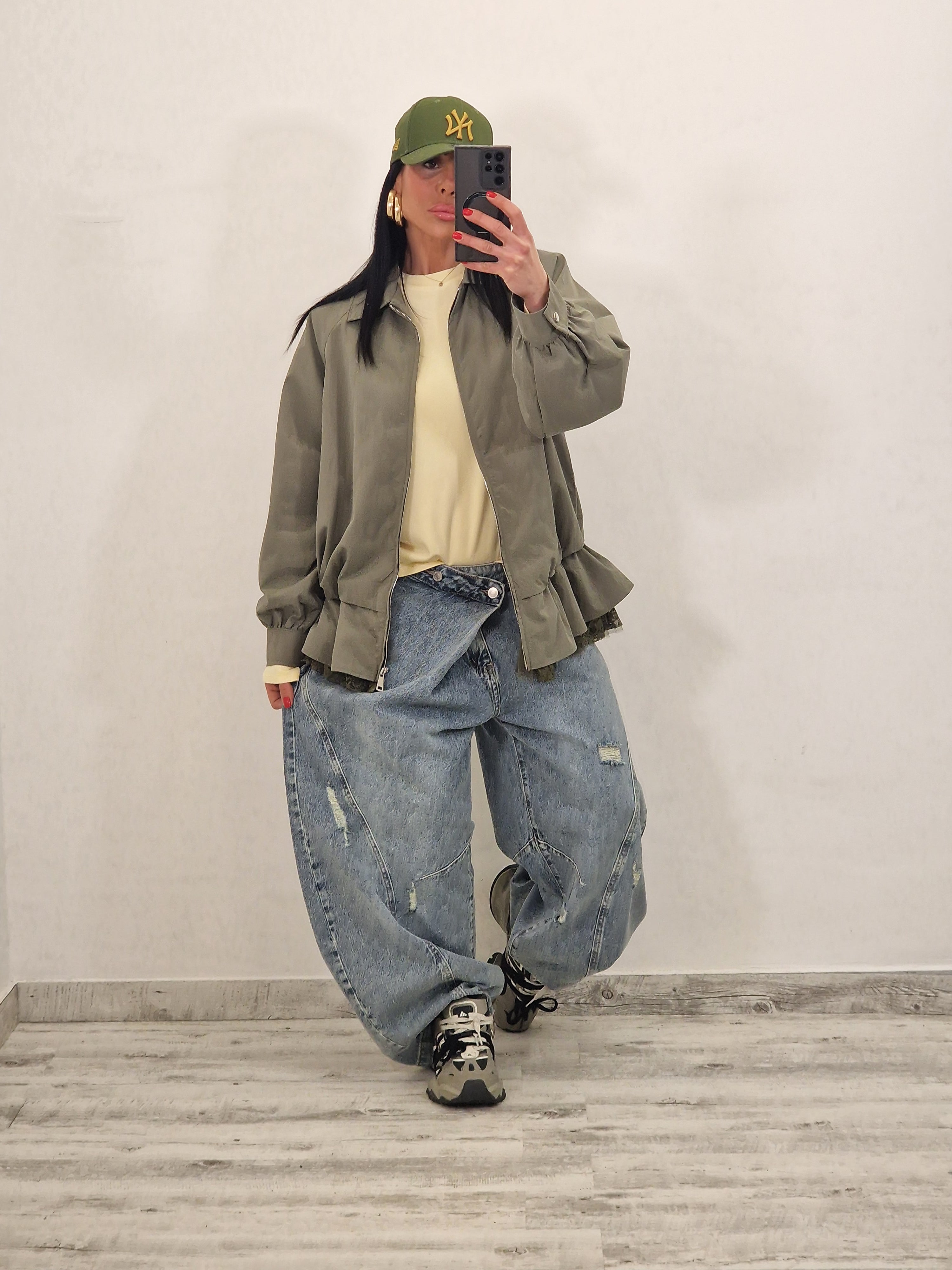 Giubbino leggero dal taglio over, con pizzo interno che fuoriesce dal fondo ed elastico, pensato per garantire comfort e libertà di movimento. Realizzato in tessuto leggero e traspirante, è perfetto per la mezza stagione e per completare outfit casual e dinamici. Il design oversize lo rende versatile e di tendenza, ideale da indossare tutti i giorni.