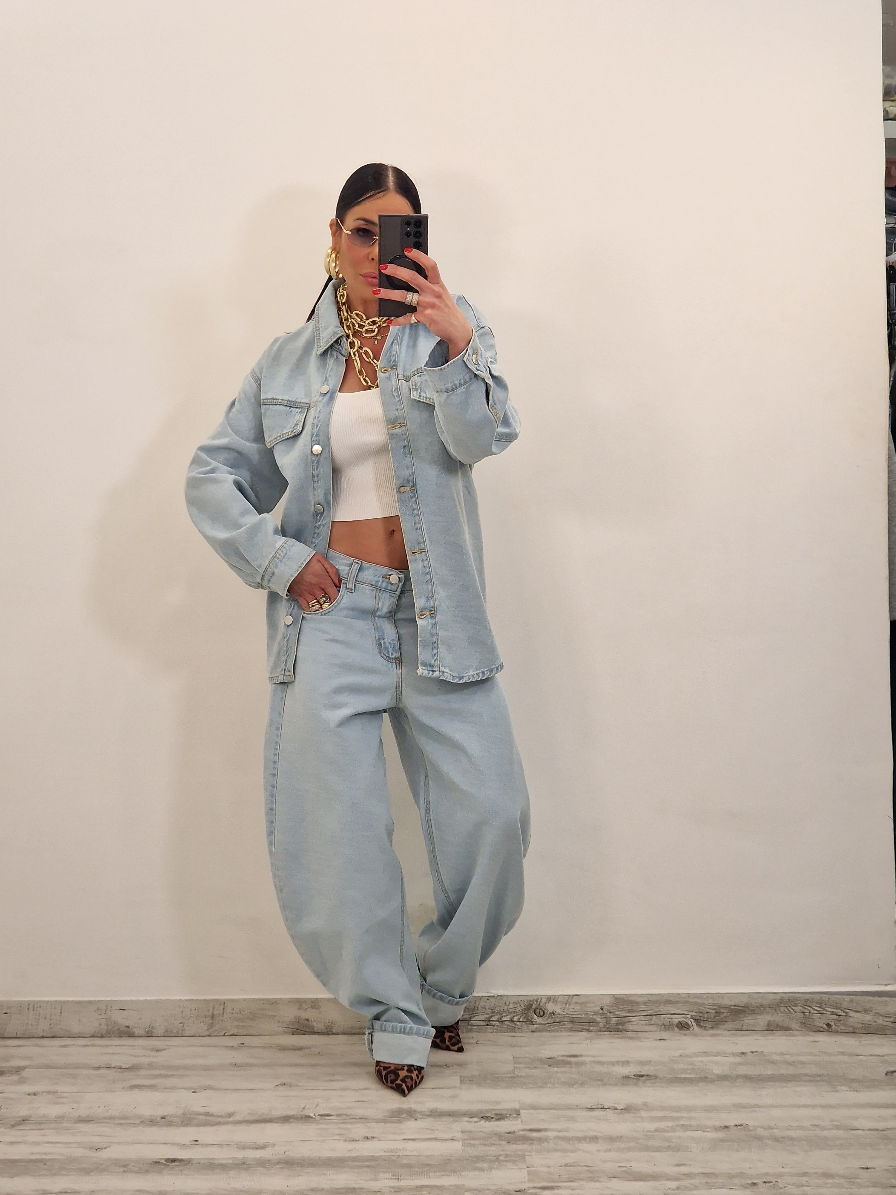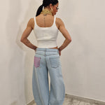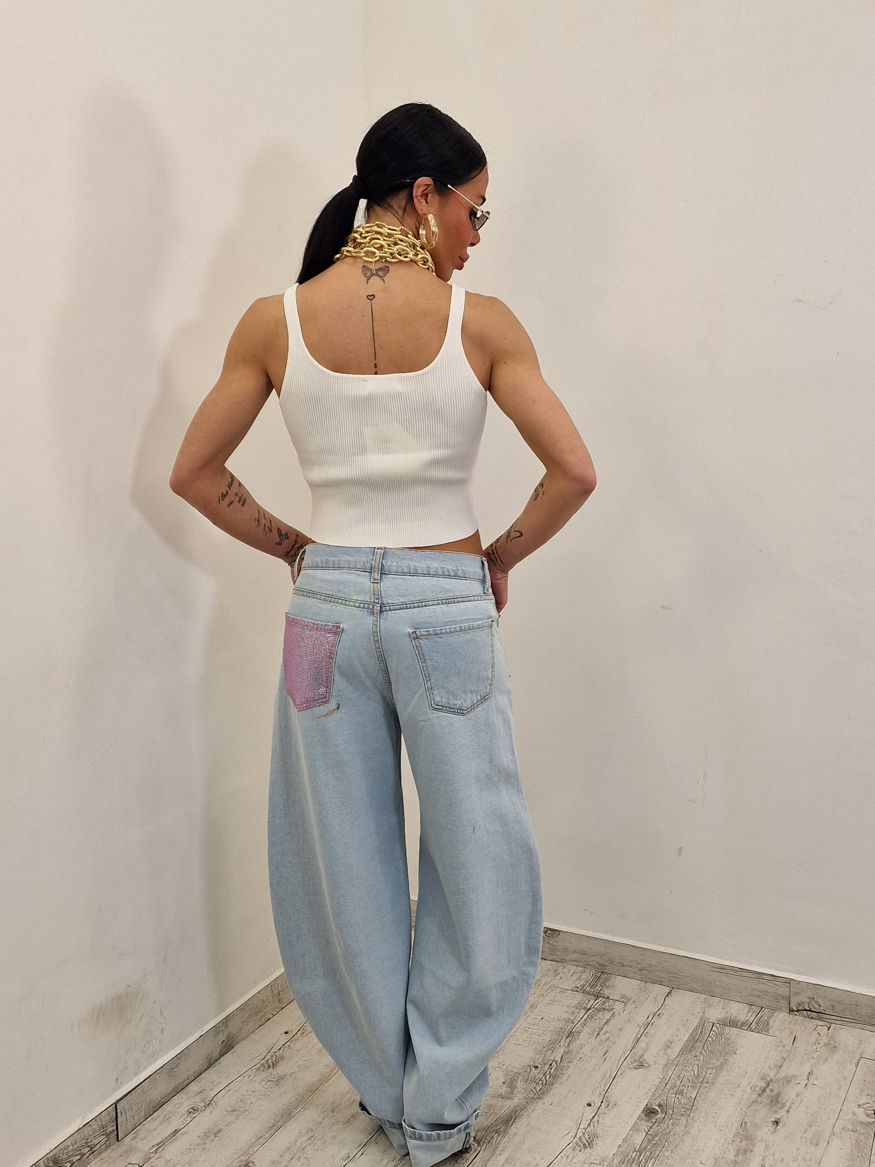 Jeans modello ballon con risvolto con taschino ricoperto di strass