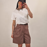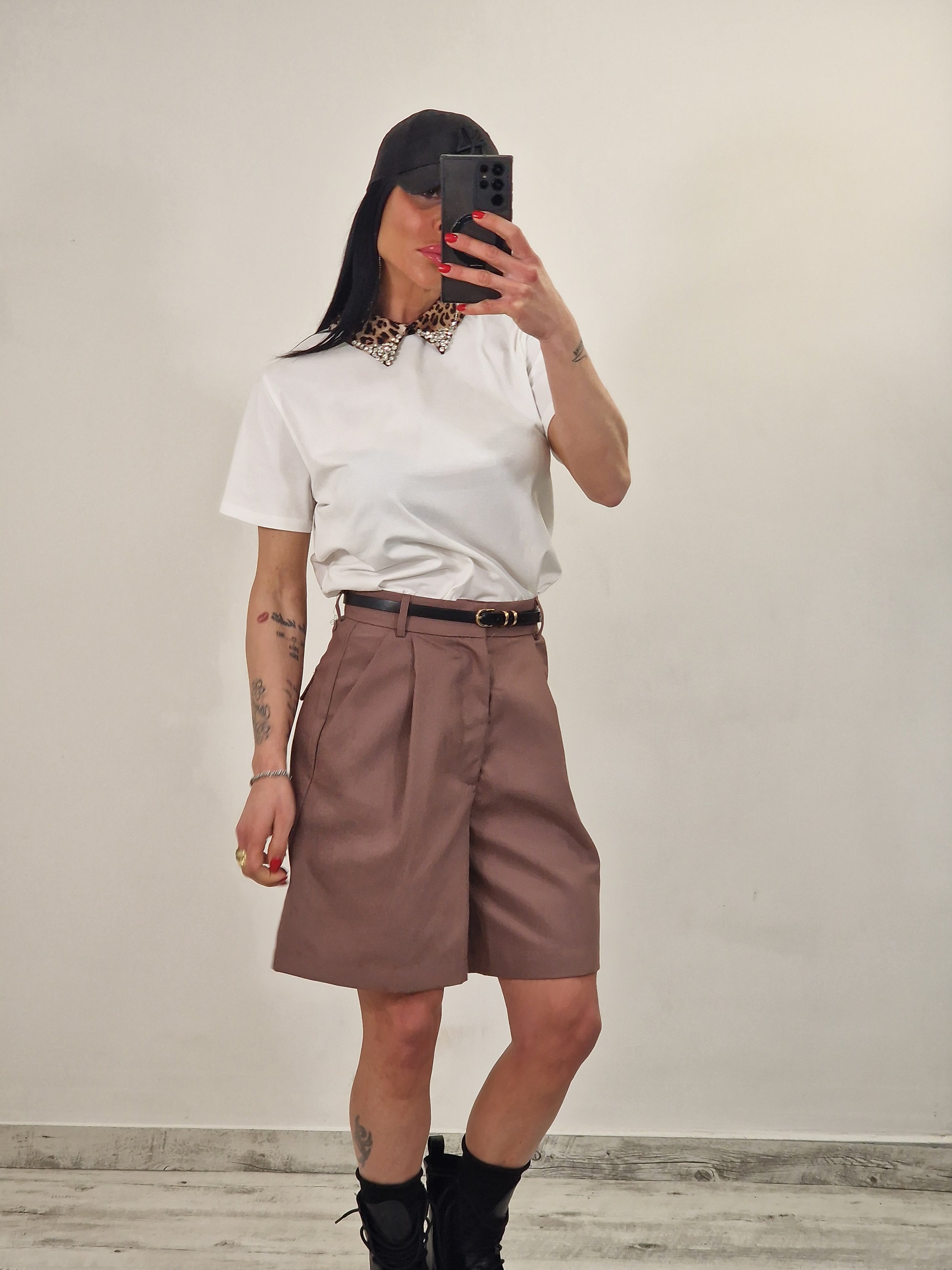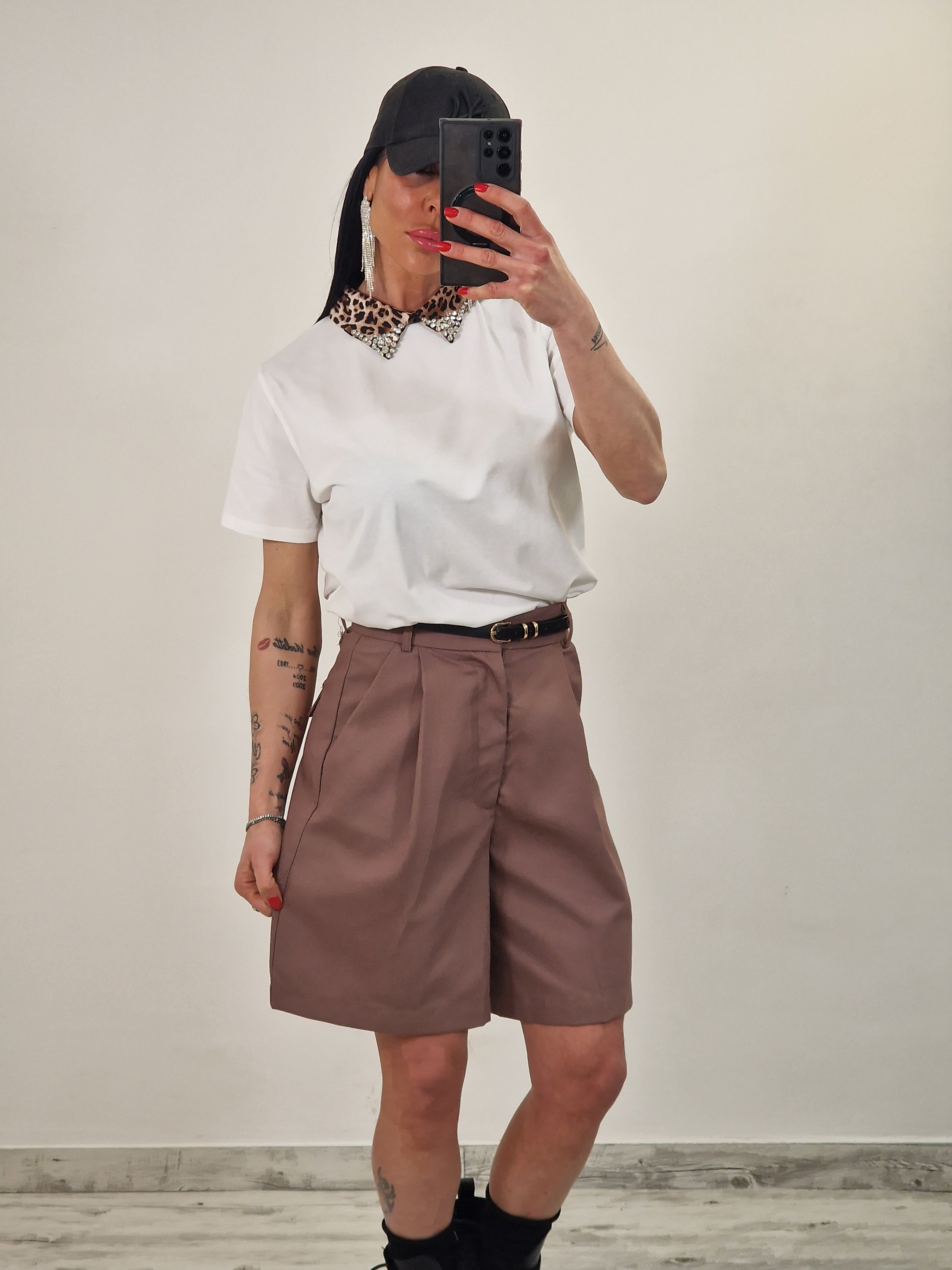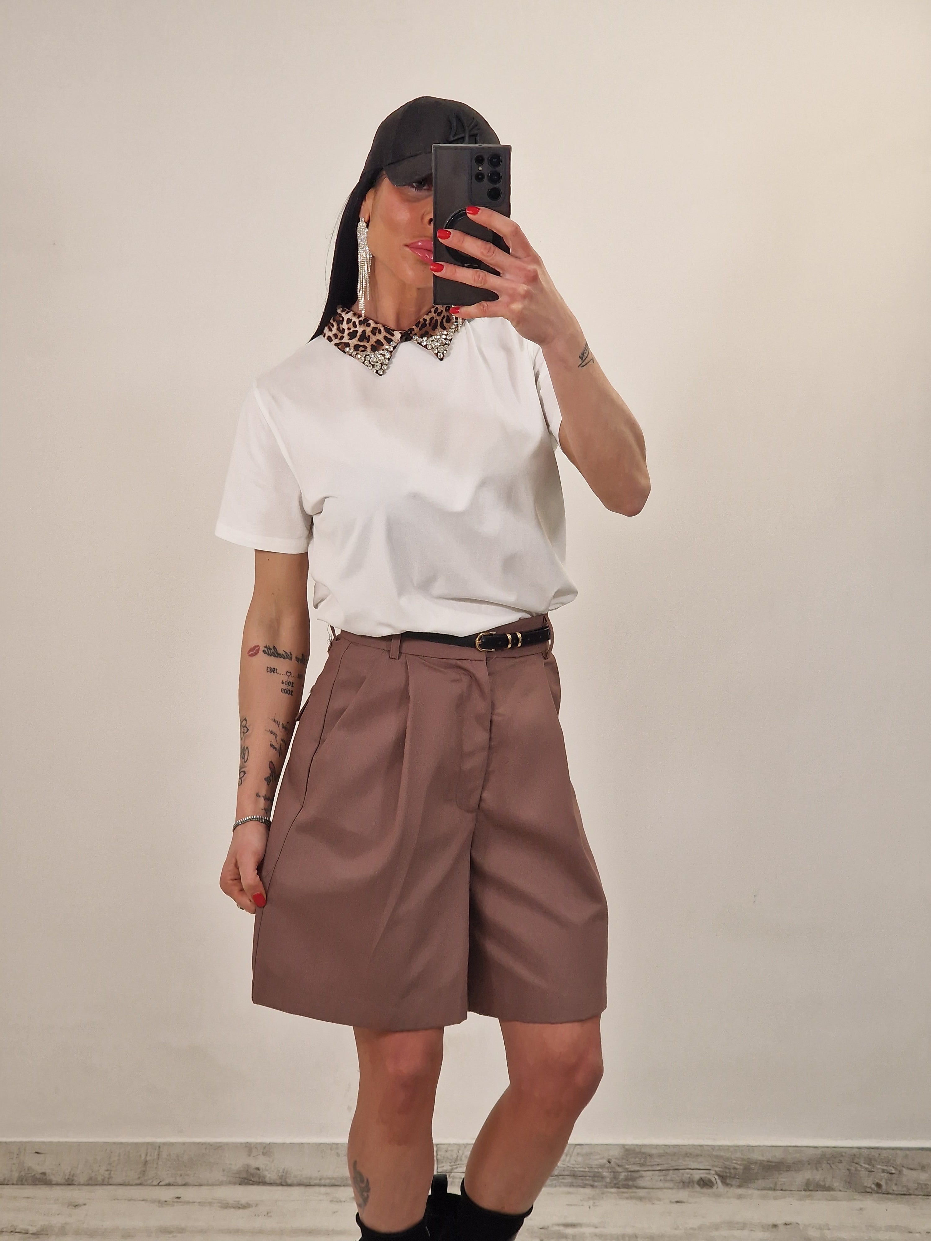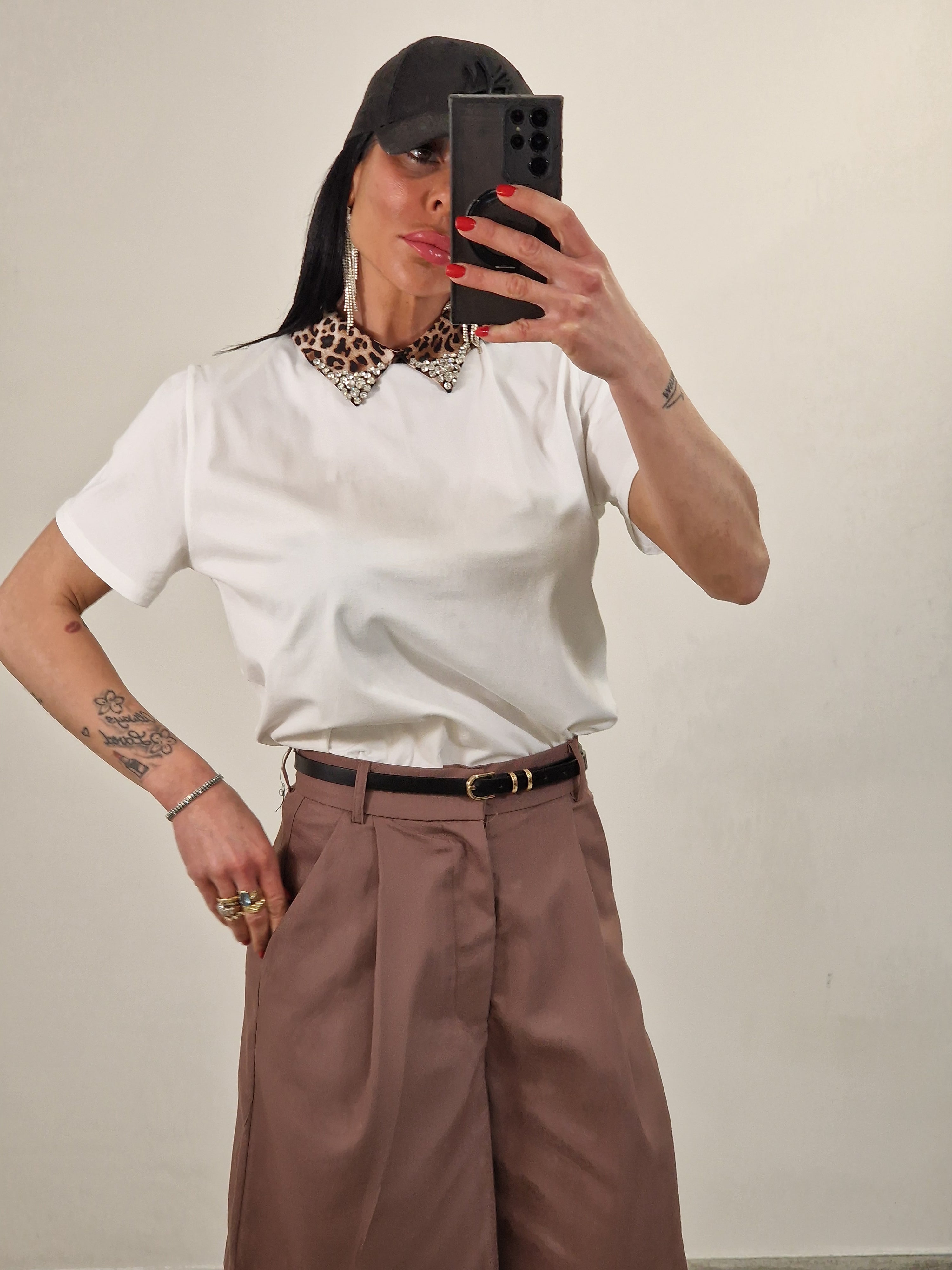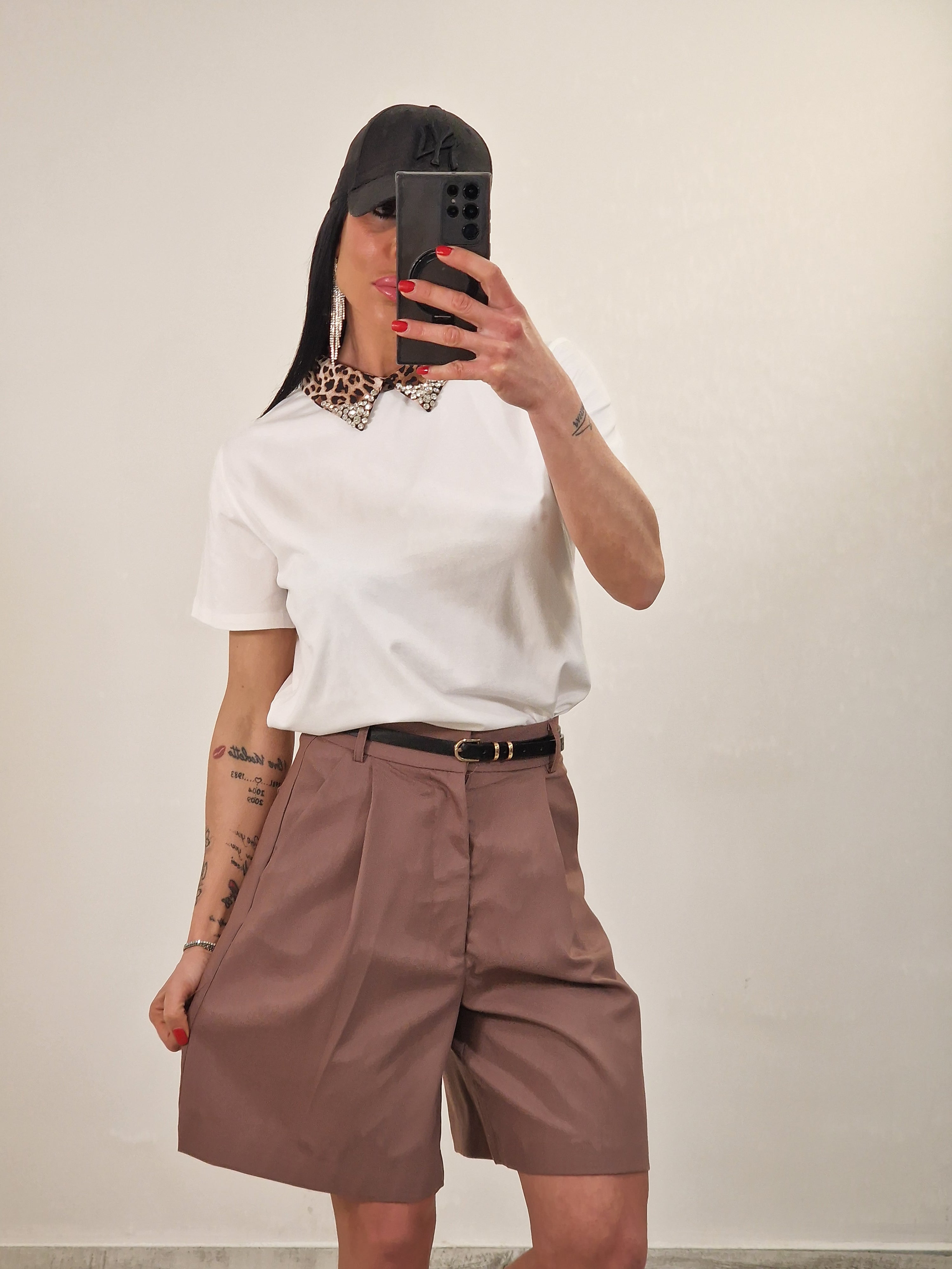 Maglia in cotone elasticizzato con colletto leopardato con strass in punta