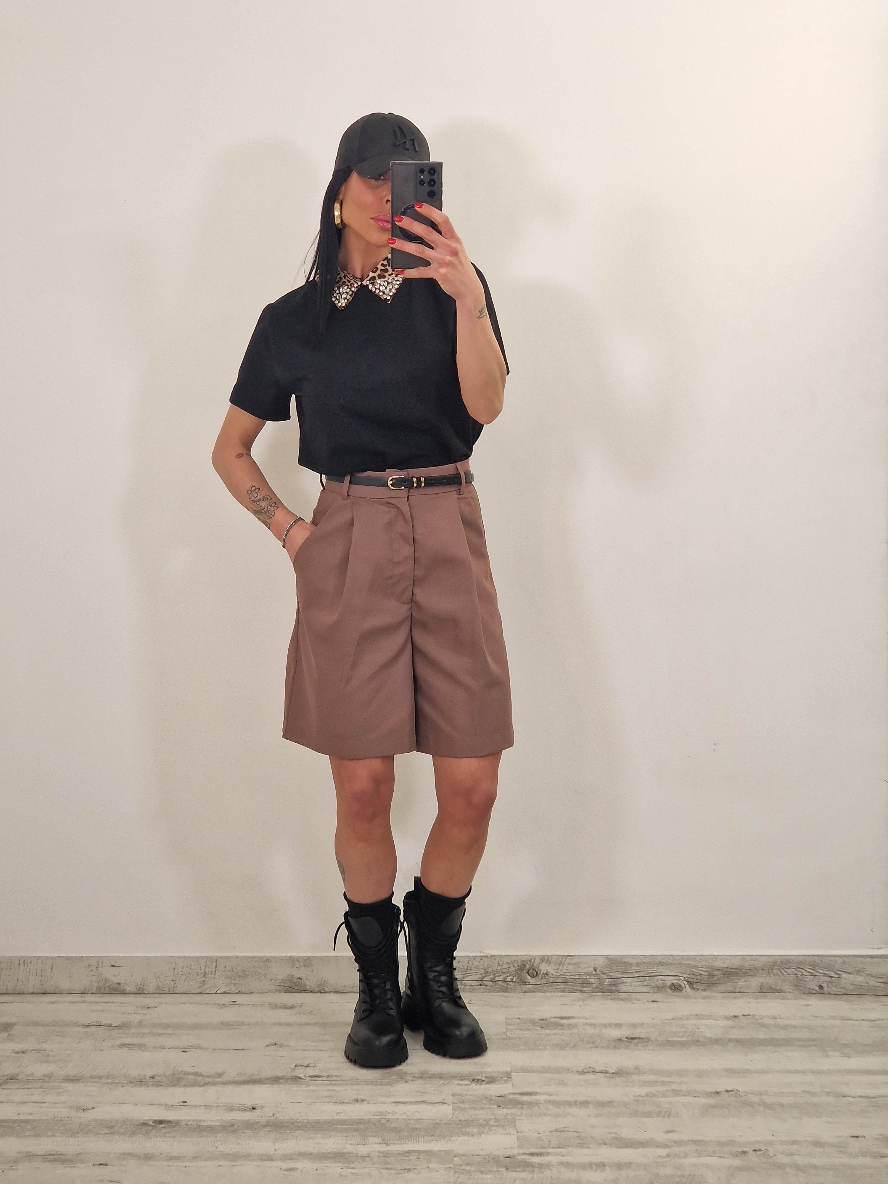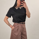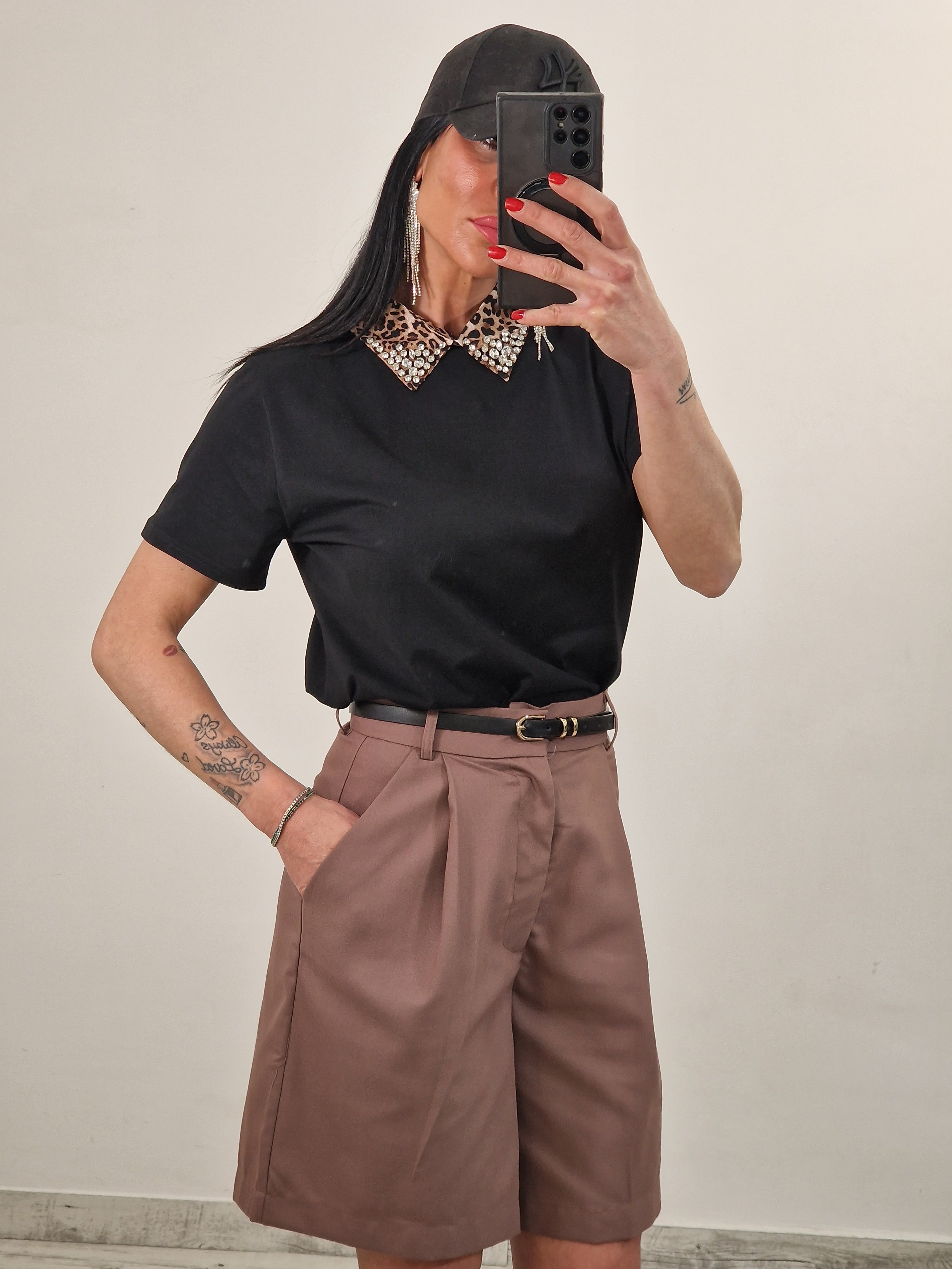 Maglia in cotone elasticizzato con colletto leopardato con strass in punta
