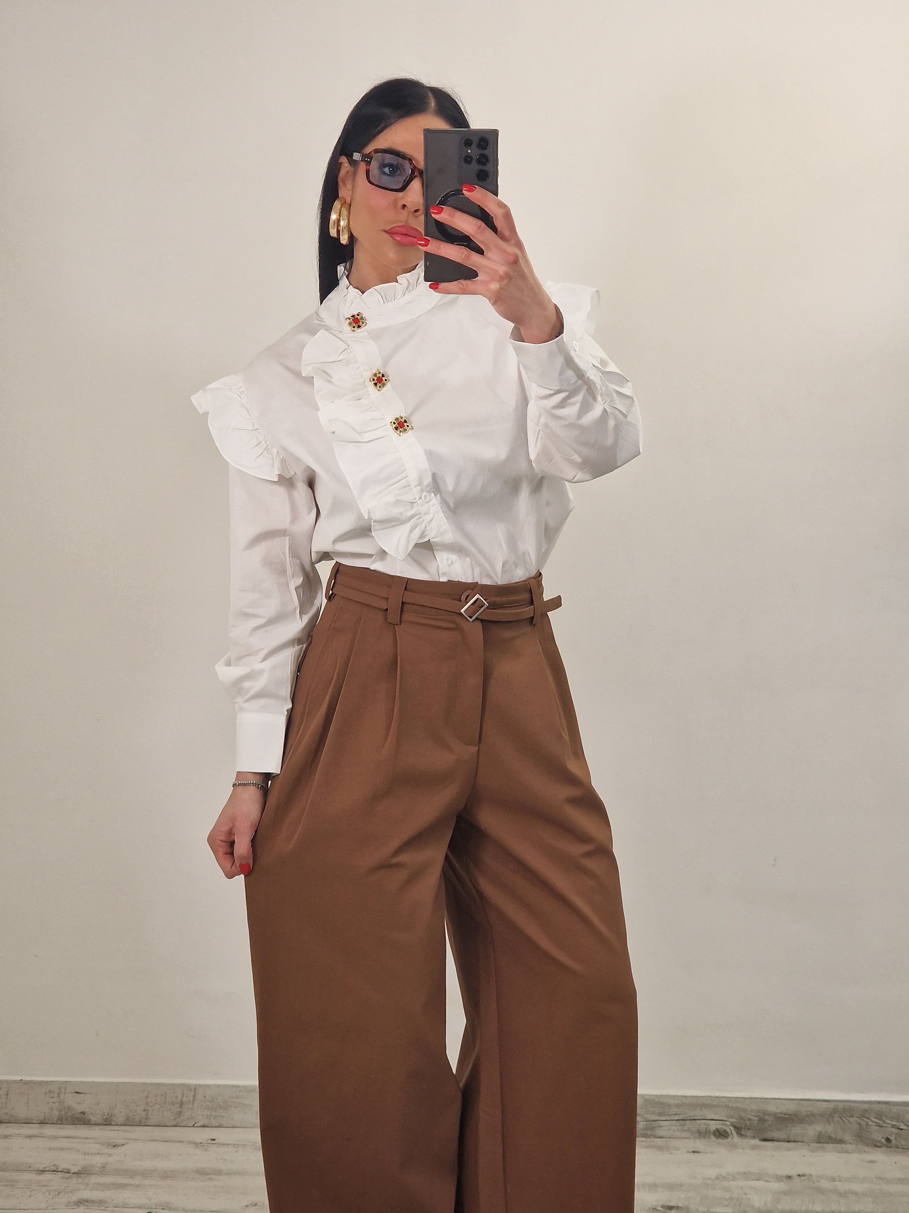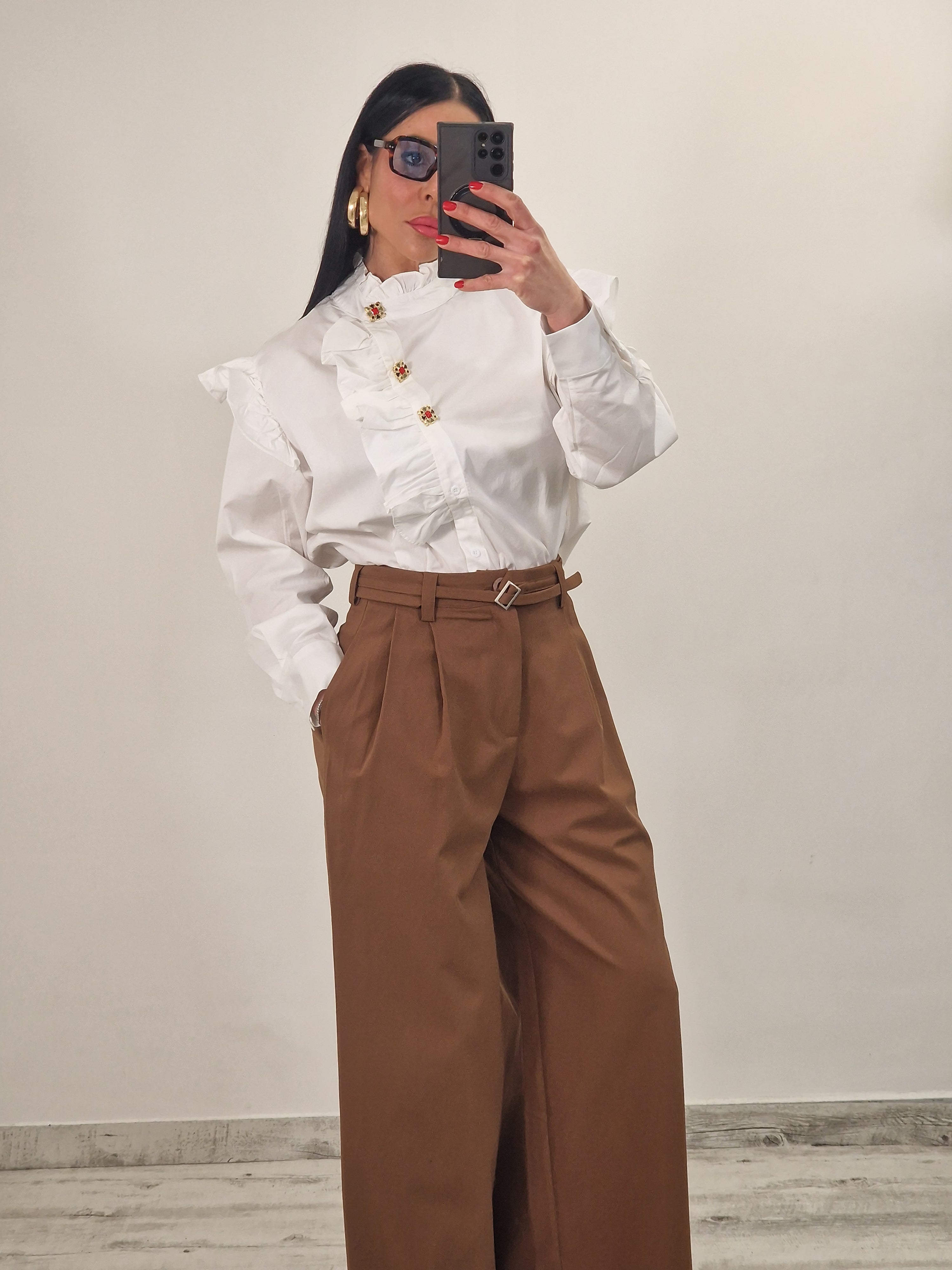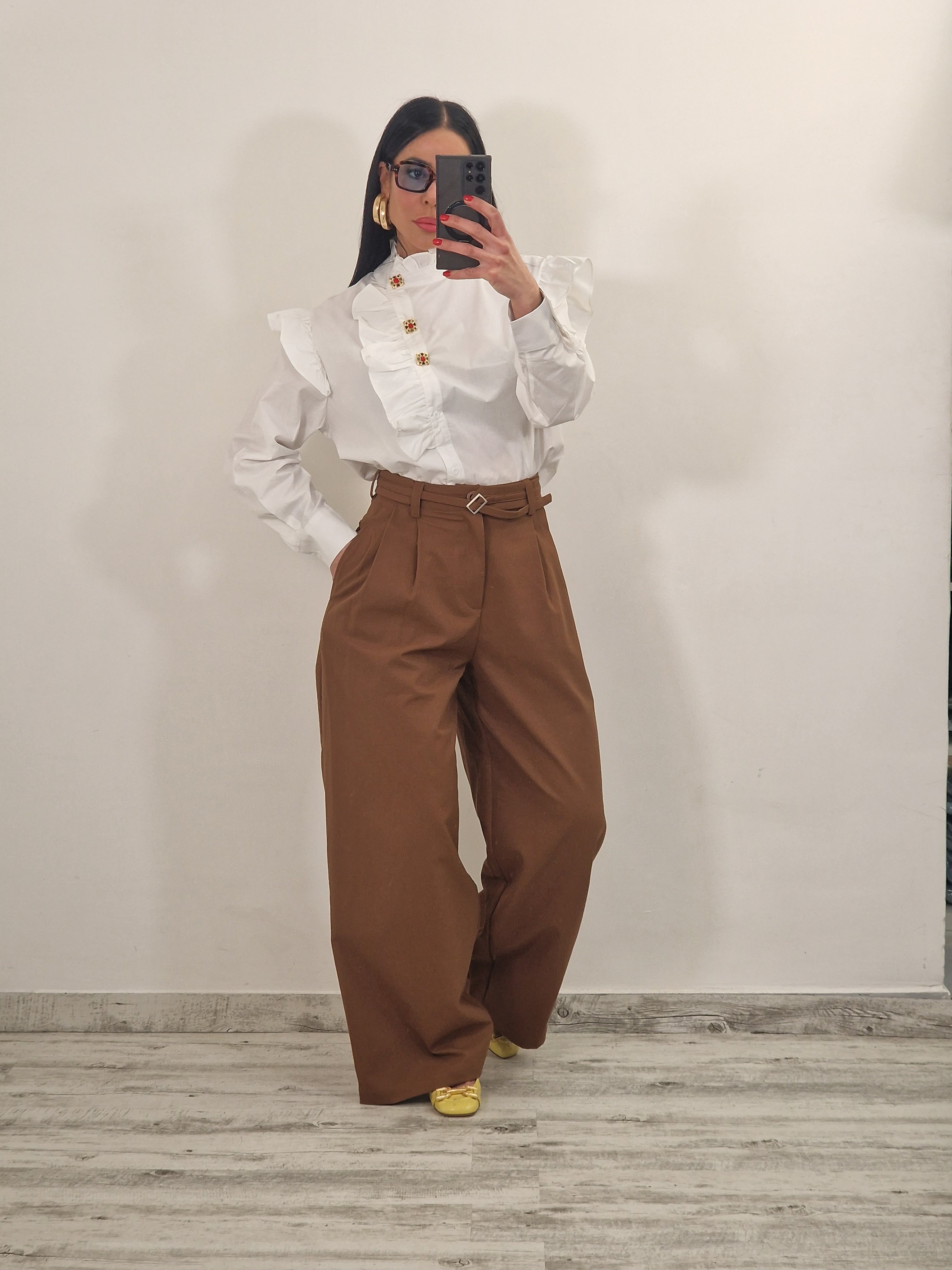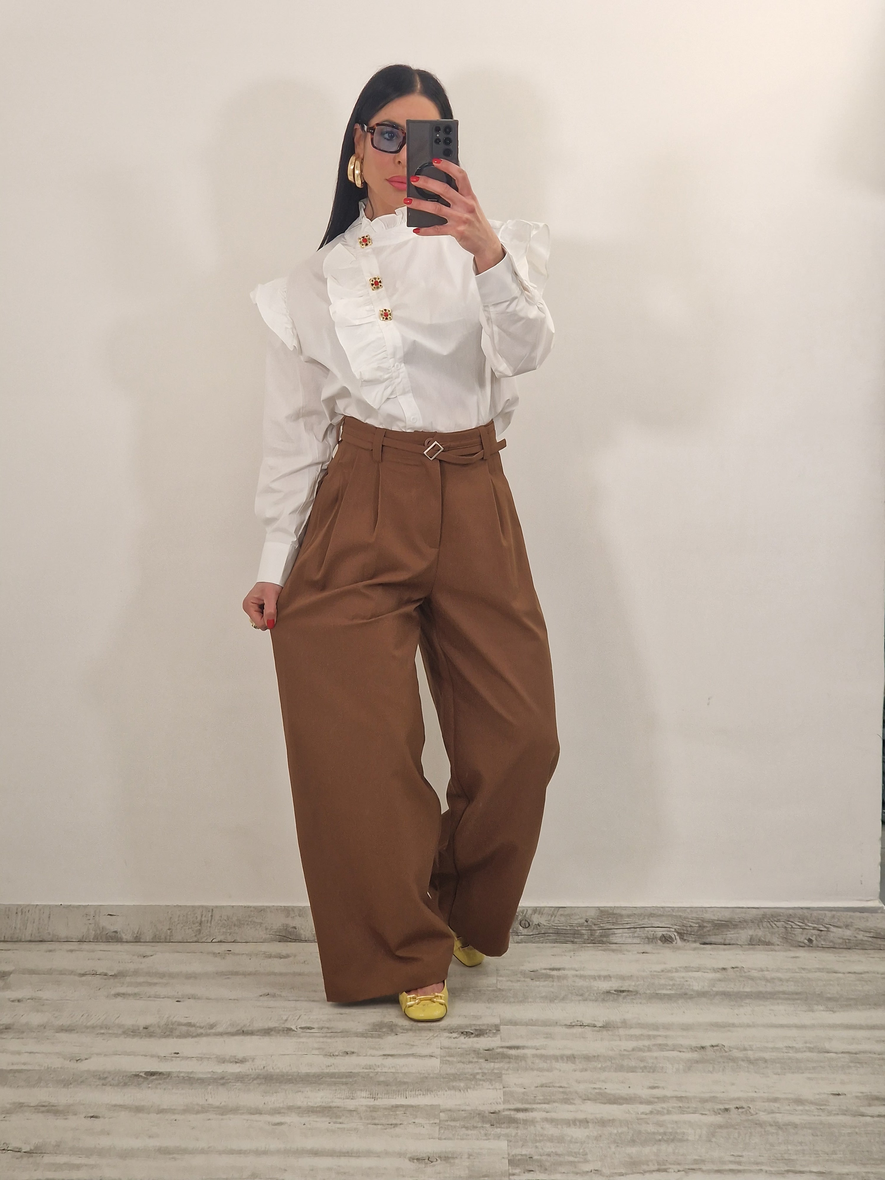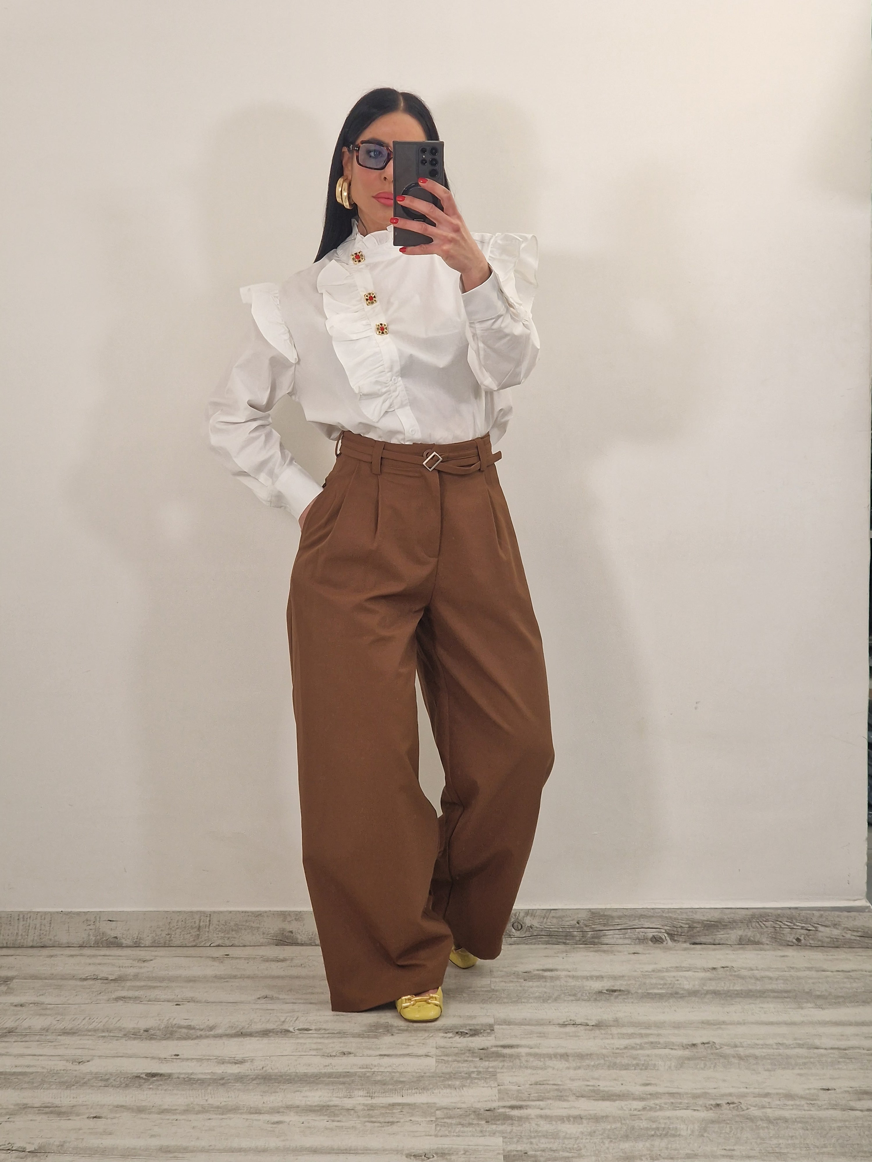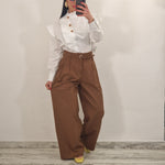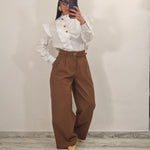 Pantalone palazzo in cotone elasticizzato con pence e cintura