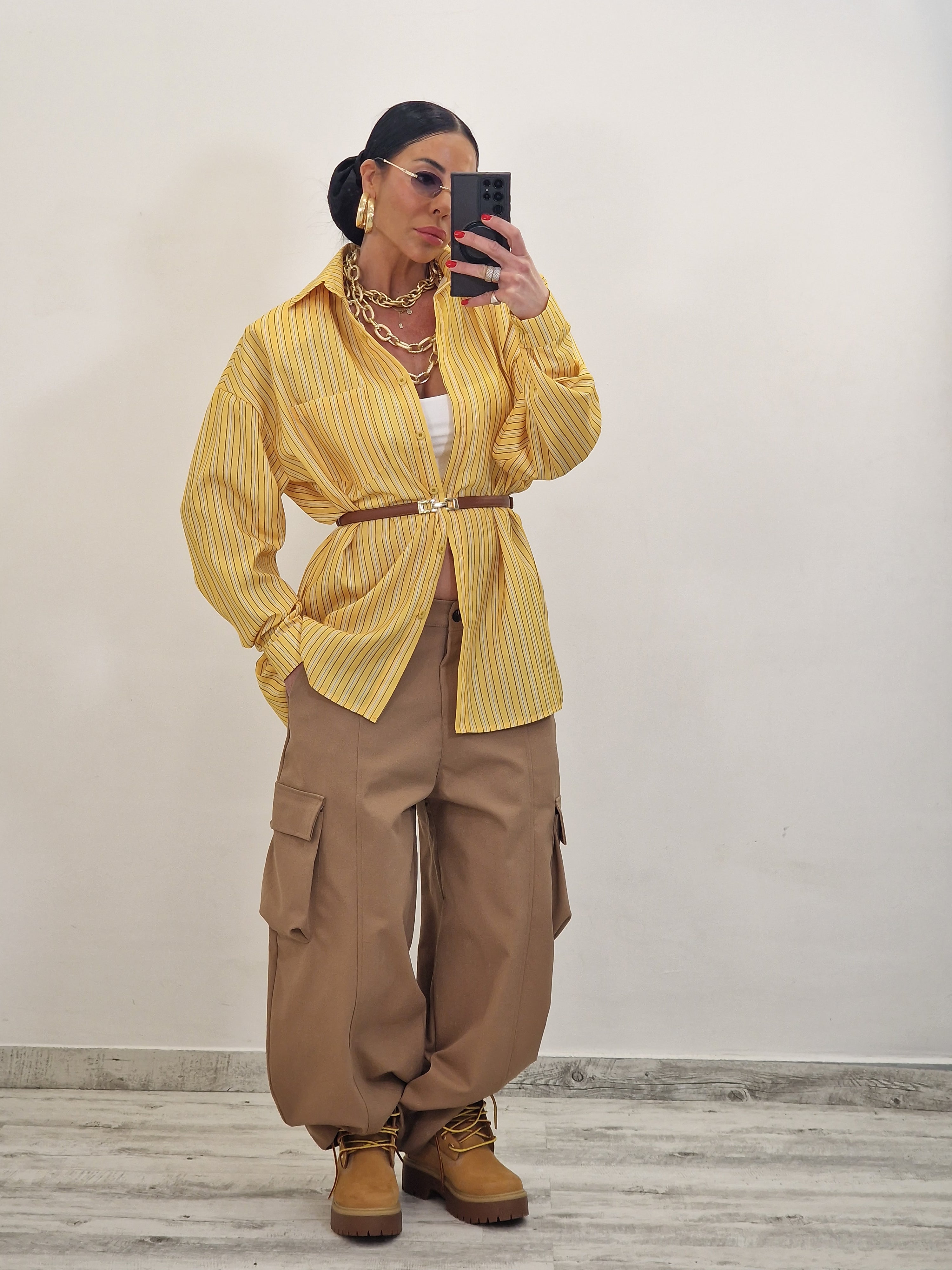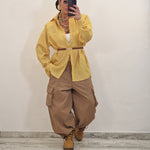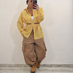 Pantalone modello balloon cargo con bottone in avanti e elastico.