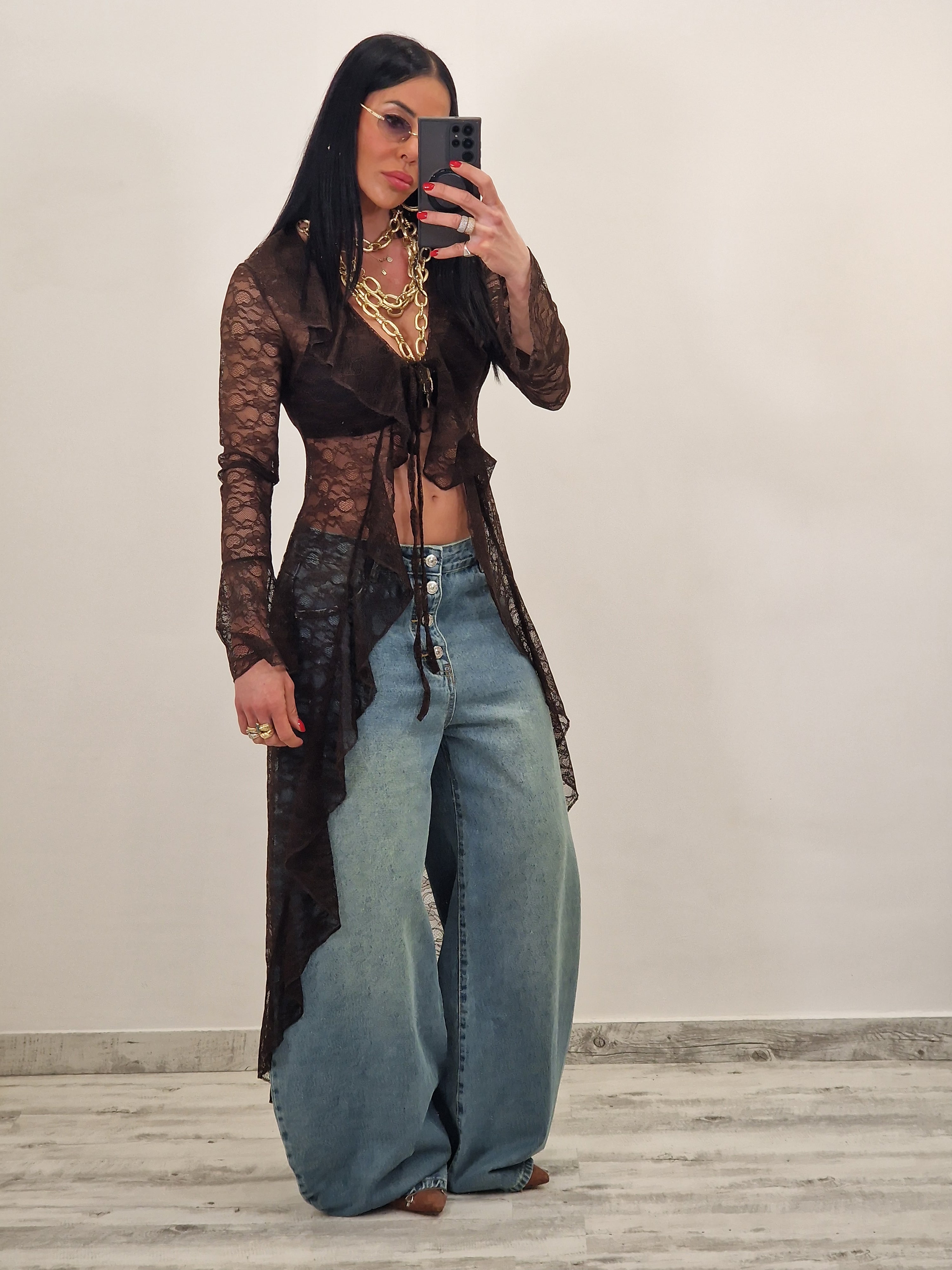 Spolverino lungo in pizzo con laccetto al centro per allacciare
