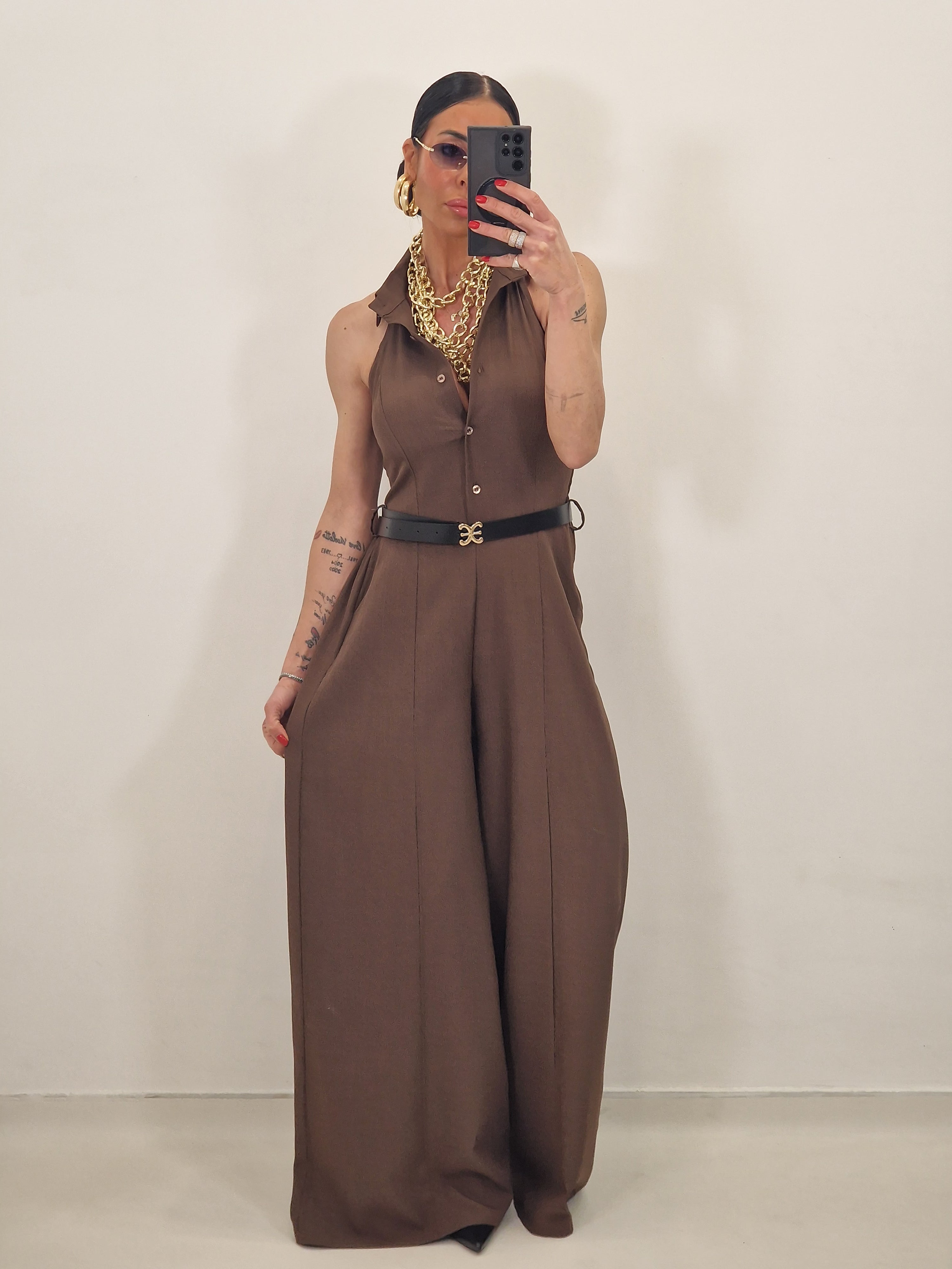 Tuta intera con camicia colla all'americana, pantalone gamba lunga con cintura